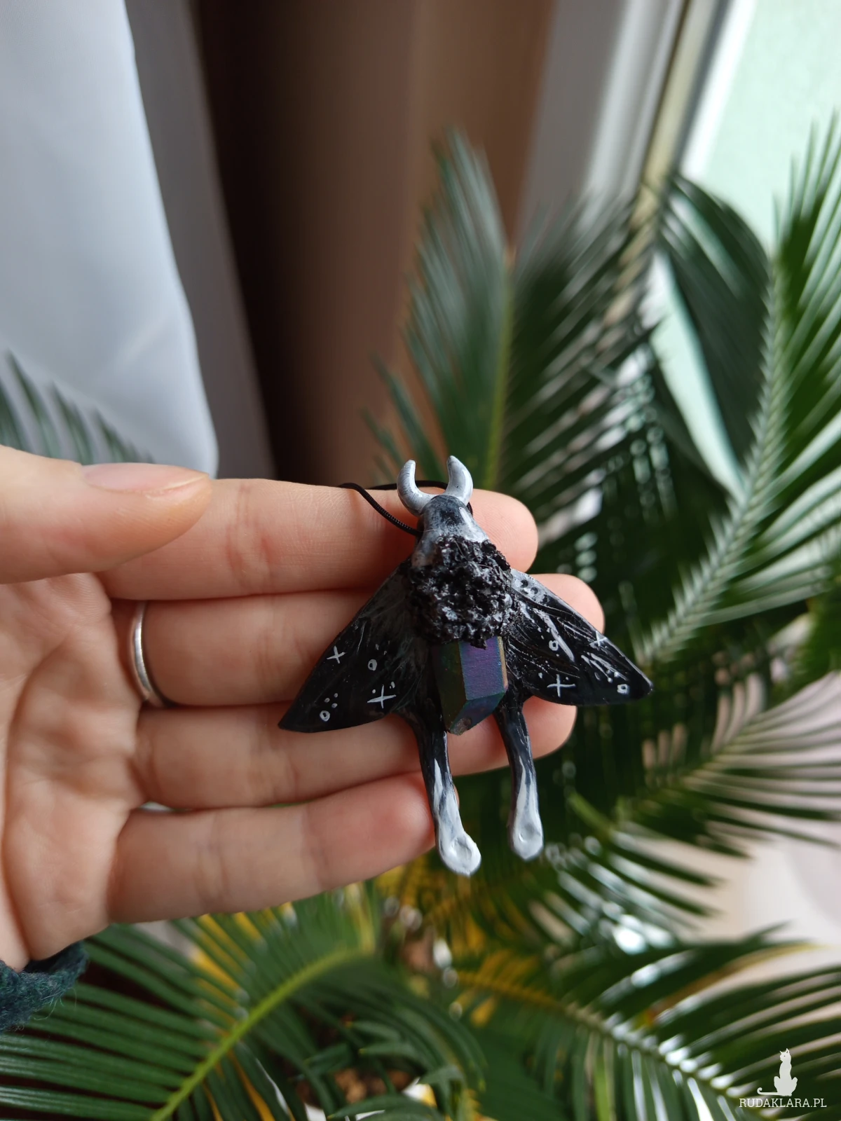 Ten tajemniczy naszyjnik z motywem ćmy zachwyca mroczną elegancją i magicznym blaskiem kamienia. Rzeźba została ręcznie wykonana z glinki polimerowej i utrzymana w głębokiej, czarnej kolorystyce, podkreślającej nocny, mistyczny charakter motywu.