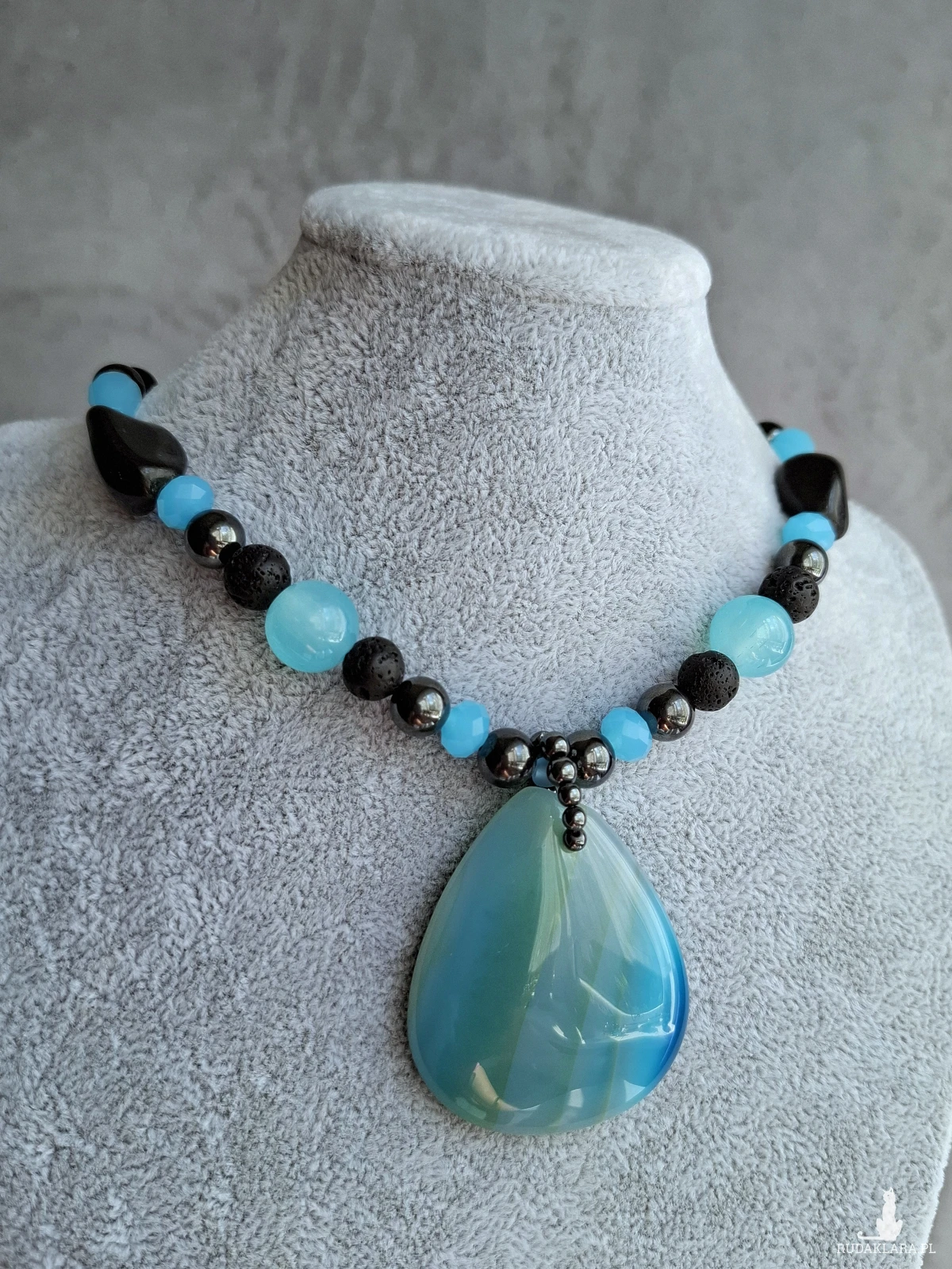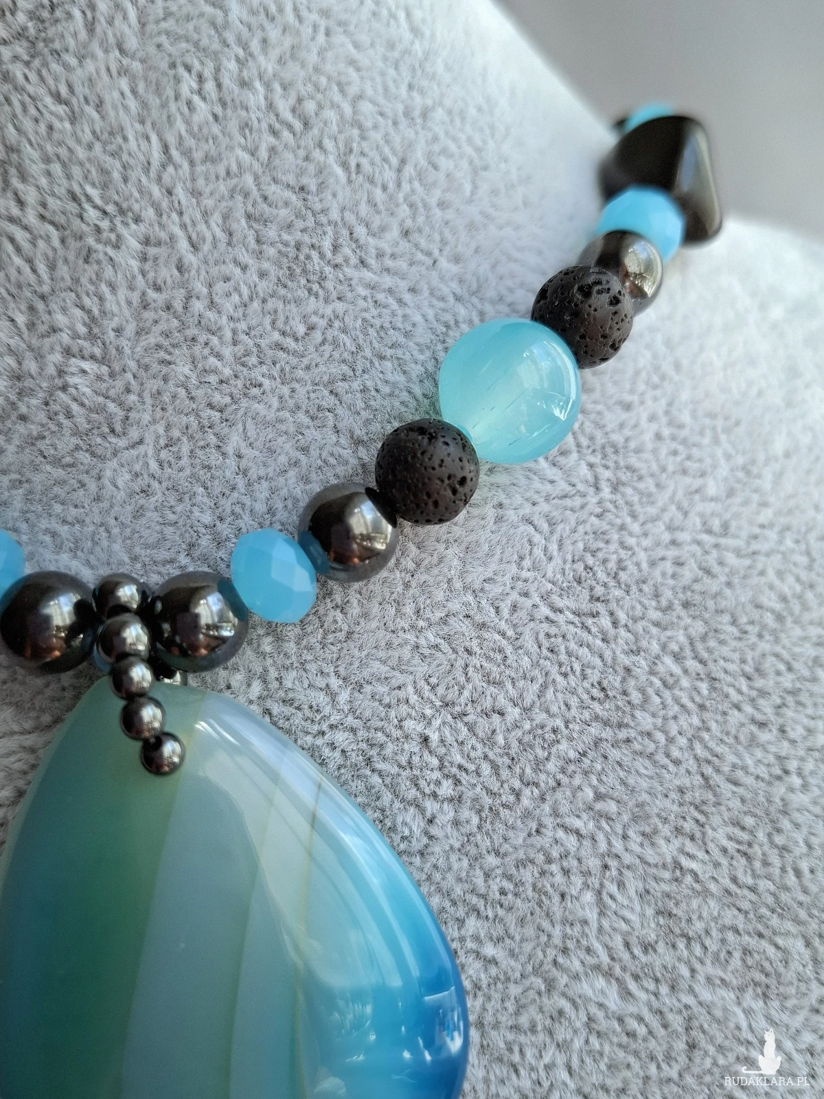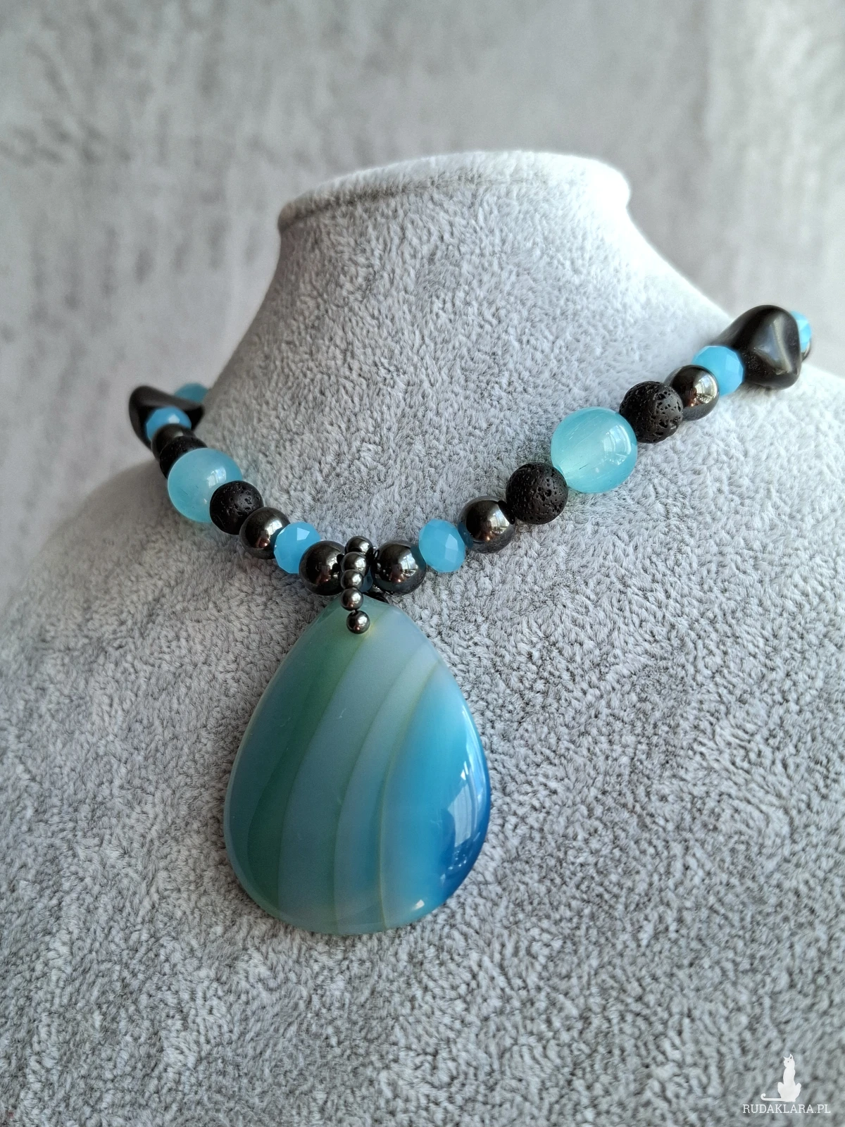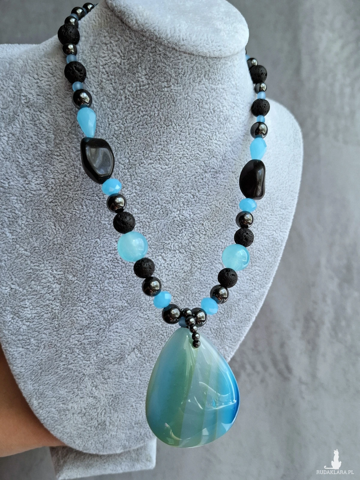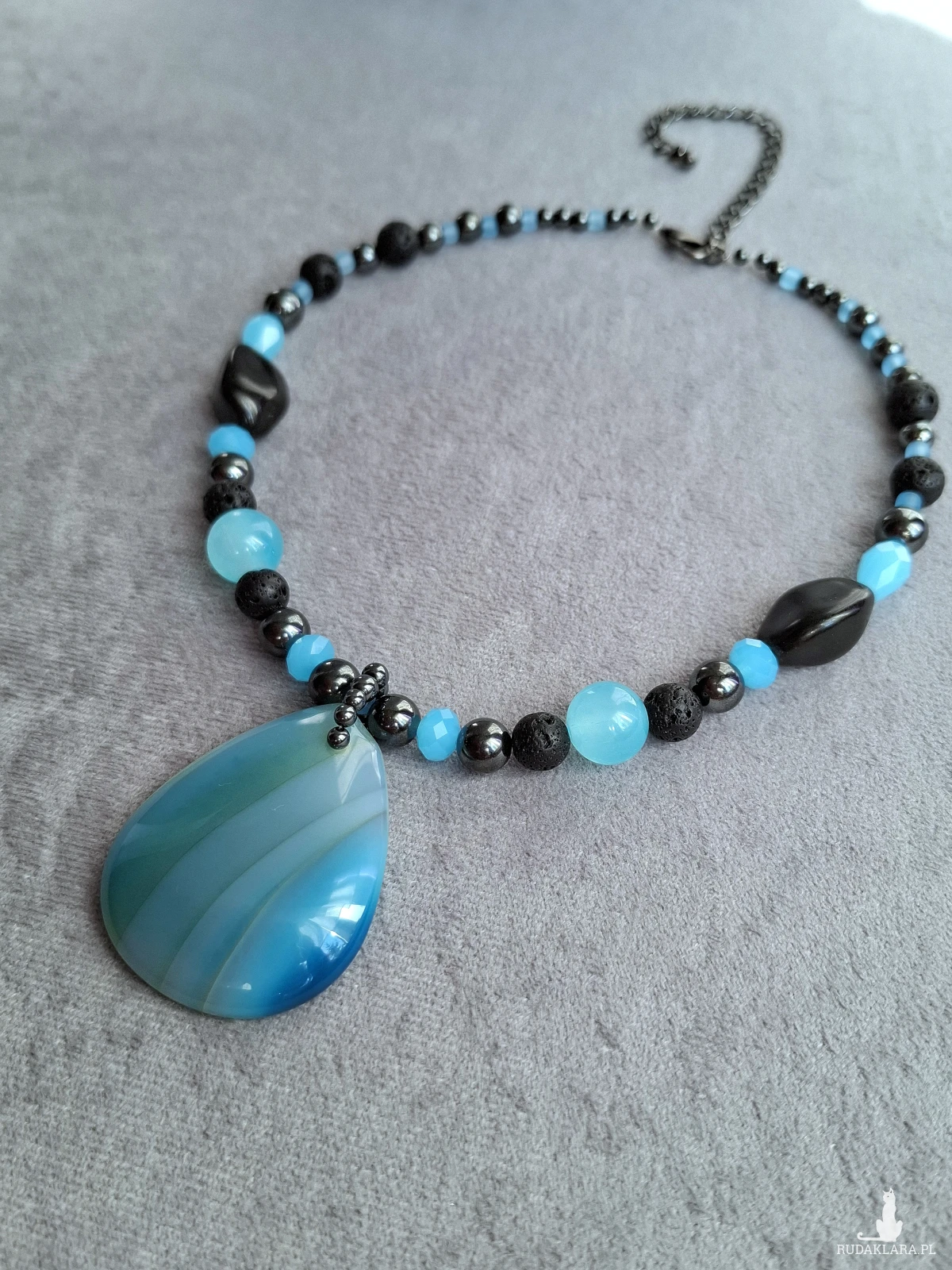Krotki naszyjnik, kolia z dużym, pięknym agatem. Całość utrzymana w błękitach i czerni. Poza dużym wisiorem z agatu naszyjnik został skomponowany z drobniejszych agatów, lawy wulkanicznej, hematytu i szkła. Długość regulowana jest łańcuszkiem i wynosi od 38 do 48 cm.