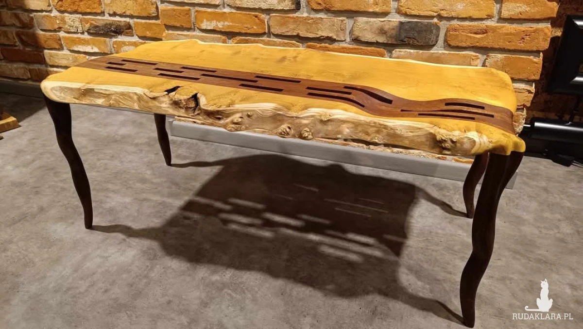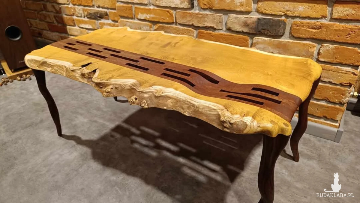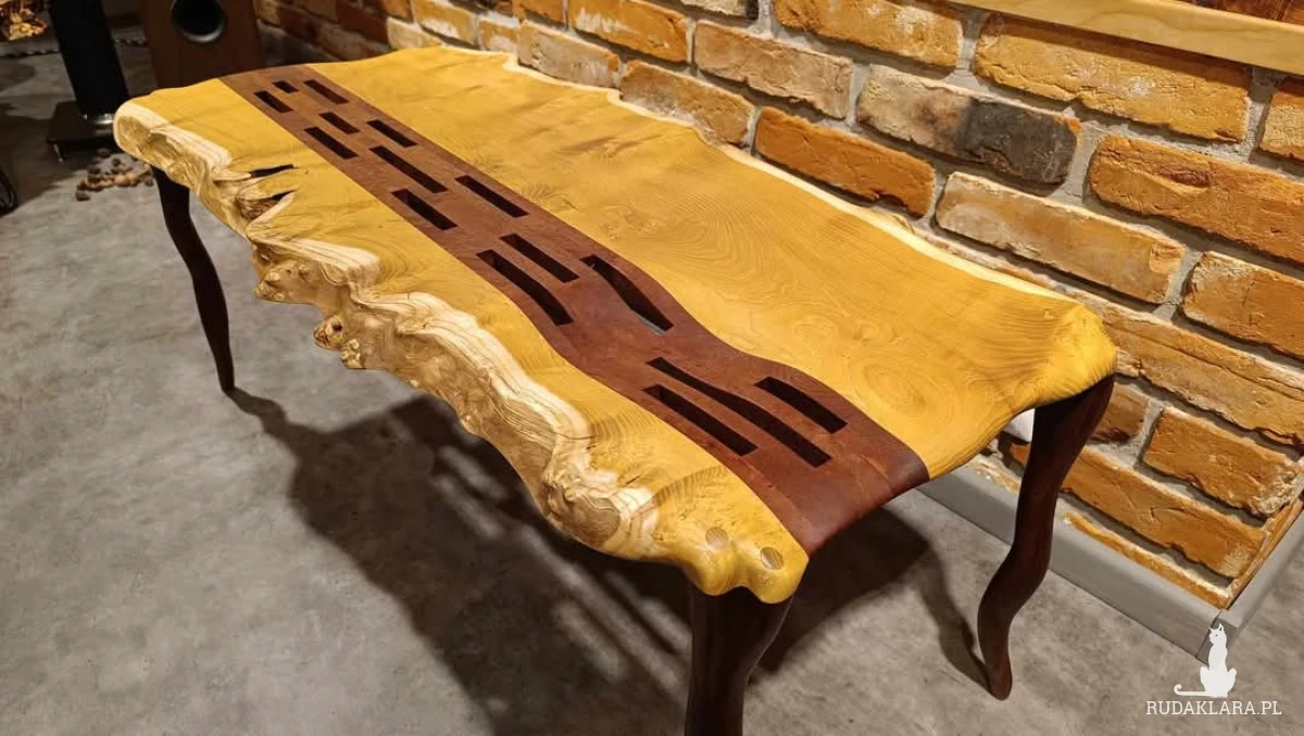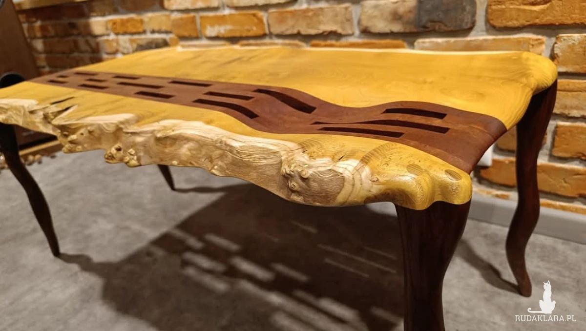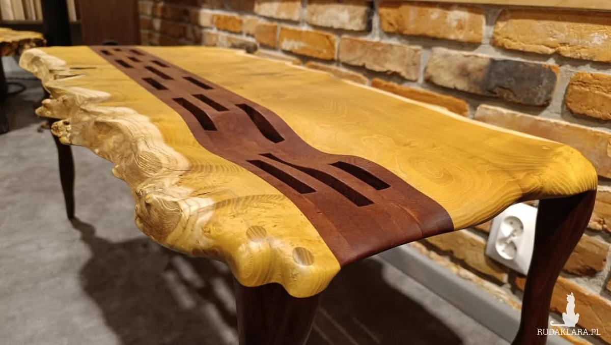 Blat to połączenie morwy białej (z elementami czeczoty) i mahoniu. Piękna złoto-żółta barwa morwy i brąz mahoniu świetnie się ze sobą komponuje.