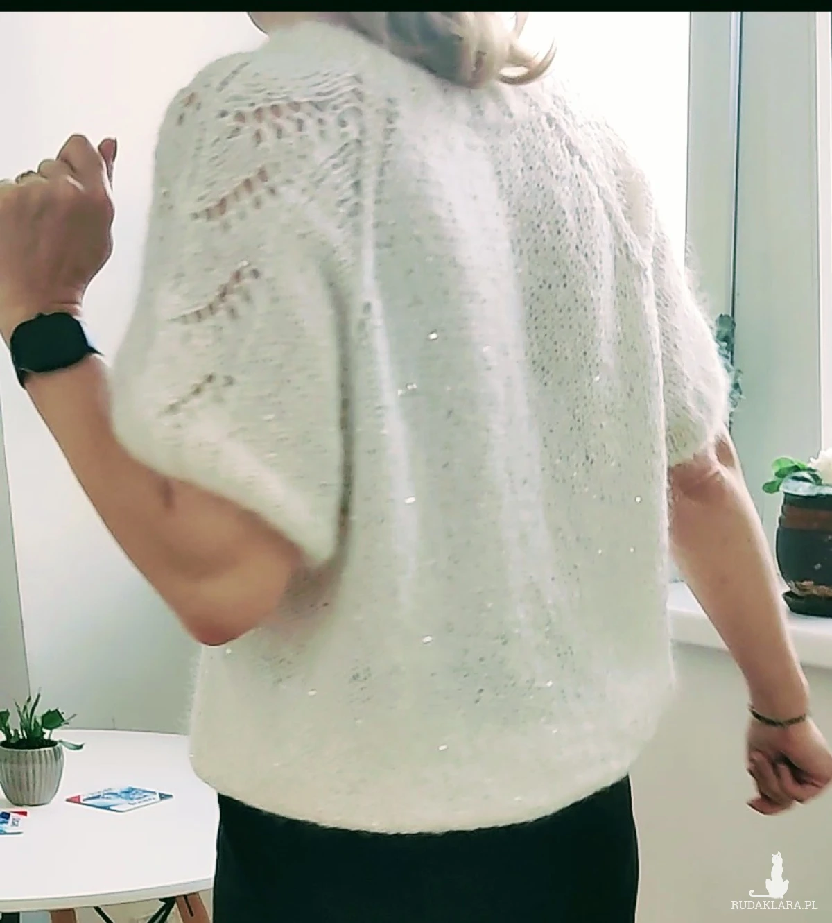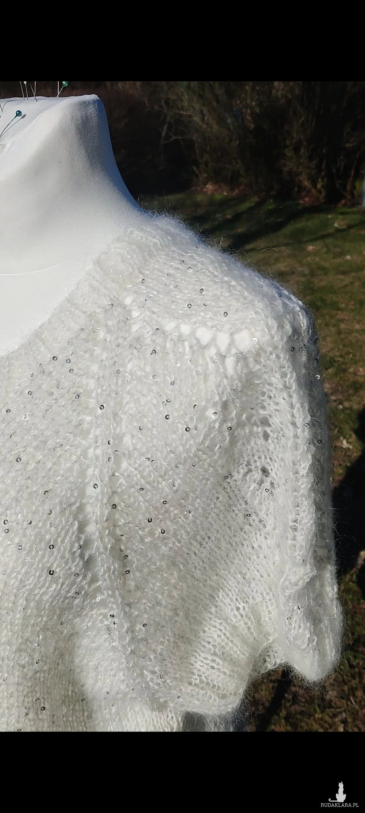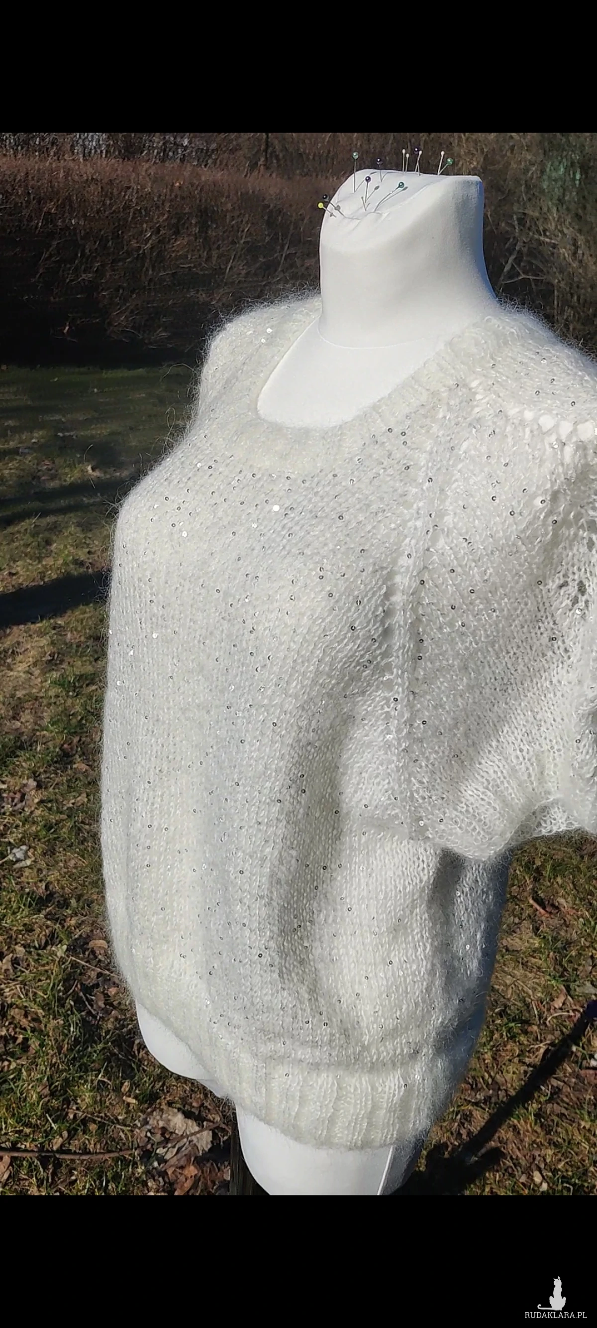 Sweterek ażurowy ręcznie zrobiony z naturalnych włókien z delikatnym błyskiem w kolorze złamanej bieli