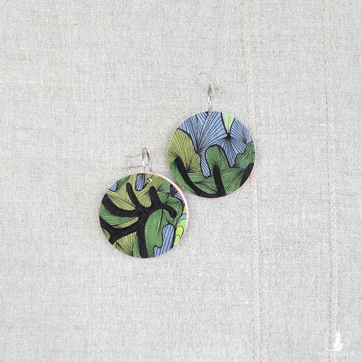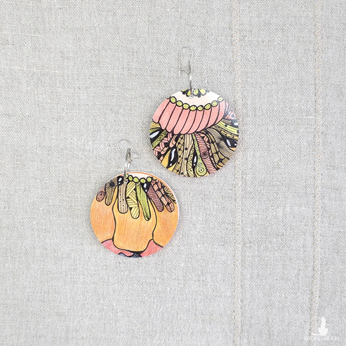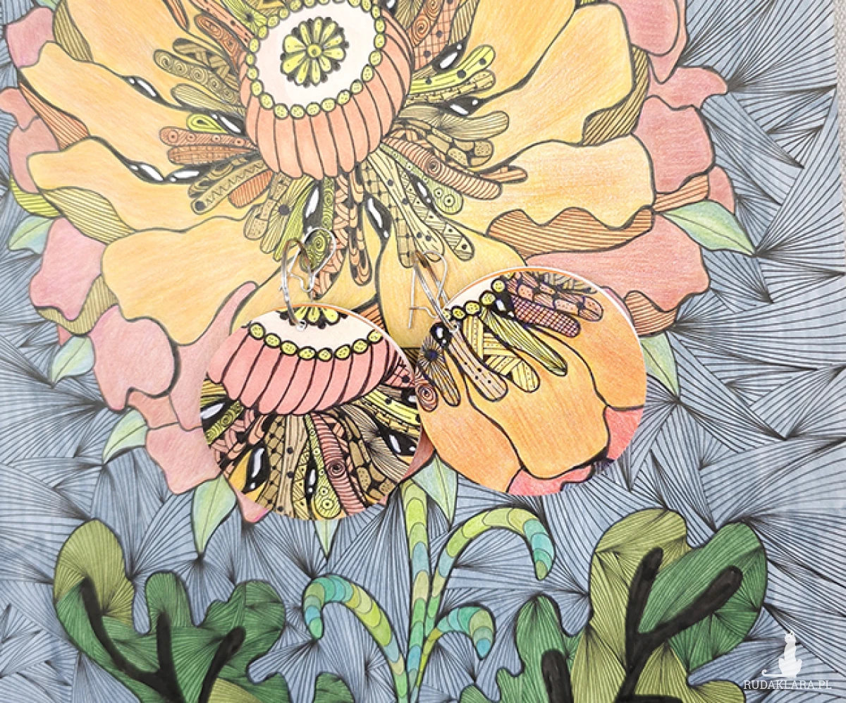 Kolczyki wykonane z drewnianej bazy oraz części mojego autorskiego rysunku "Chryzantema".