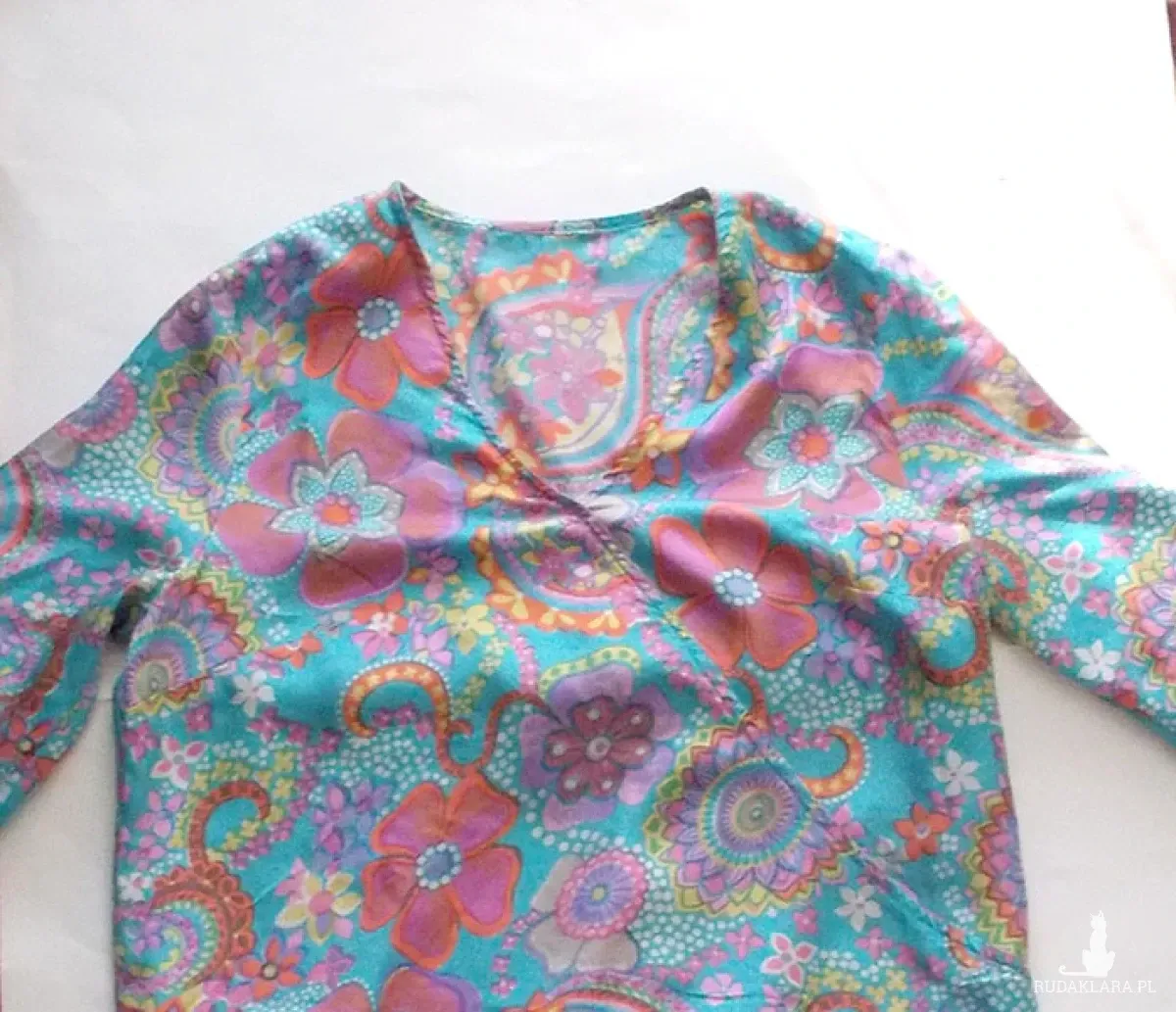 Nowa, oryginalna i kolorowa, bluzka w stylu boho. Bluzeczka z długim rękawem uszyta z kuponu naturalnego jedwabiu. Wymiary na płasko:
