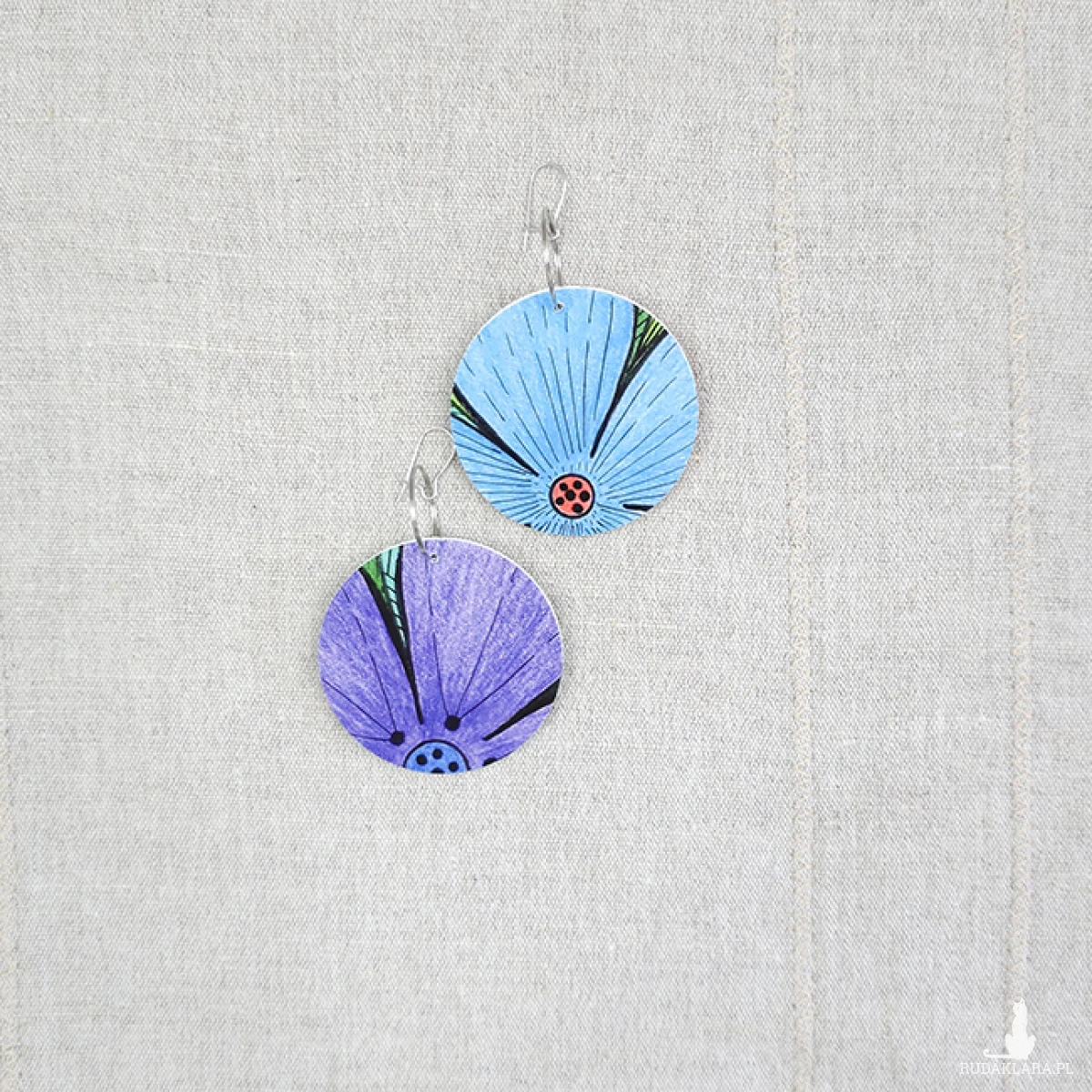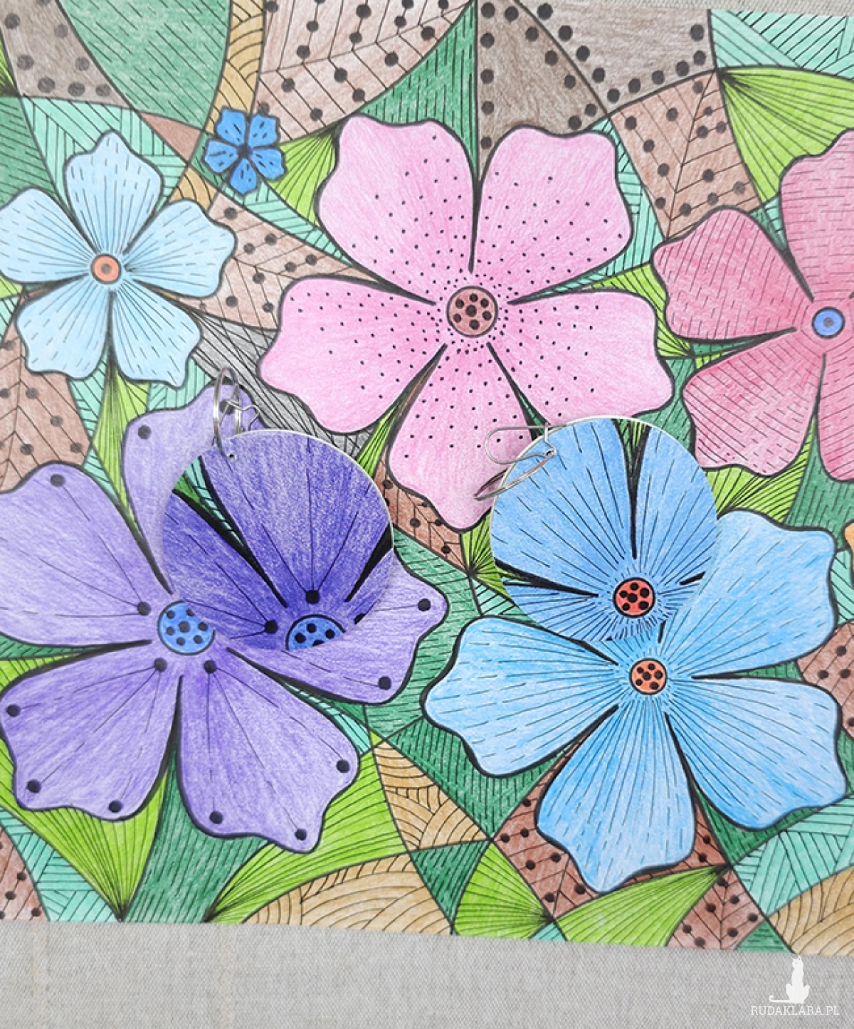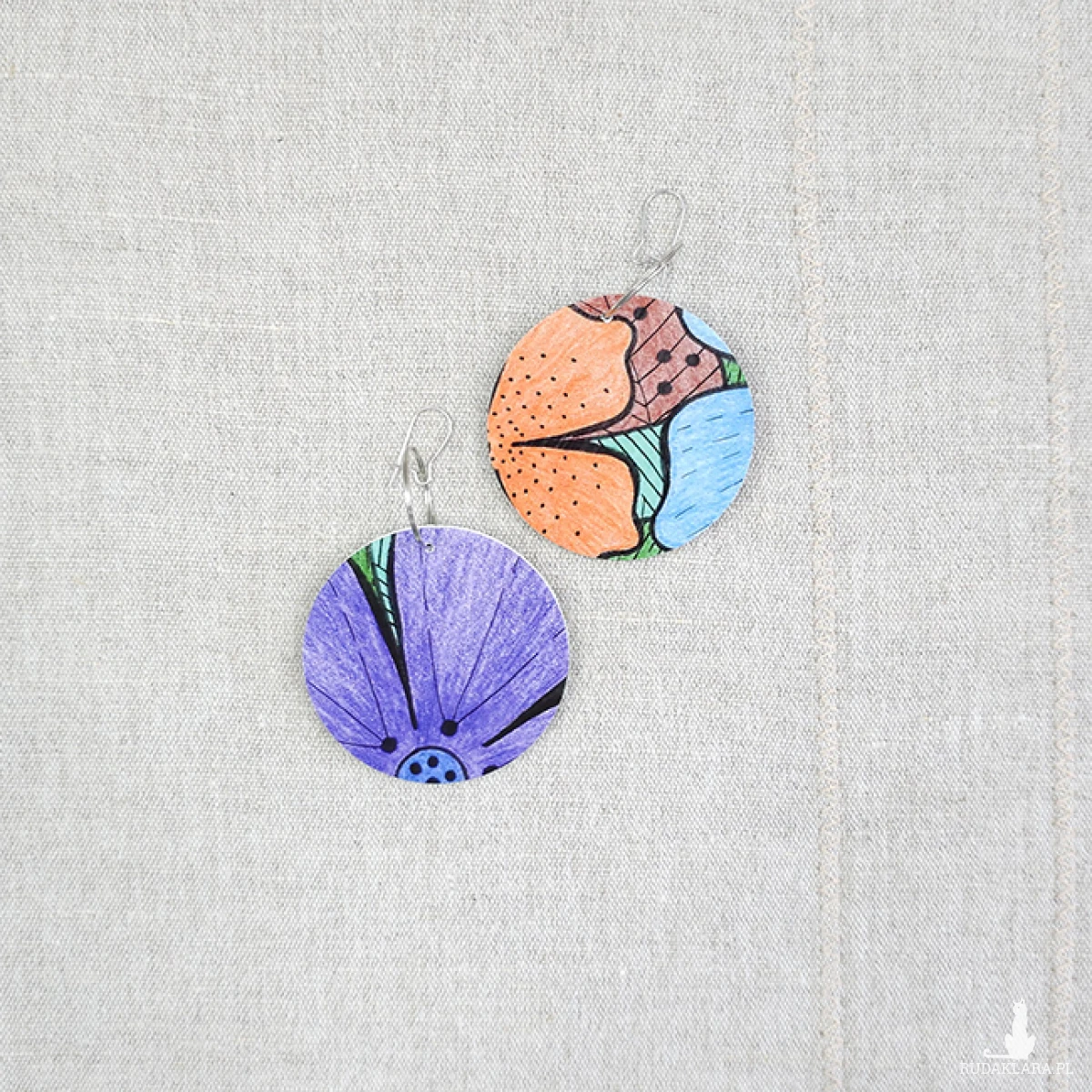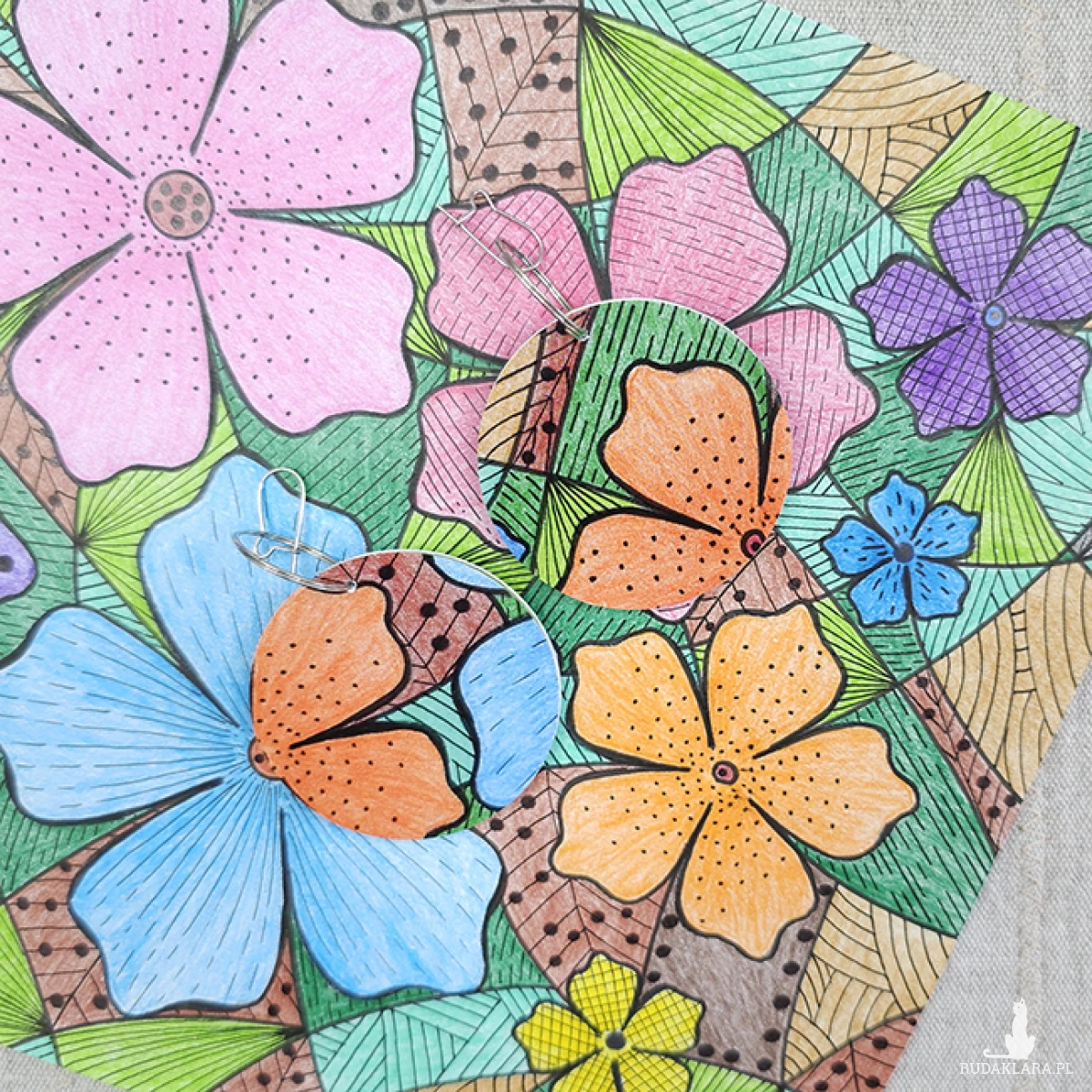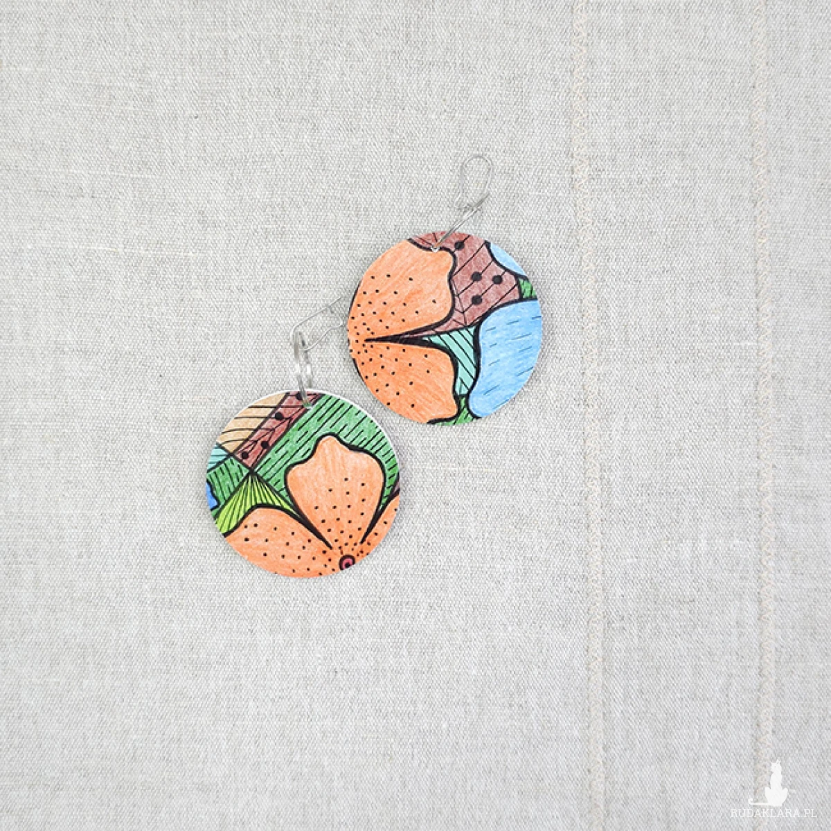 Kolczyki wykonane z drewnianej bazy oraz części mojego autorskiego rysunku "Kolorowe kwiaty".