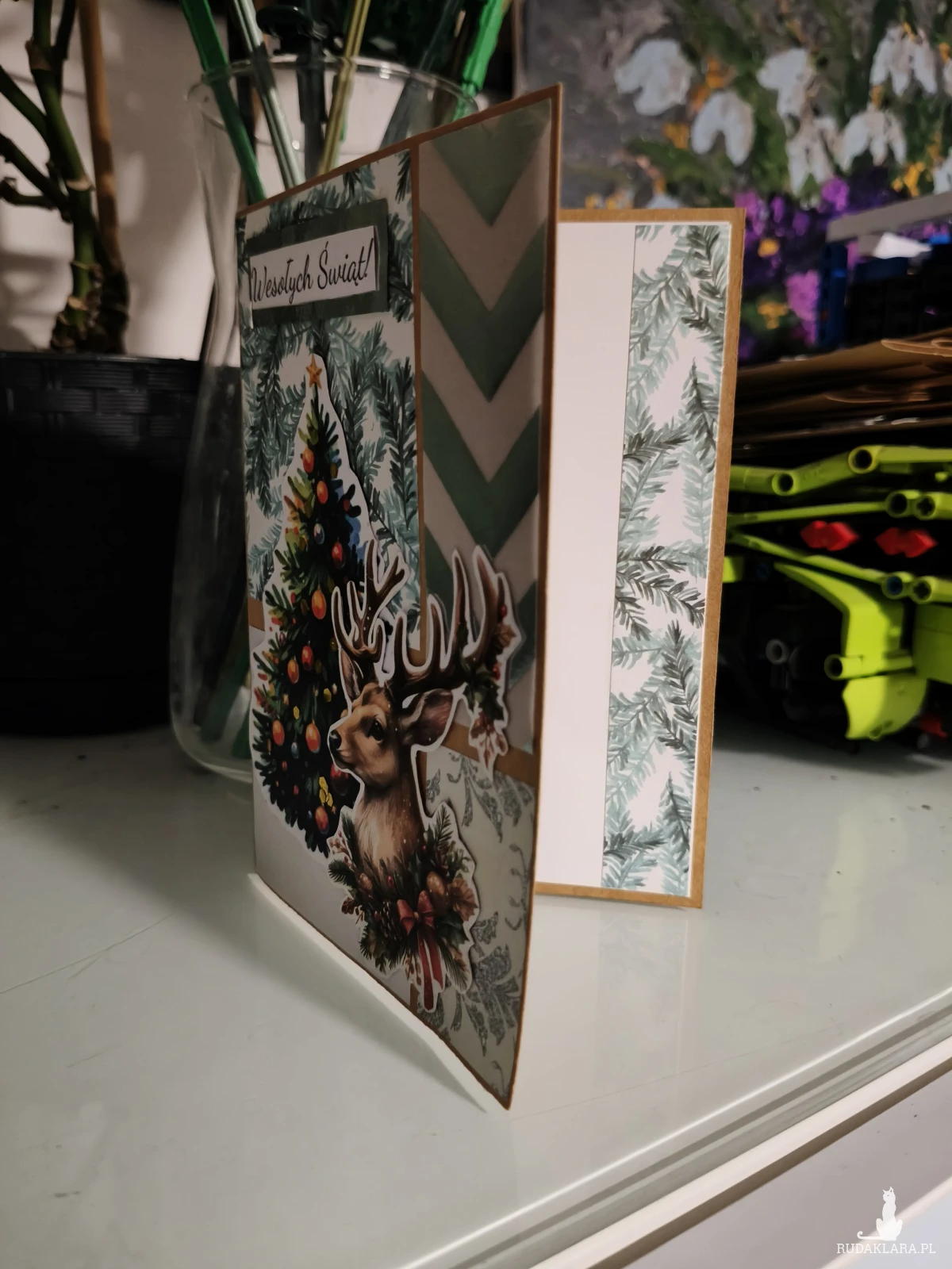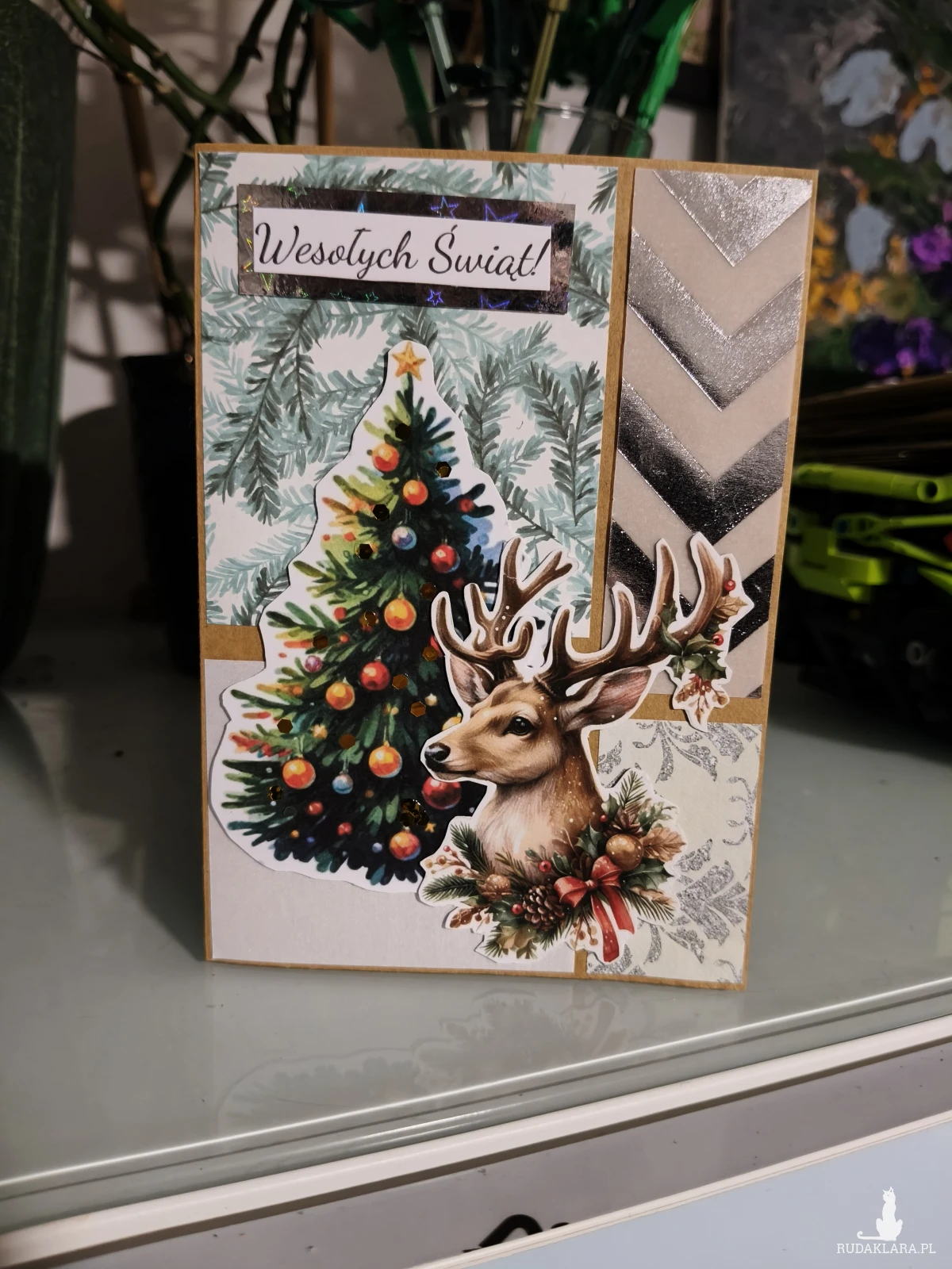 Kartka przedstawiająca choinkę i głowę renifera z ozdobnym wieńcem. Tło w tonacji zieleni z gałązkami iglaków oraz srebrnymi geometrycznymi wzorami. Napis „Wesołych Świąt!” na górze.