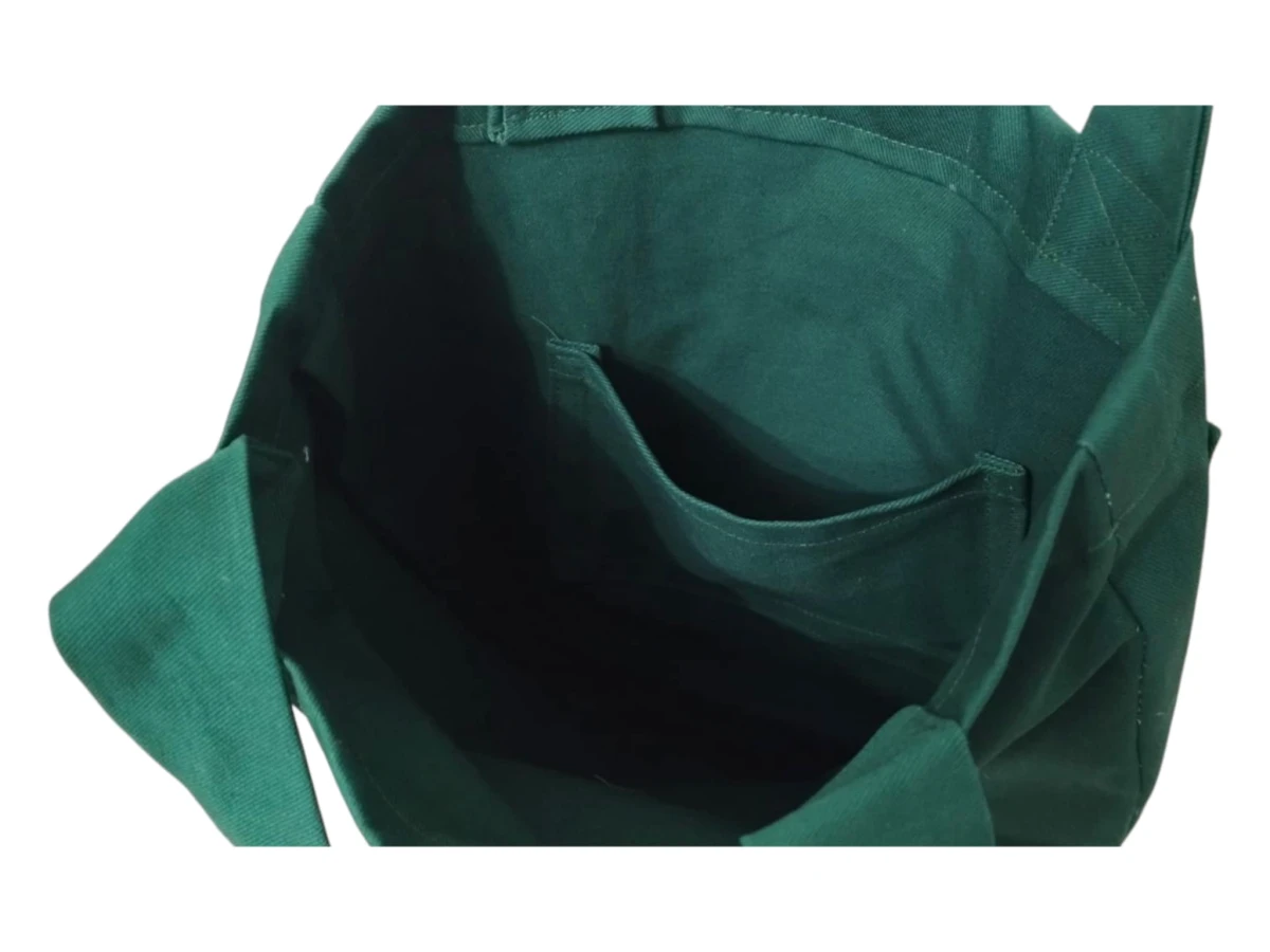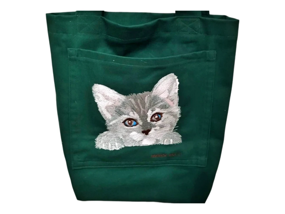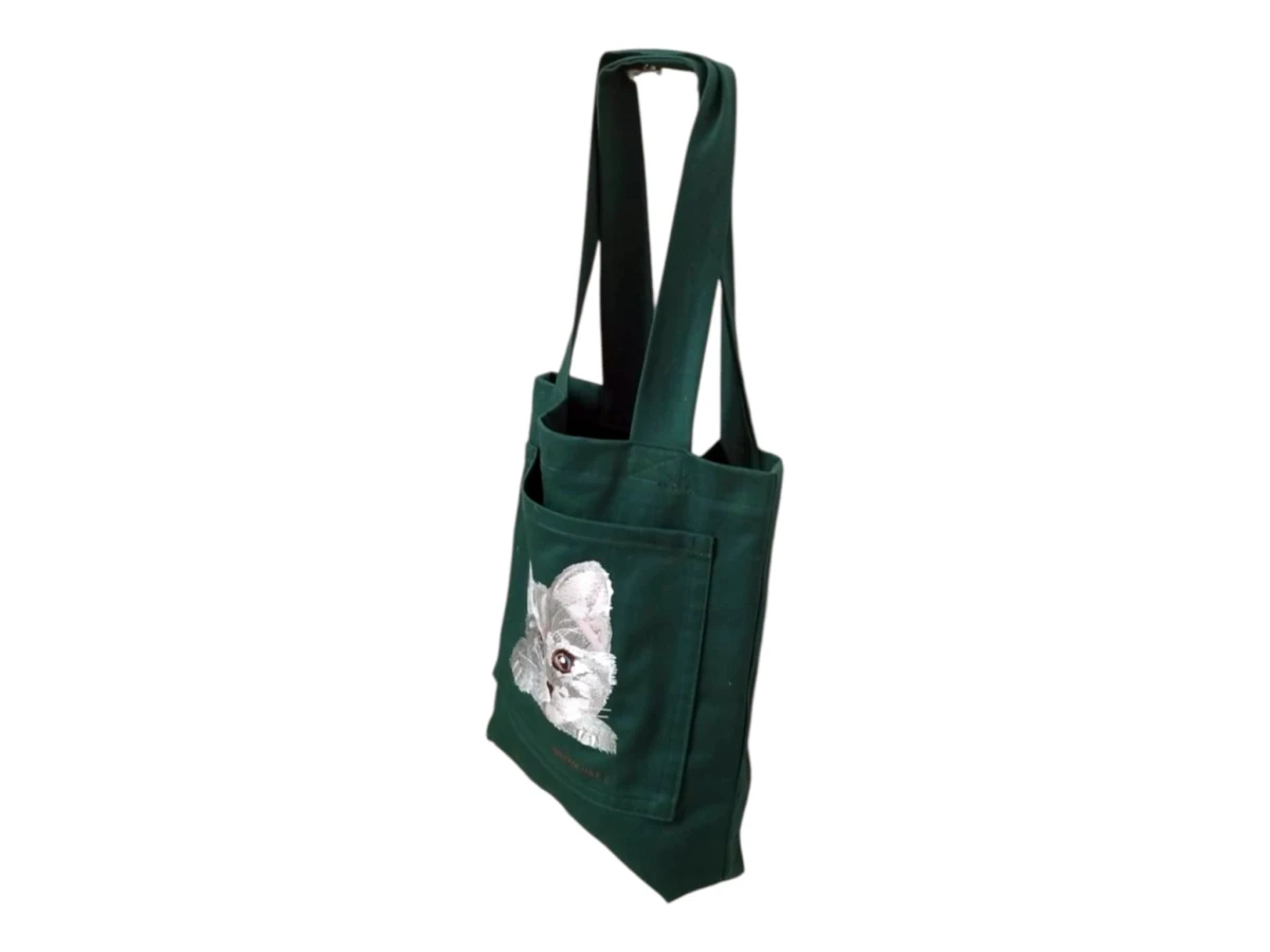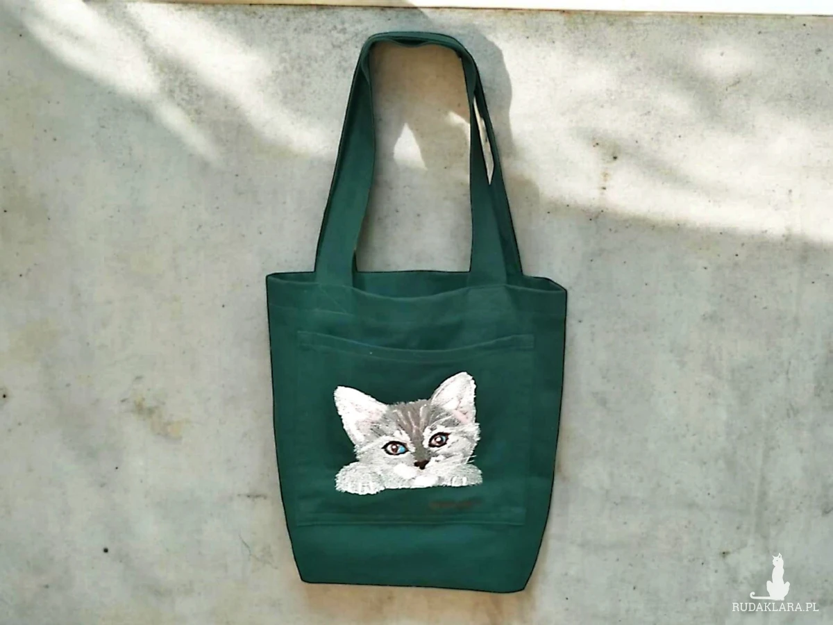 Przód torby z dużą kieszenią ozdobioną haftem. Kolor torby - zielony. Dno torby poszerzone - tak aby mogła pomieścić wszystkie niezbędne drobiazgi i "przydasie".