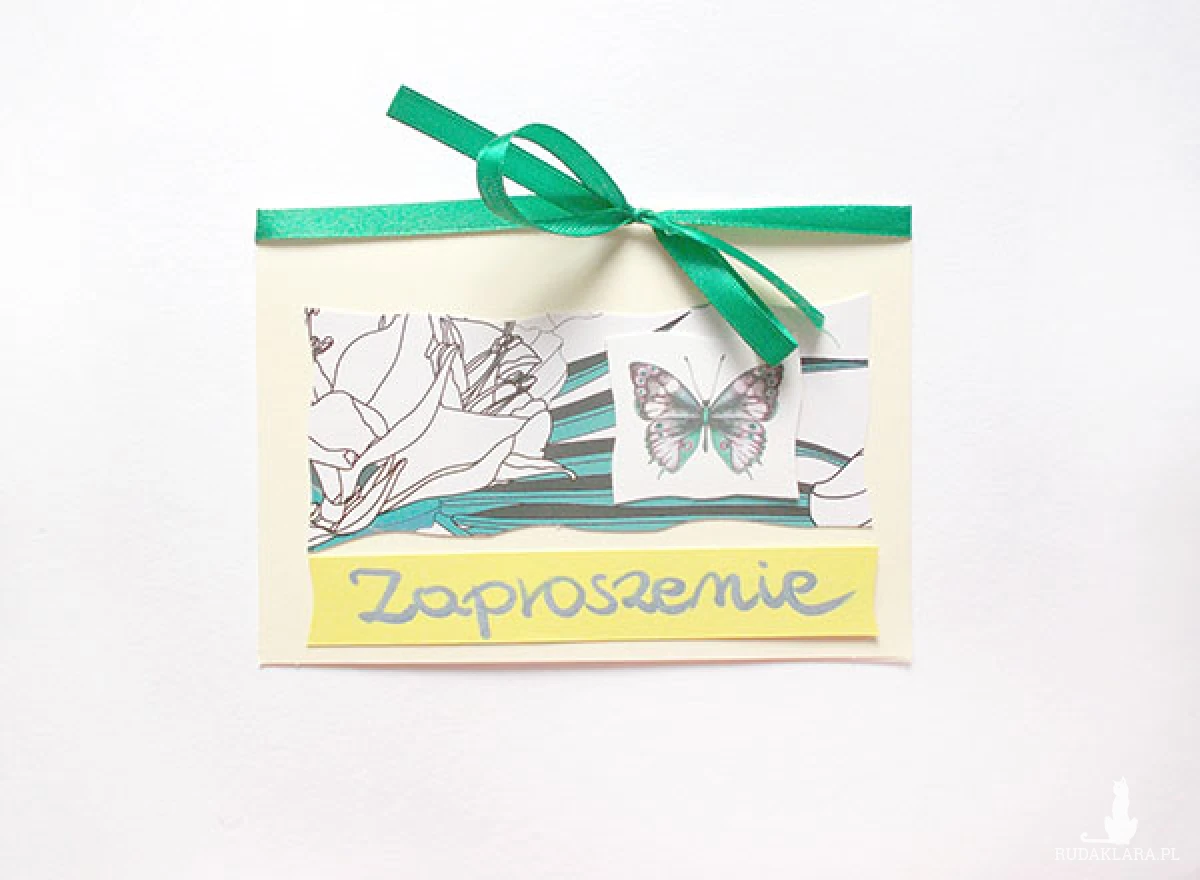 Uniwersalne, otwierane zaproszenie na dowolną okazję, kremowy kartonik, zielona wstążeczka. Zaproszenie jest bez tekstu, dołączona biała koperta.
