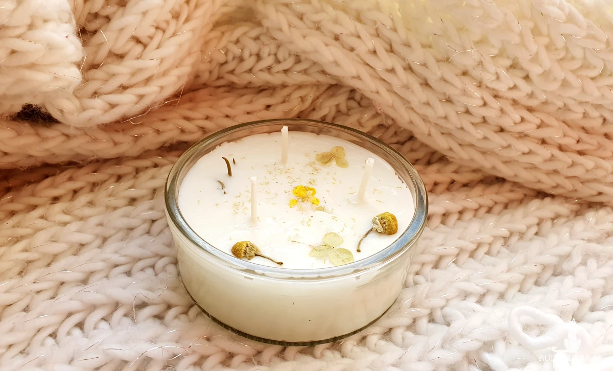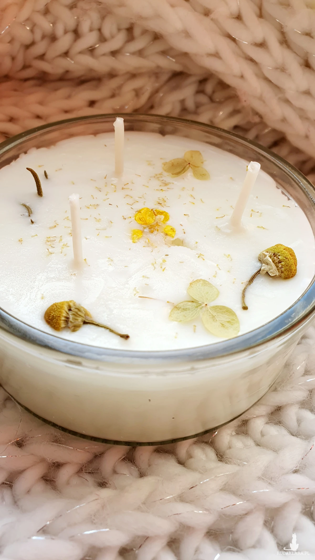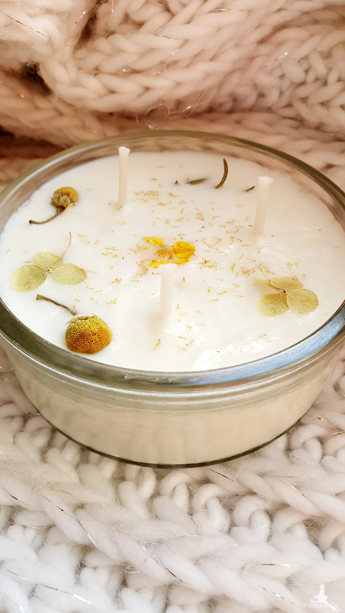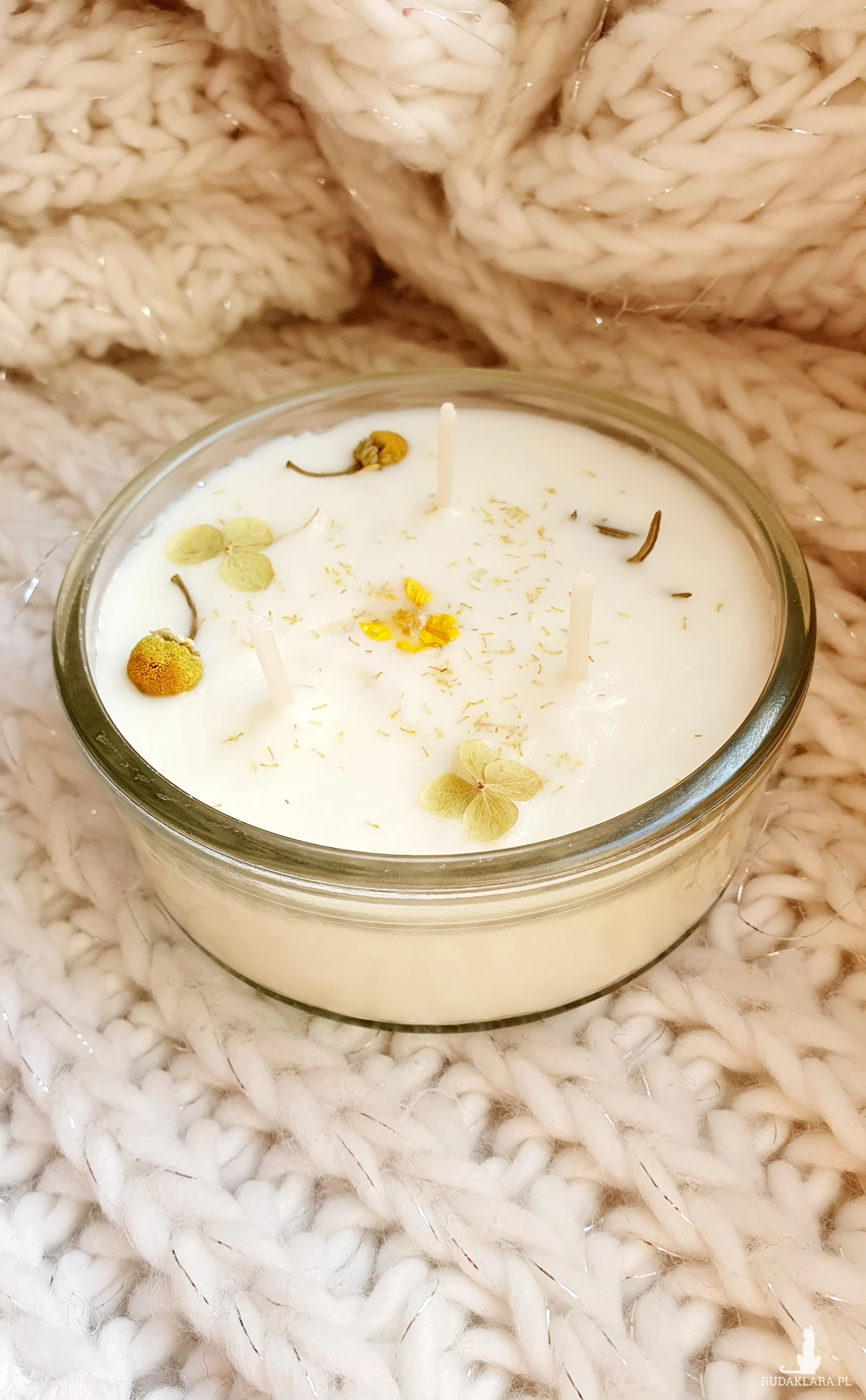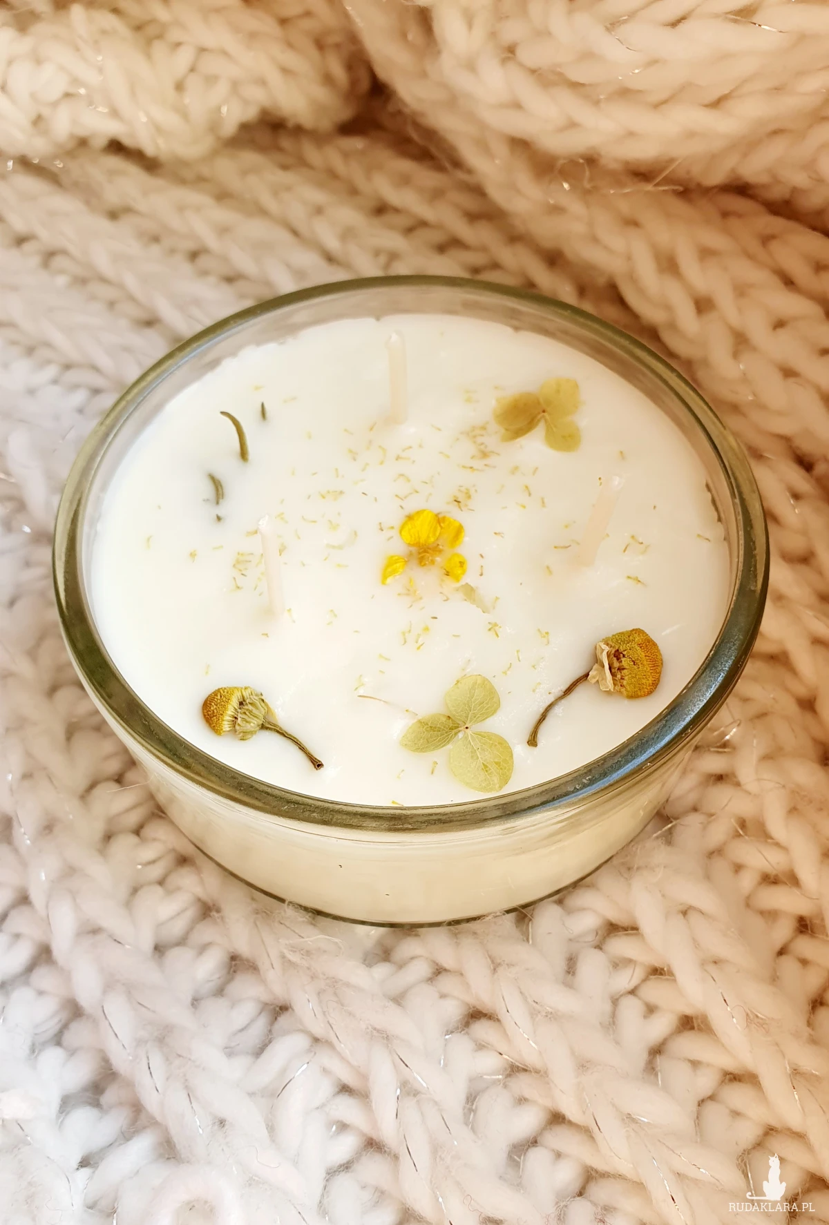 Świeca sojowa wykonana ze 100% wosku sojowego z dodatkiem olejku o obłędnym zapachu bergamoty z goździkami, udekorowana jaskrem, kwiatami hortensji, rumiankiem i rozmarynem. Lekkie nierówności na wierzchu świecy świadczą o własnoręcznym jej wykonaniu.