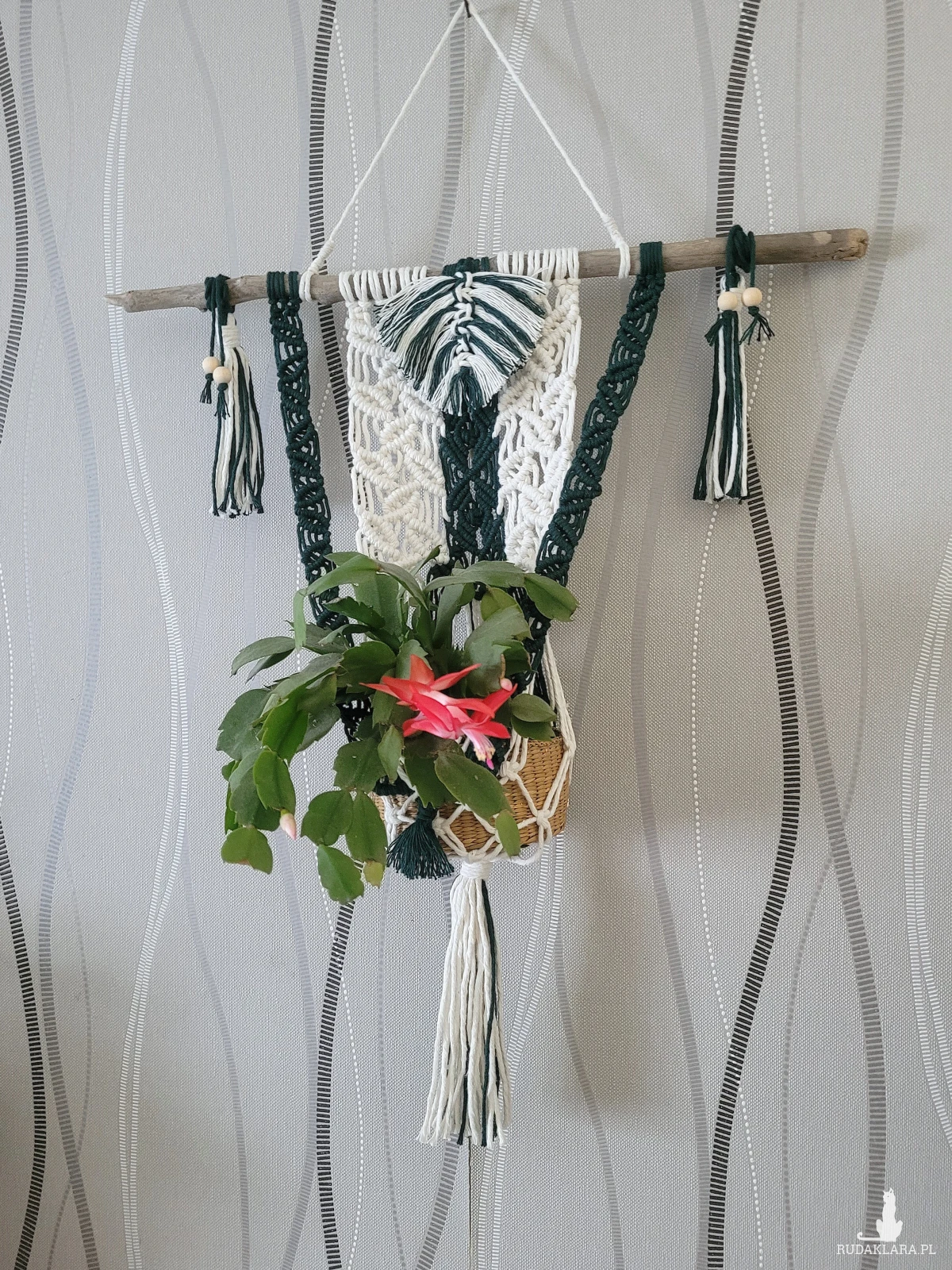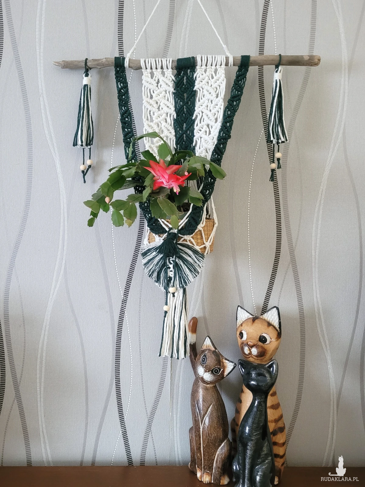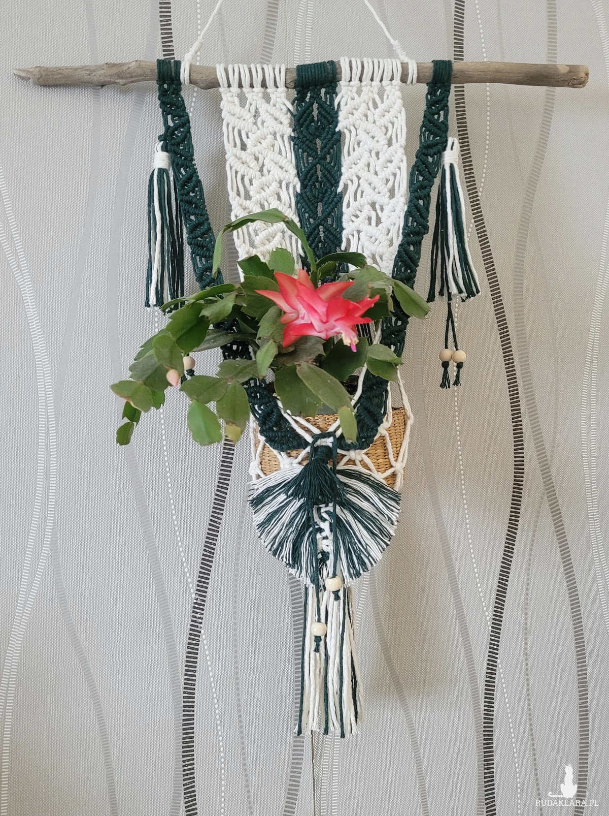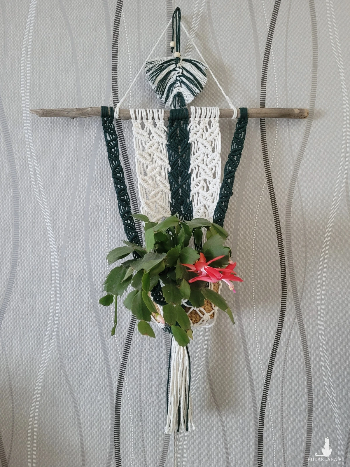 Wykonany jest ze sznurka bawełnianego w kolorach: naturalnym i butelkowej zieleni, na naturalnym kiju. Liść i chwosty można zdjąć albo przewiesić wedle uznania ,co delikanie zmienia jego wygląd (przykładowe wersje widać na zdjęciach) . Kwietnik w razie potrzeby można delikatnie ręcznie przeprać ( suszyć na wisząco lub leżąco)