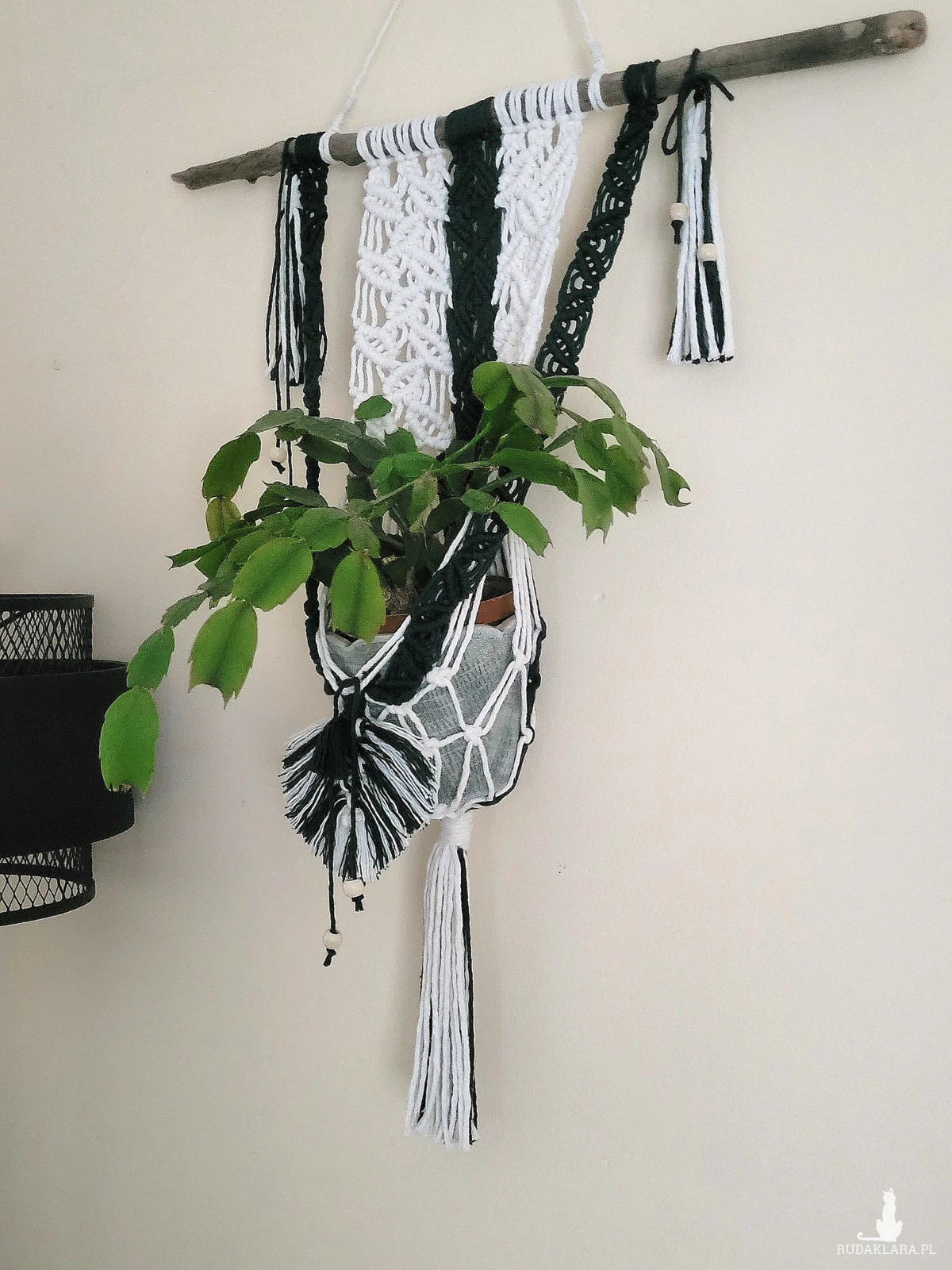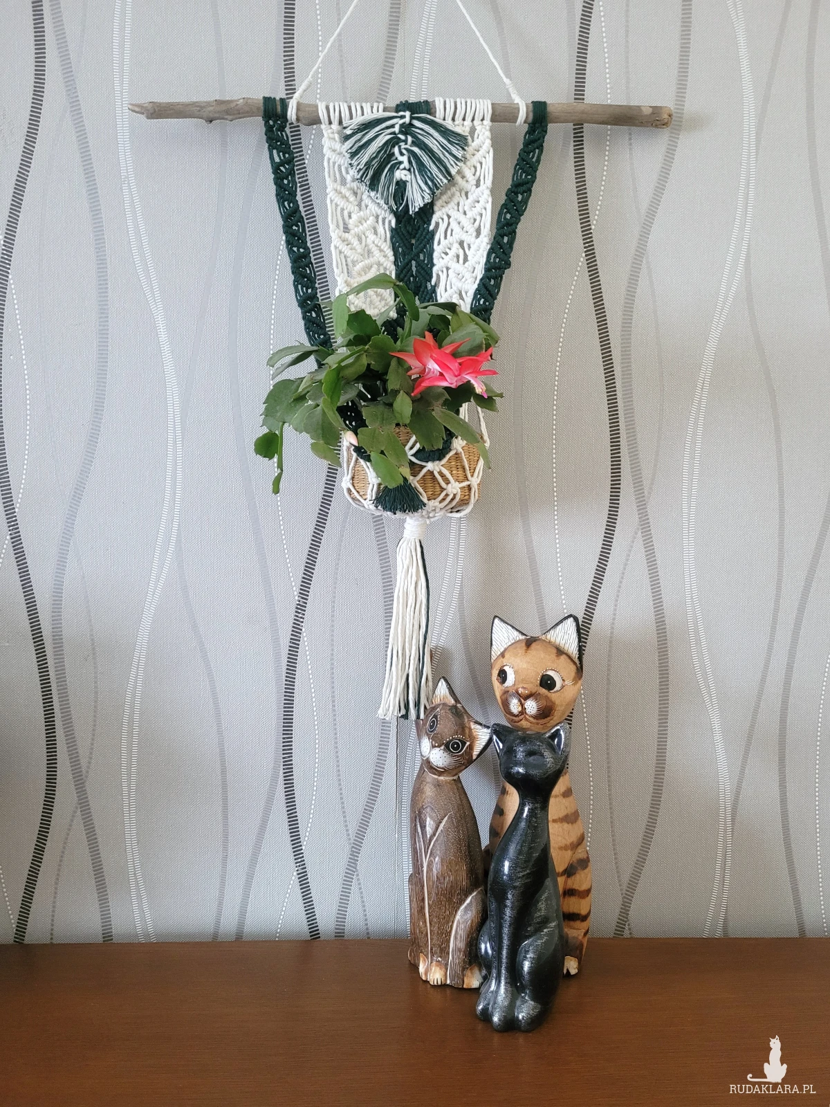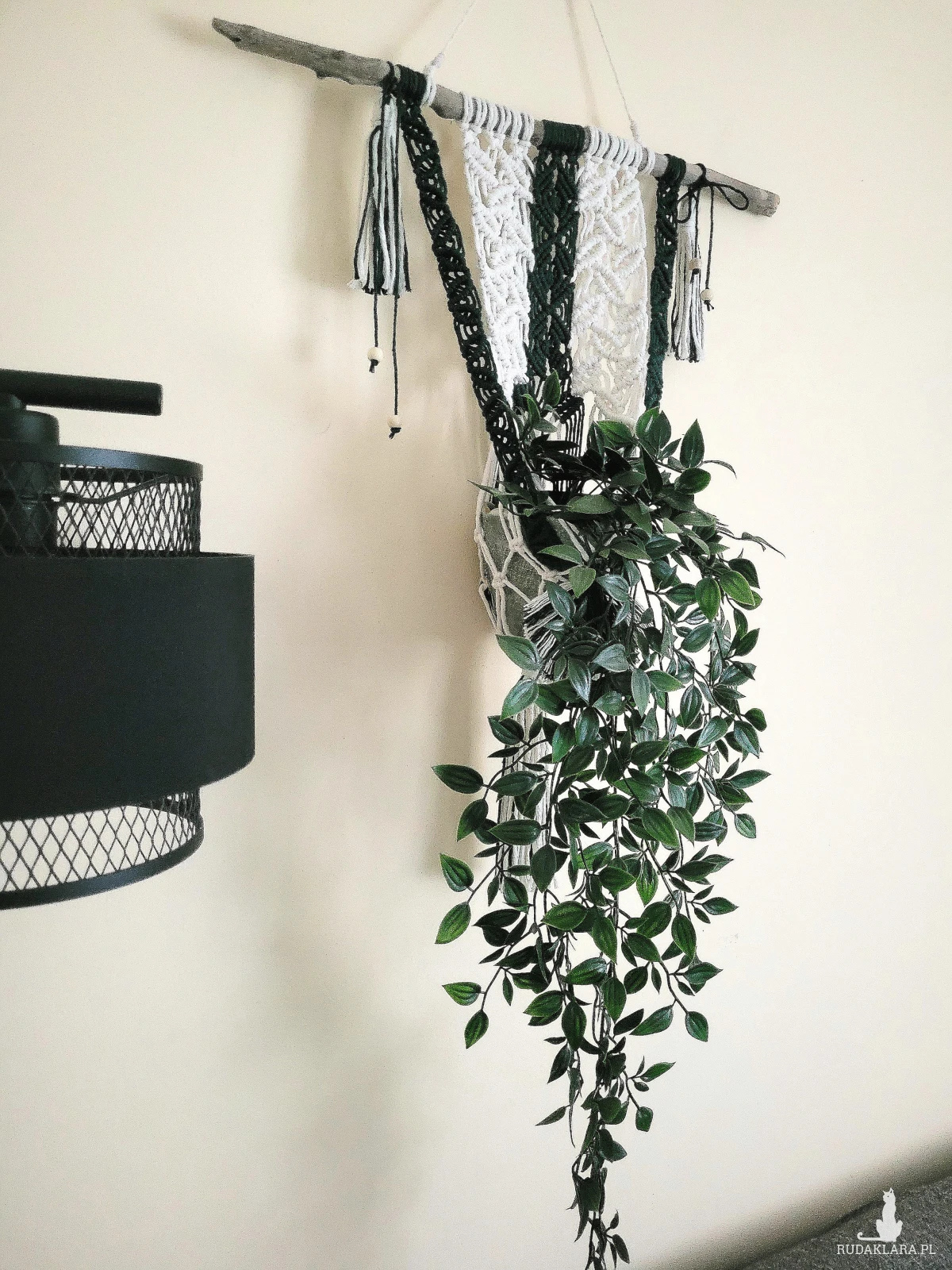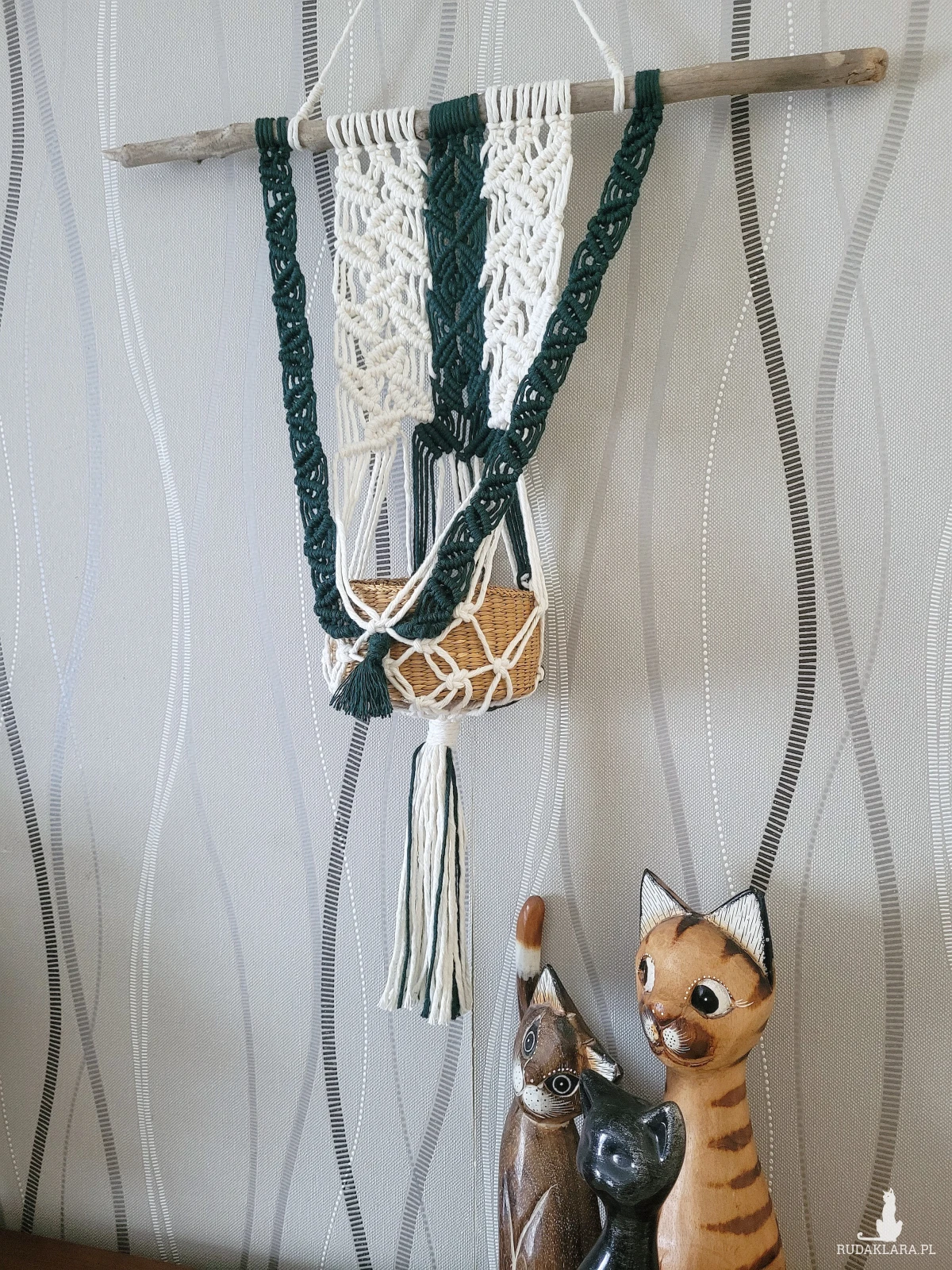 Wykonany jest ze sznurka bawełnianego w kolorach: naturalnym i butelkowej zieleni, na naturalnym kiju. Liść i chwosty można zdjąć albo przewiesić wedle uznania ,co delikanie zmienia jego wygląd (przykładowe wersje widać na zdjęciach) . Kwietnik w razie potrzeby można delikatnie ręcznie przeprać ( suszyć na wisząco lub leżąco)