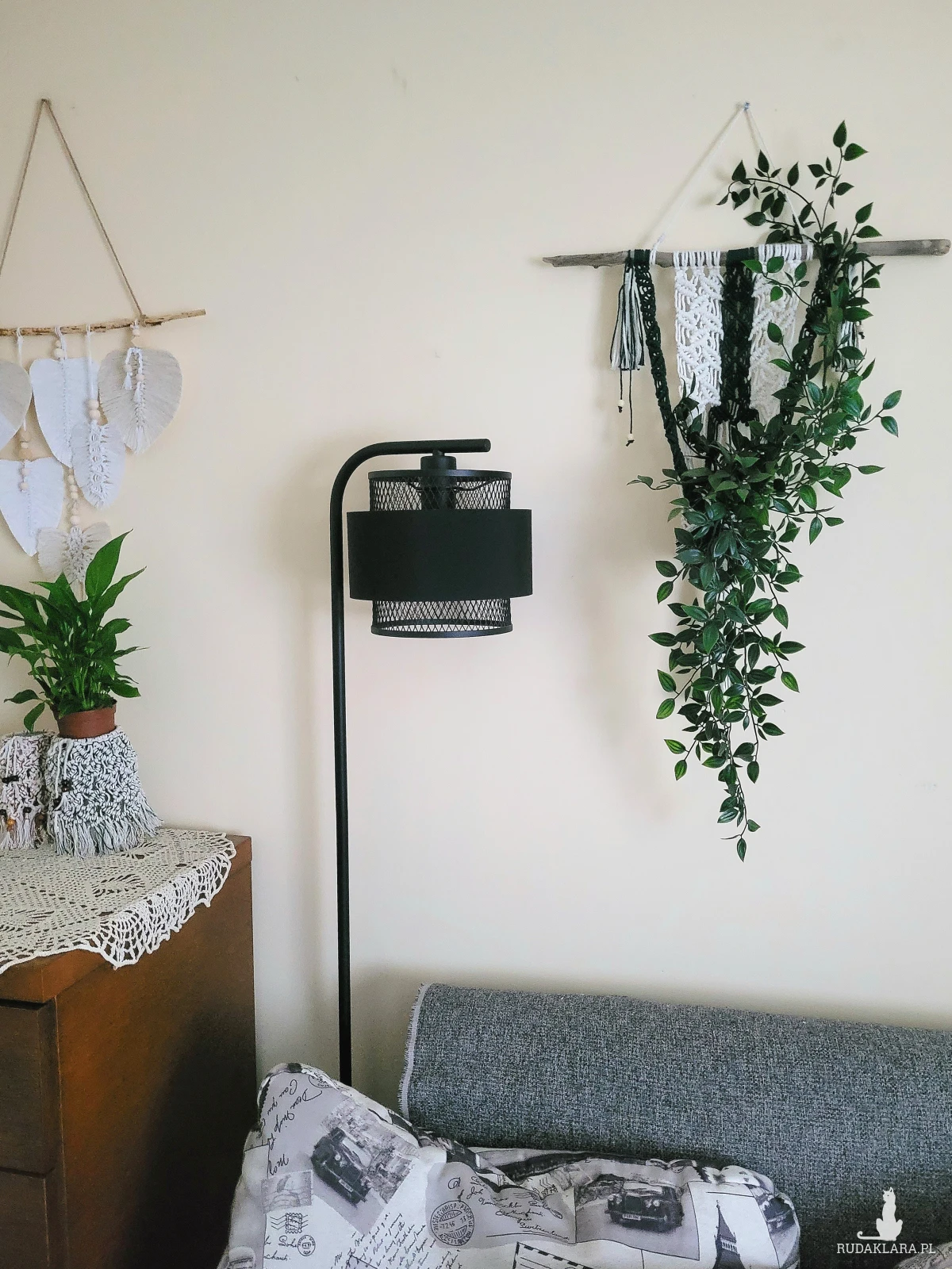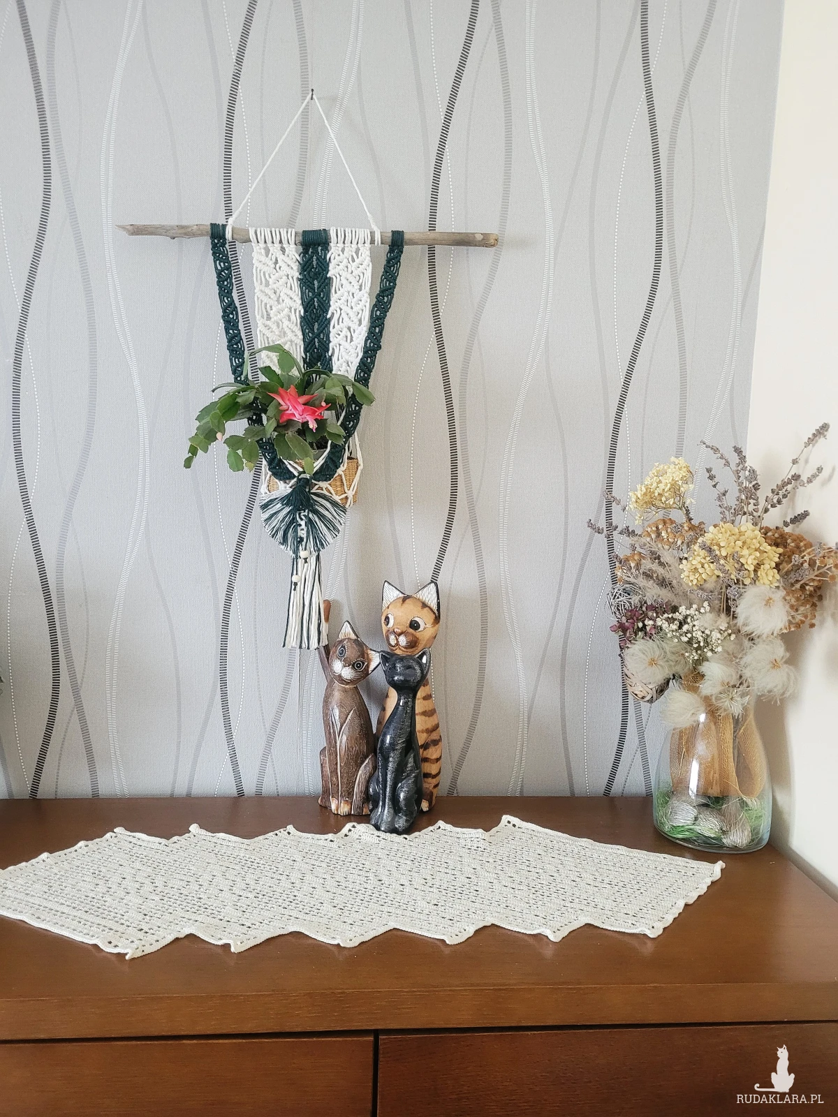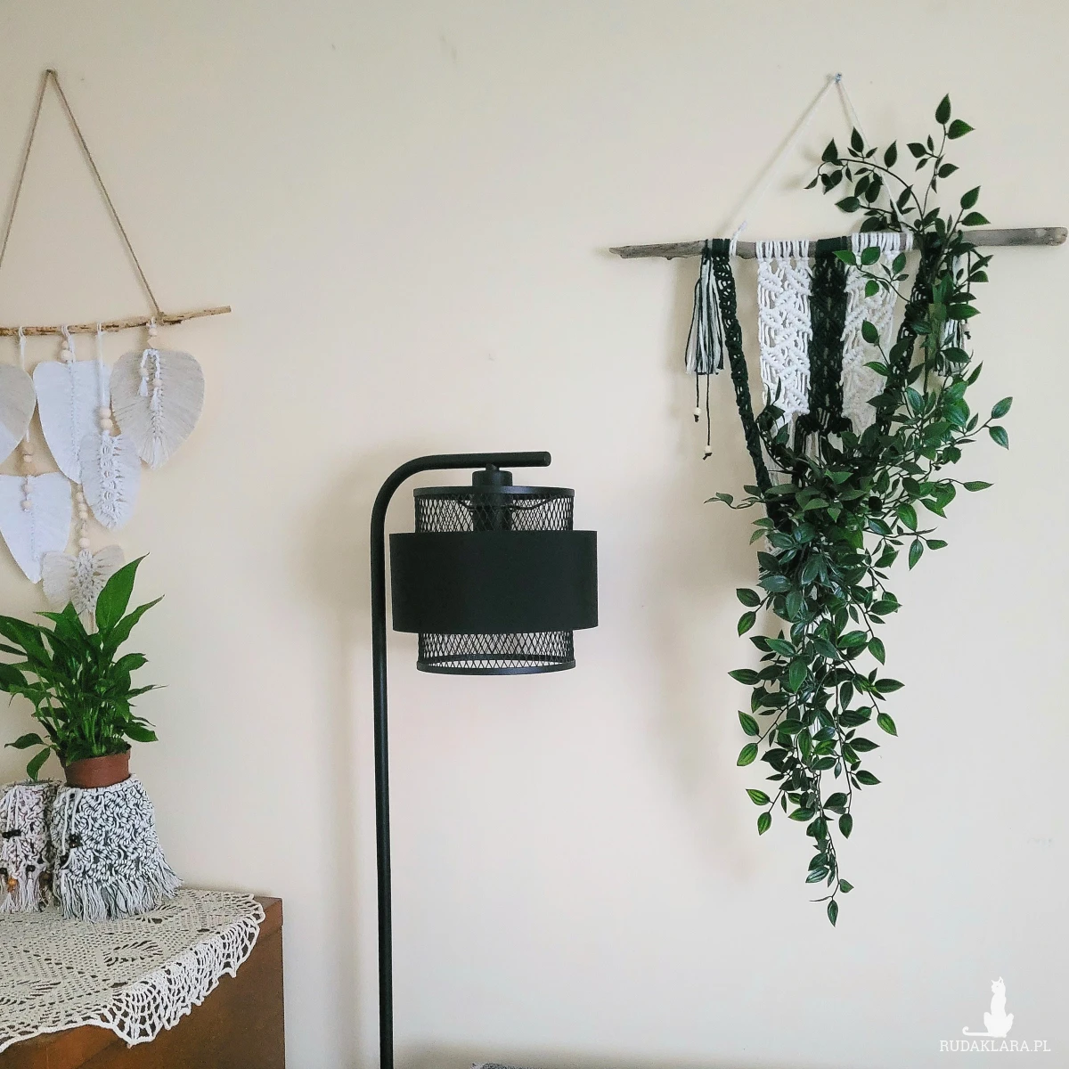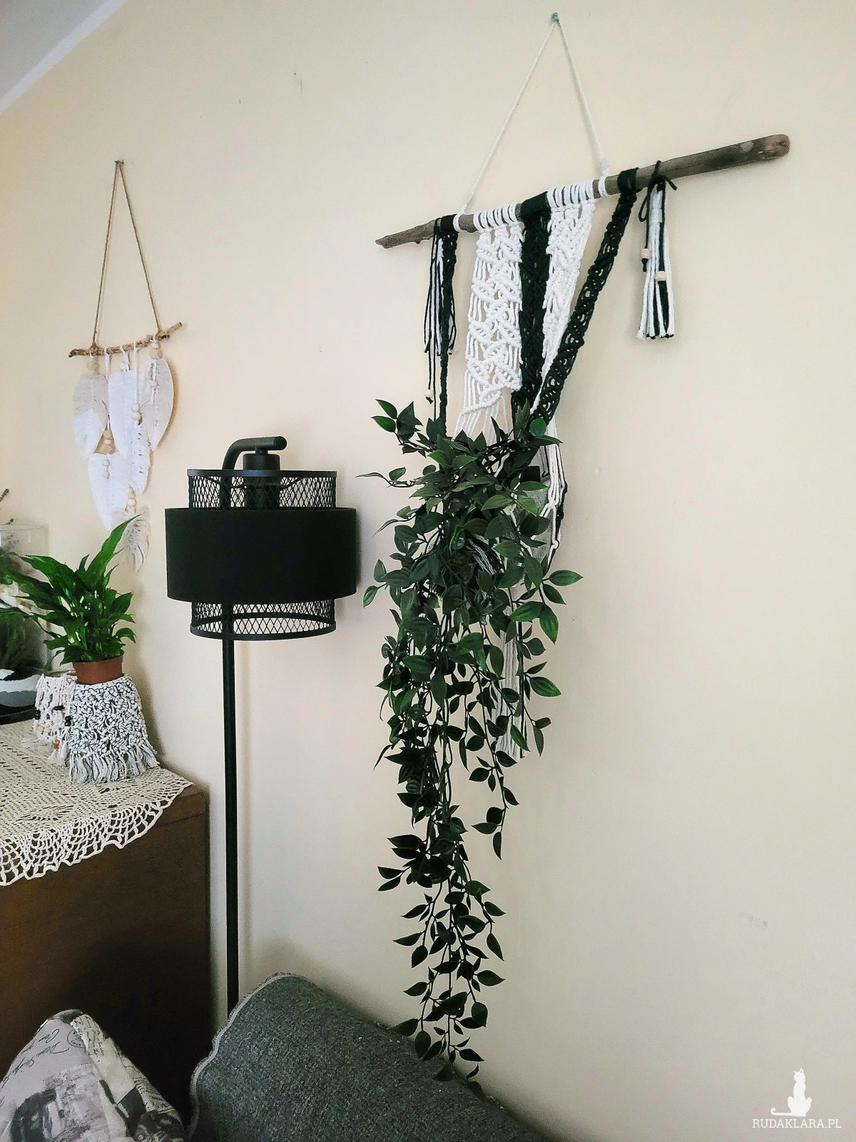 Wykonany jest ze sznurka bawełnianego w kolorach: naturalnym i butelkowej zieleni, na naturalnym kiju. Liść i chwosty można zdjąć albo przewiesić wedle uznania ,co delikanie zmienia jego wygląd (przykładowe wersje widać na zdjęciach) . Kwietnik w razie potrzeby można delikatnie ręcznie przeprać ( suszyć na wisząco lub leżąco)