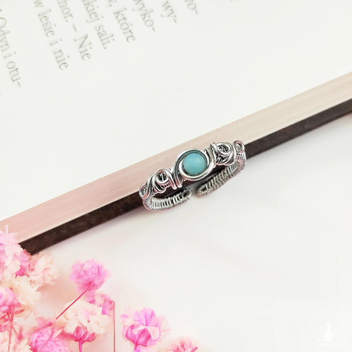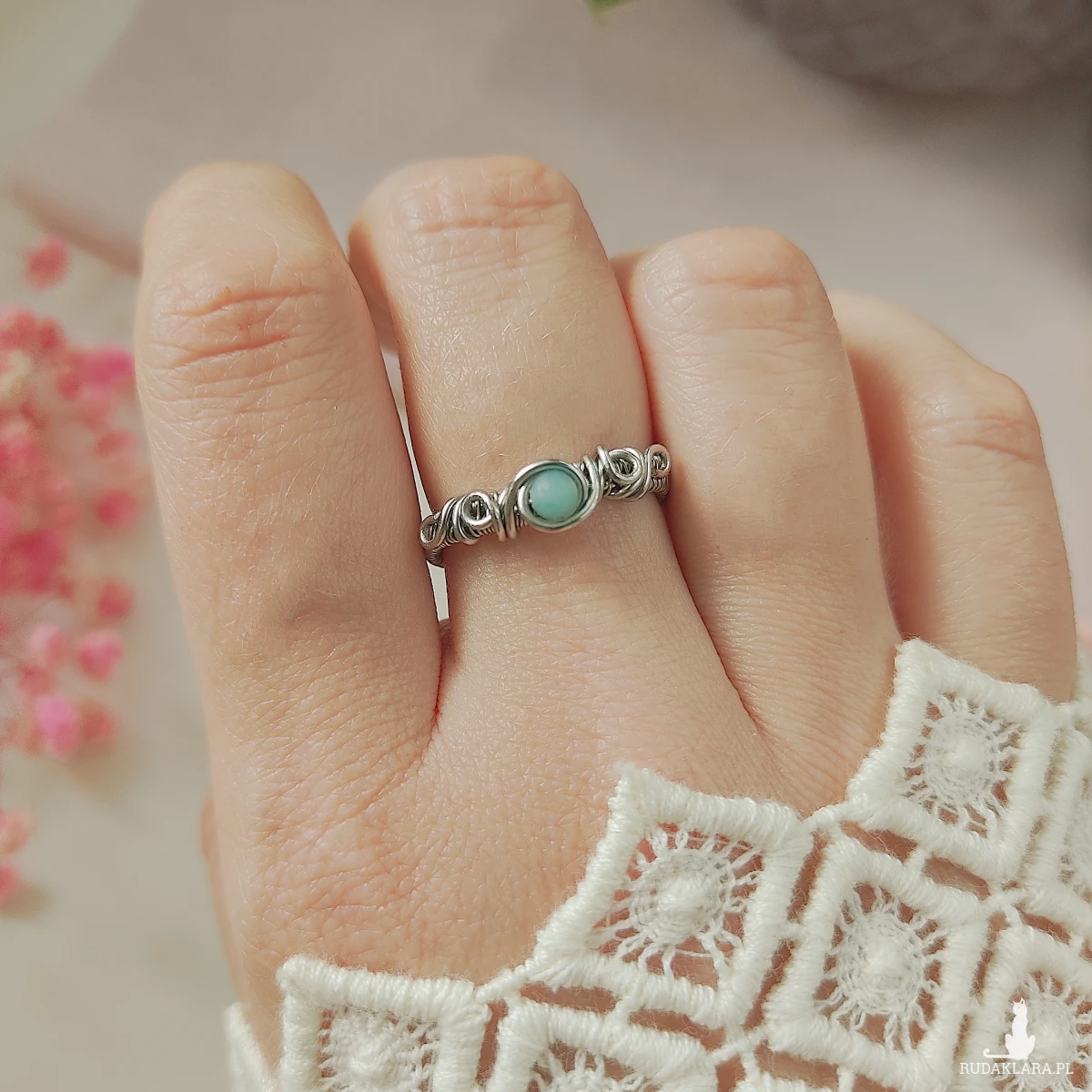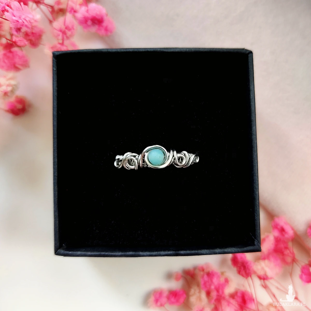 Pierścionek Amazonit ręcznie robiony. Wykonany techniką wire wrapping z drutów ze stali chirurgicznej.