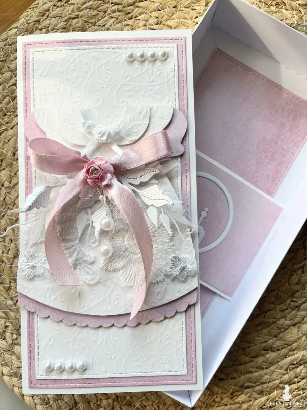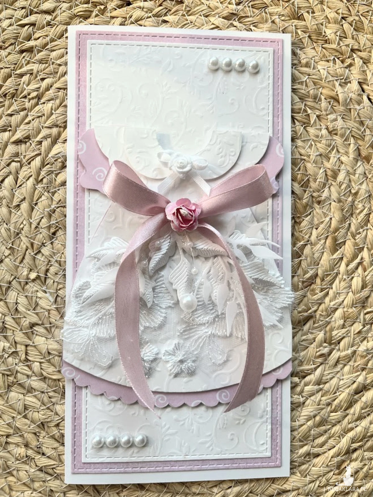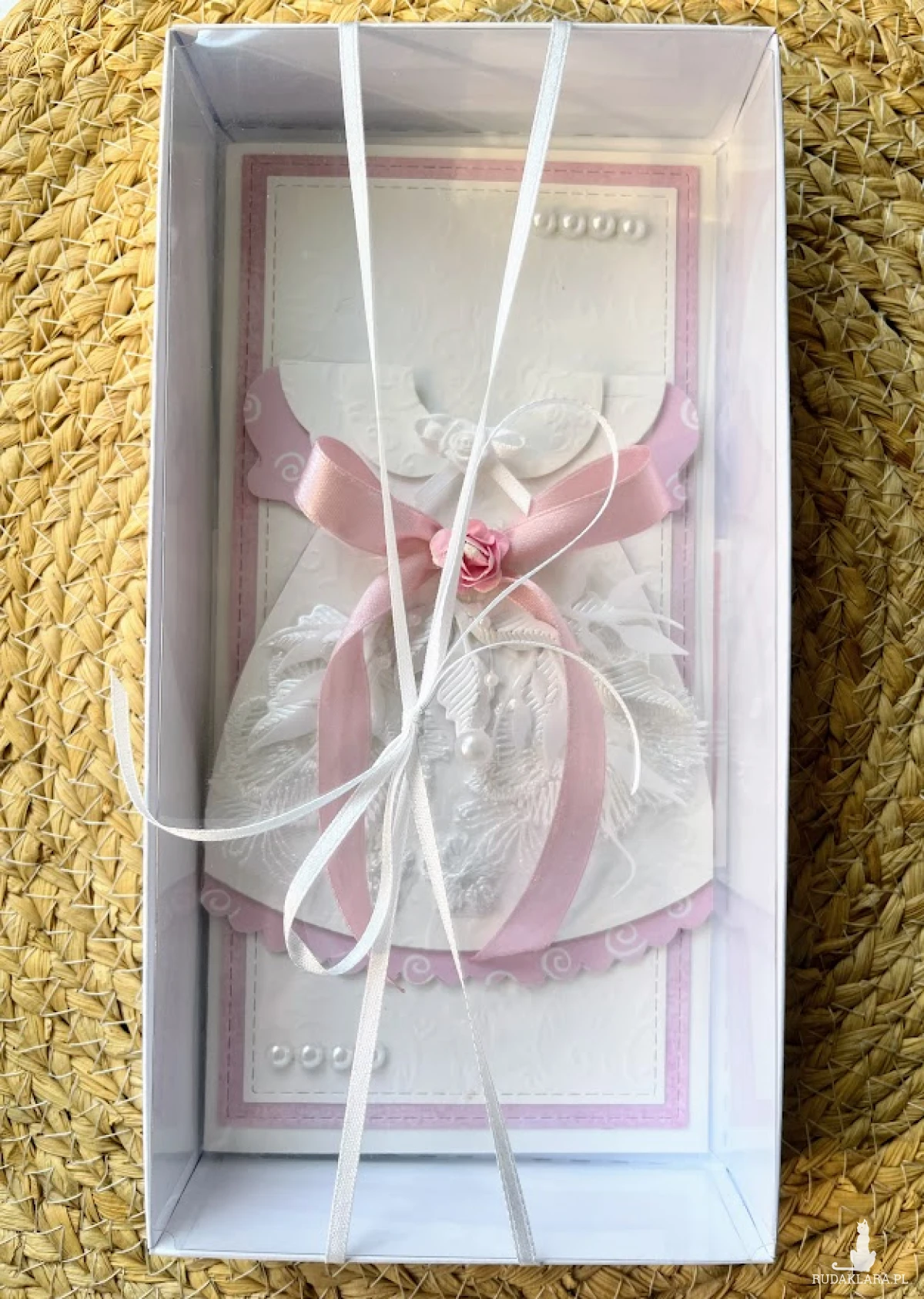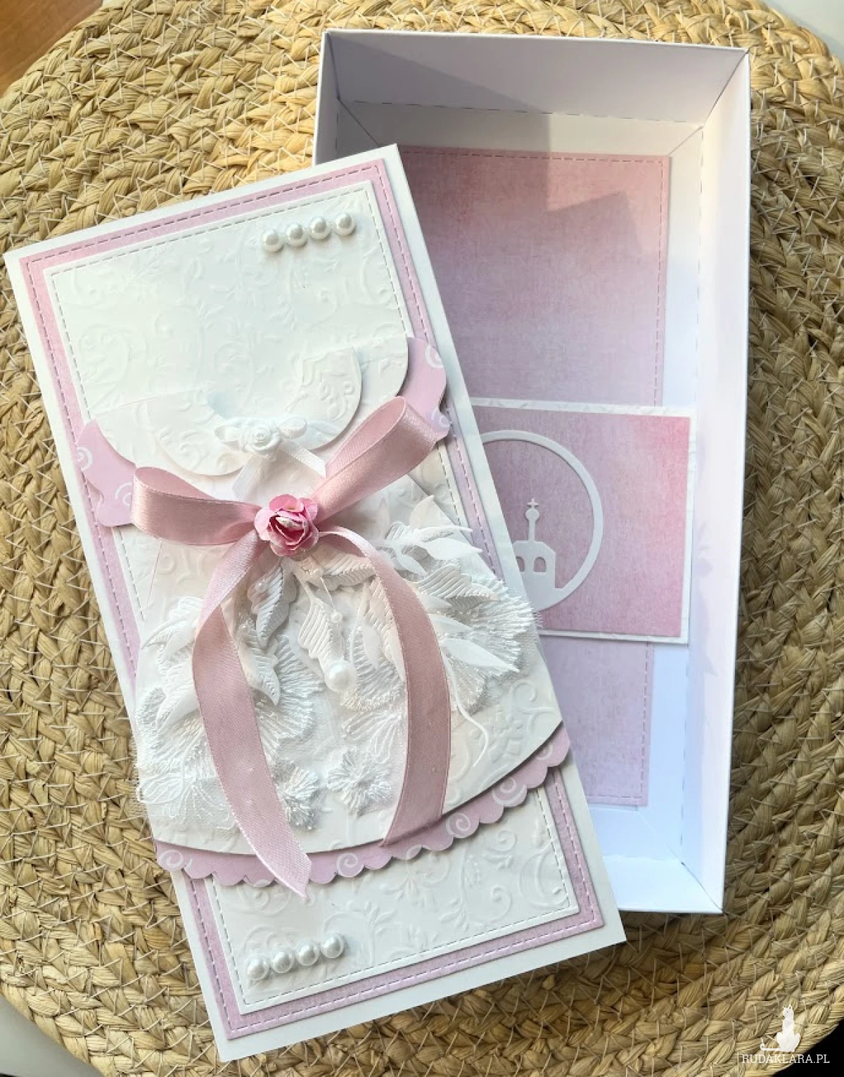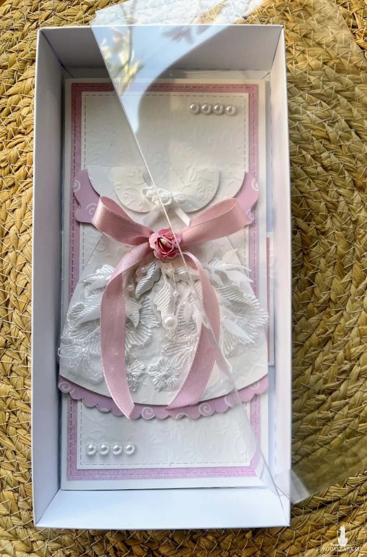 Wyjątkowa i delikatna pamiątka z okazji Chrztu Świętego dla dziewczynki. Wykonana z należytą starannością i dbałością o każdy detal. Baza kartki wykonana z białego papieru offset, bezdrzewnego i wym. 10,5 cm x 21 cm. Kartka ozdobiona warstwową kompozycją z papierowych elementów, kwiatów, koronek oraz perełek. Wewnątrz znajduje się miejsce na wpisanie życzeń Kartka jest w komplecie z białym pudełkiem , Na dnie pudełka znajduje się kieszonka na małe co nieco. Wymiar pudełka 11,5 cm x 22,5 cm. W tej postaci komplet gotowy do natychmiastowej wysyłki. Polecam