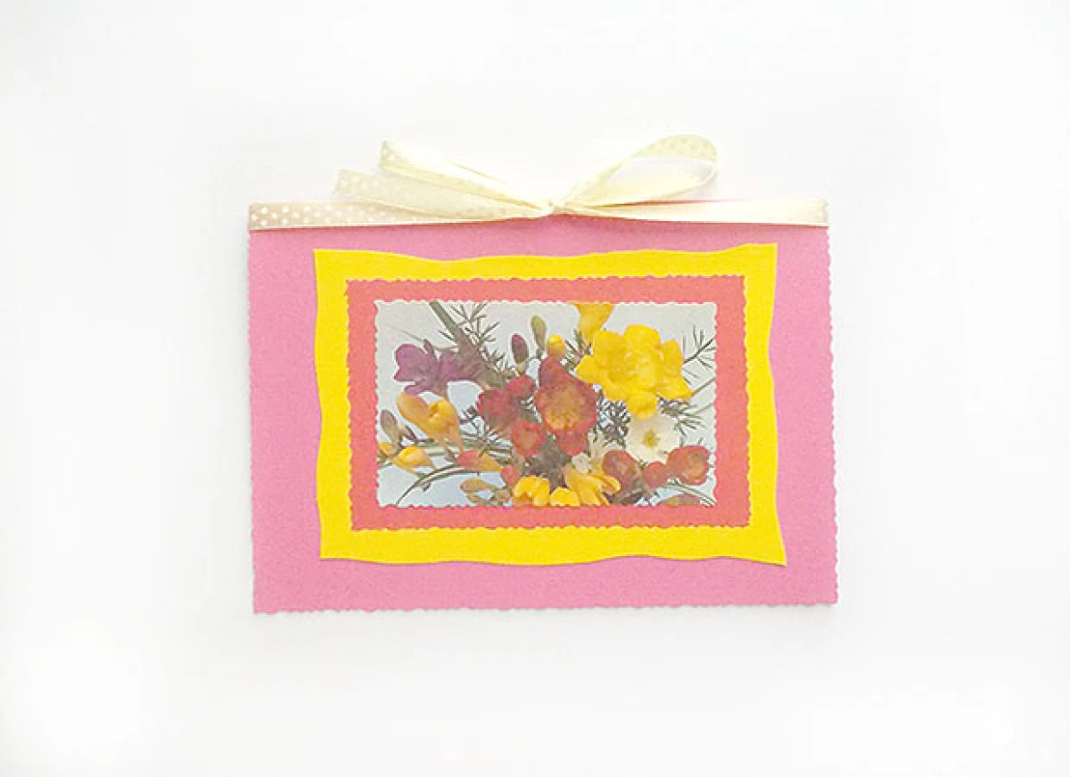 Uniwersalna, otwierana kartka okolicznościowa z z kwiatkami. Oryginalny karnet na każdą okazję, gruby kartonik, bez tekstu, dołączona biała koperta.