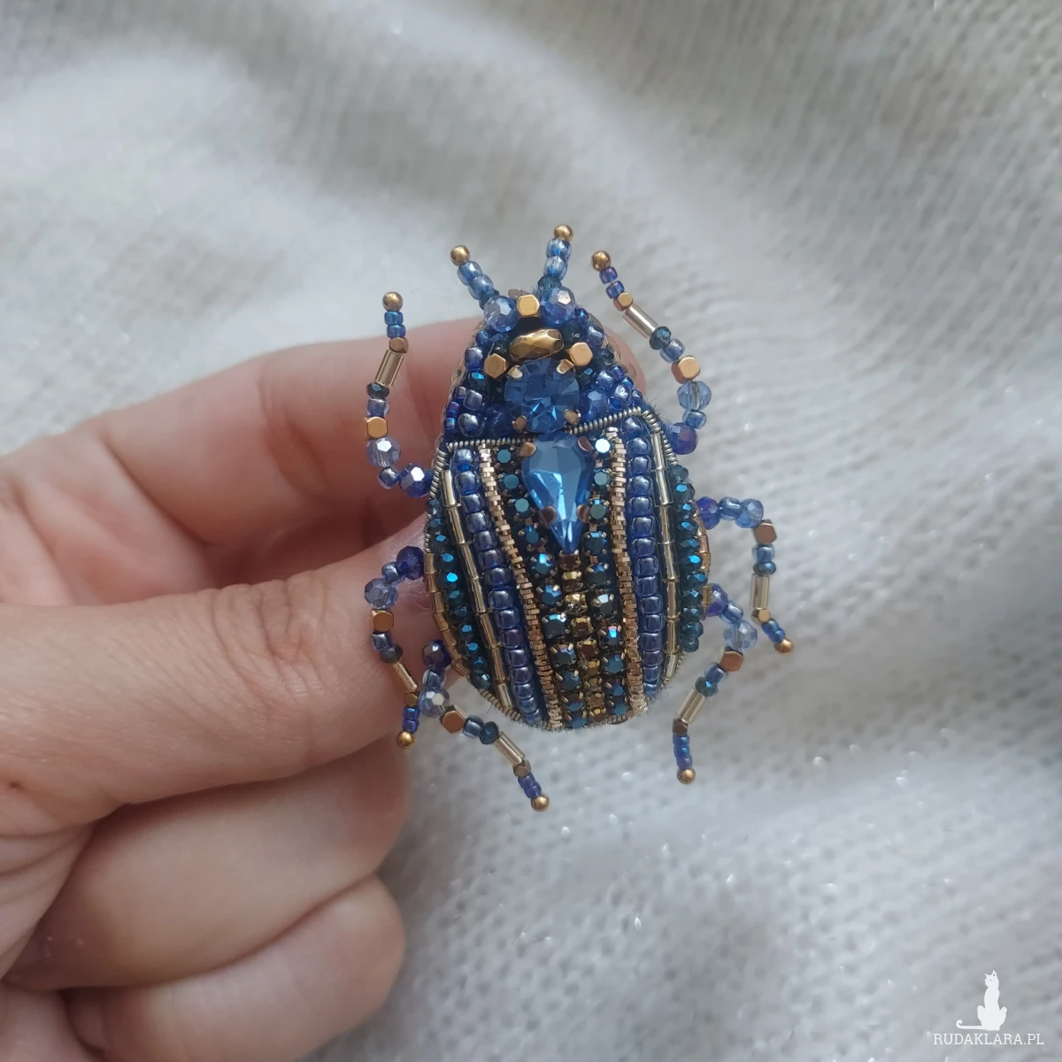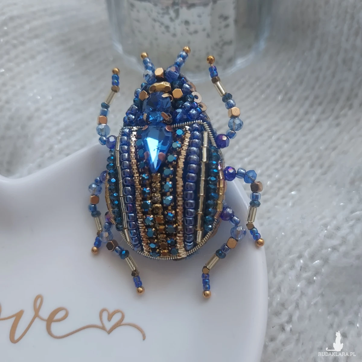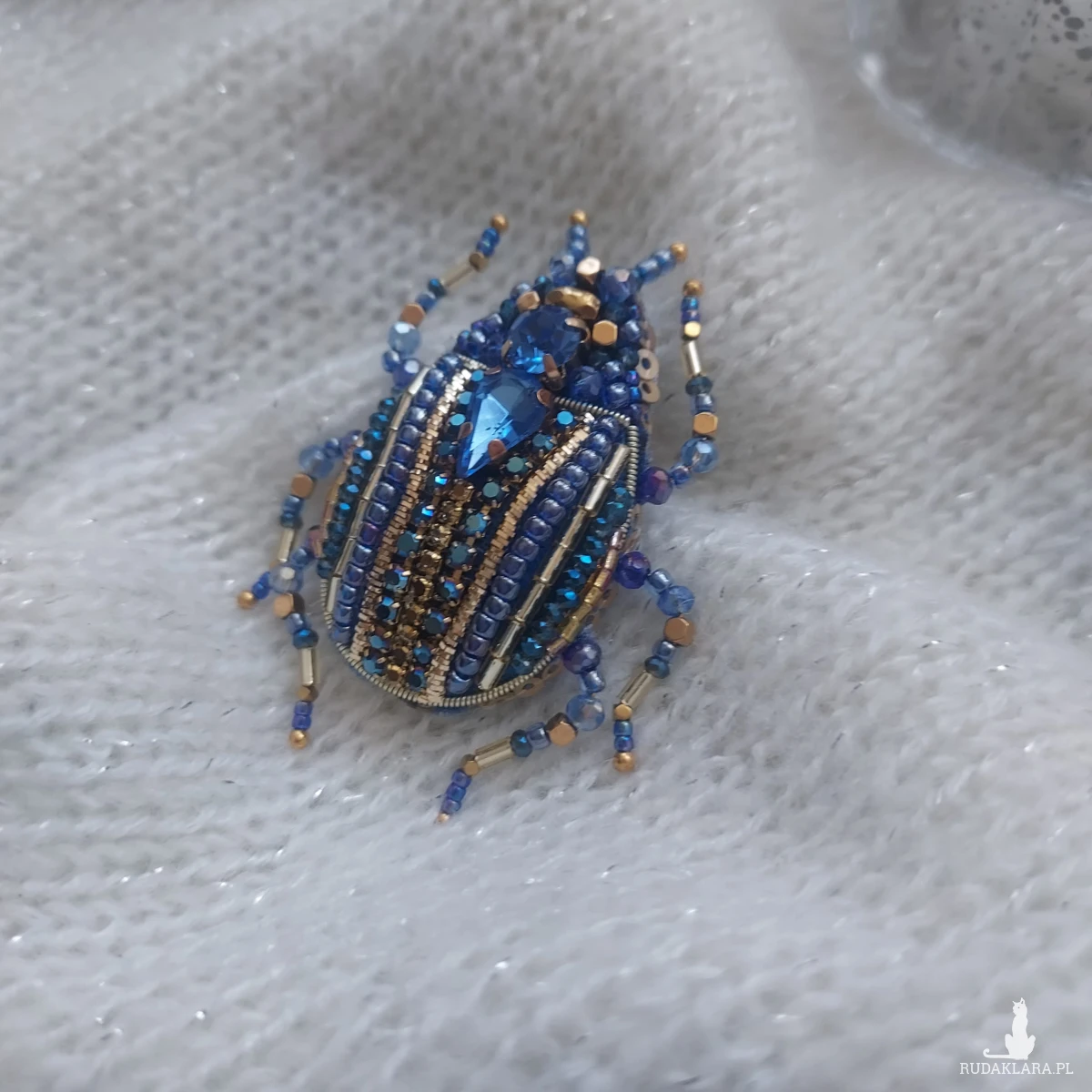 I tak powstała urocza broszka żuczek w kolorze niebiesko-złotym, która pięknie mieni się kryształkami oraz cyrkoniami w promieniach wiosennego słońca.