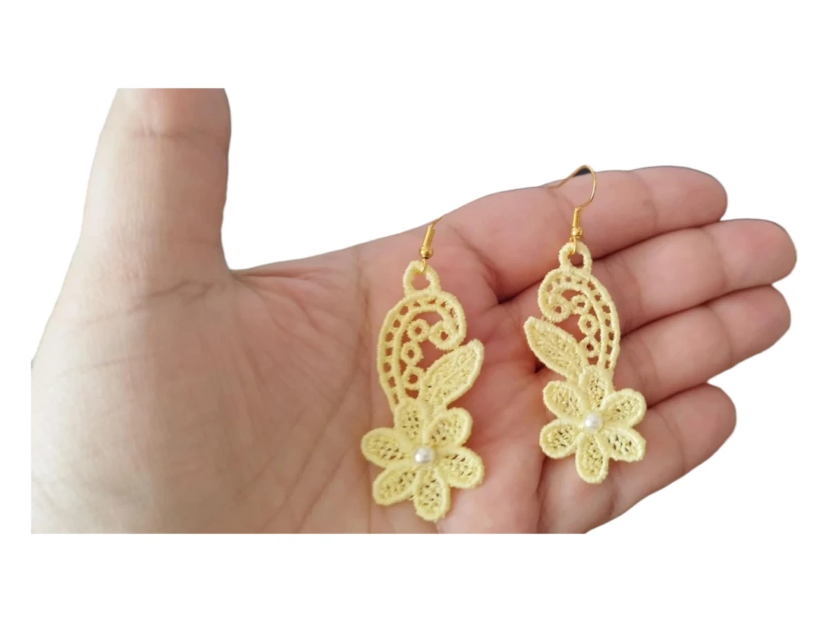 Kolczyki są haftowane (haft maszynowy). Haft jest gęsty, dobrze utrzymuje kształt i wygląd kolczyków. Haftowane kolczyki też są lekkie - to ich kolejny atut. Środek kwiatka w kolczyku ozdobiony koralikiem. (koralik przyszyty ręcznie)