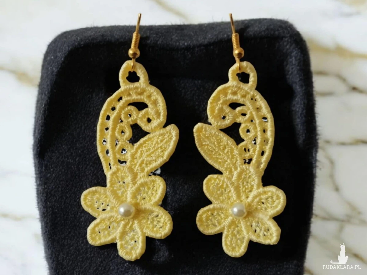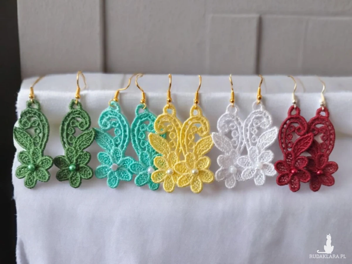 Kolczyki haftowane nicią poliestową.