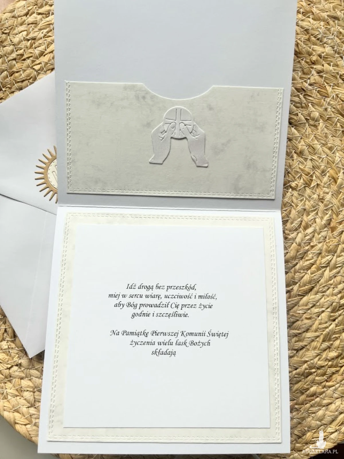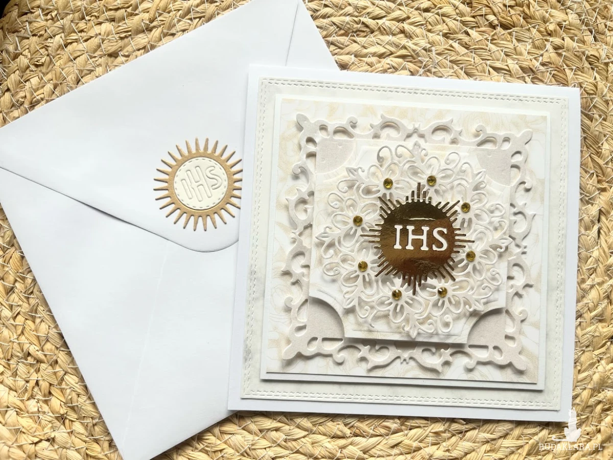Elegancka, umiarkowanie zdobiona kartka z okazji Pierwszej Komunii Świętej. Utrzymana w złoto-białej kolorystyce. Ozdobiona symbolem IHS. Kartka jest w całości wykonana ręcznie z najlepszej jakości materiałów do scrapbookingu. Wielkość kartki 14,5 x 14,5. wewnątrz kartki zamiezczono gotowe życzenia do własnoręcznego podpisu oraz kieszonka na małe co nieco, Do kartki dołączono białą kopertę o wymiarach 15,5x15,5 ozdobioną symbolem IHS