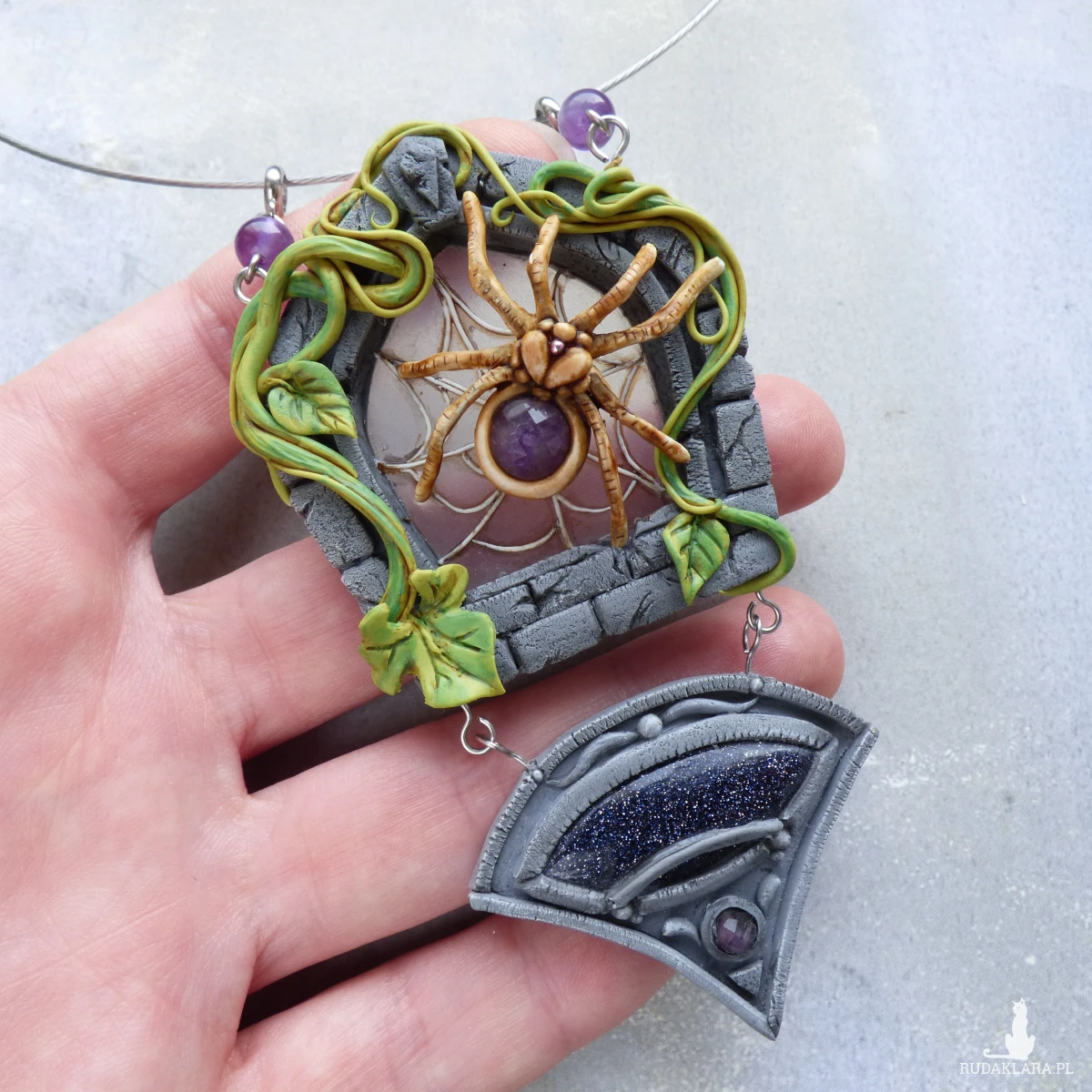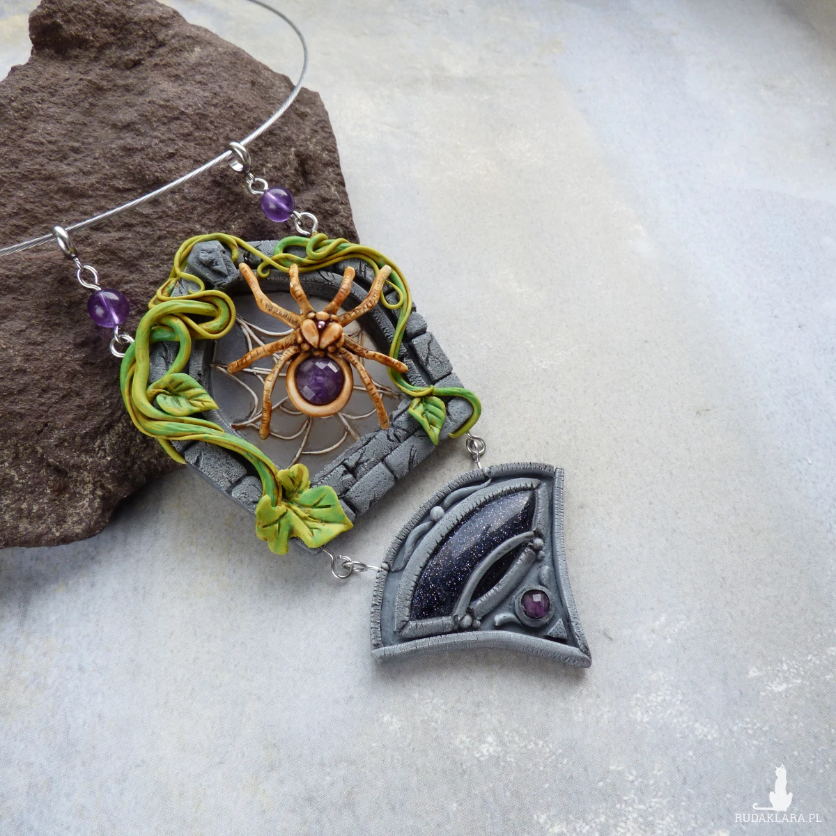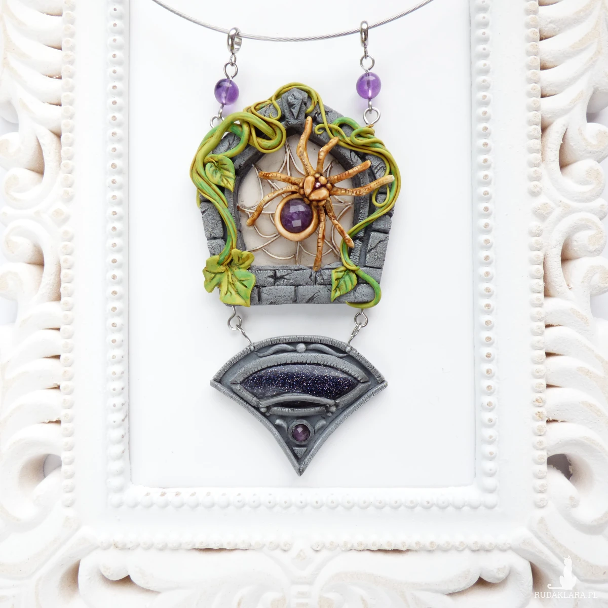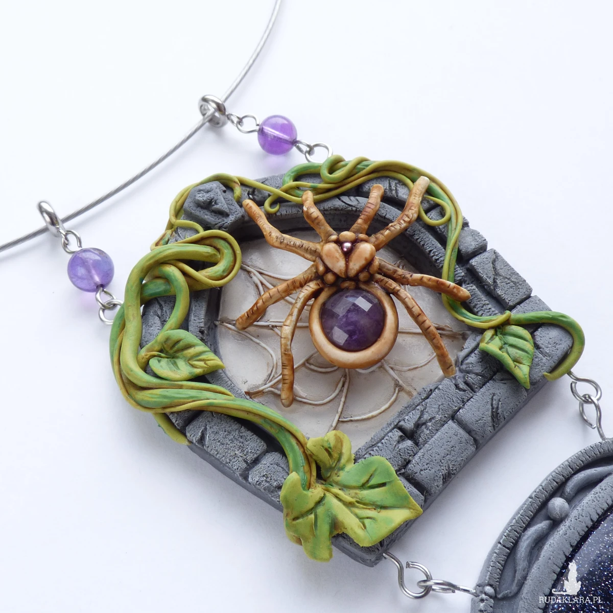 Unikatowy naszyjnik inspirowany pająkiem, który przędzie swoje nici na kamiennym oknie porośniętym pnączami.