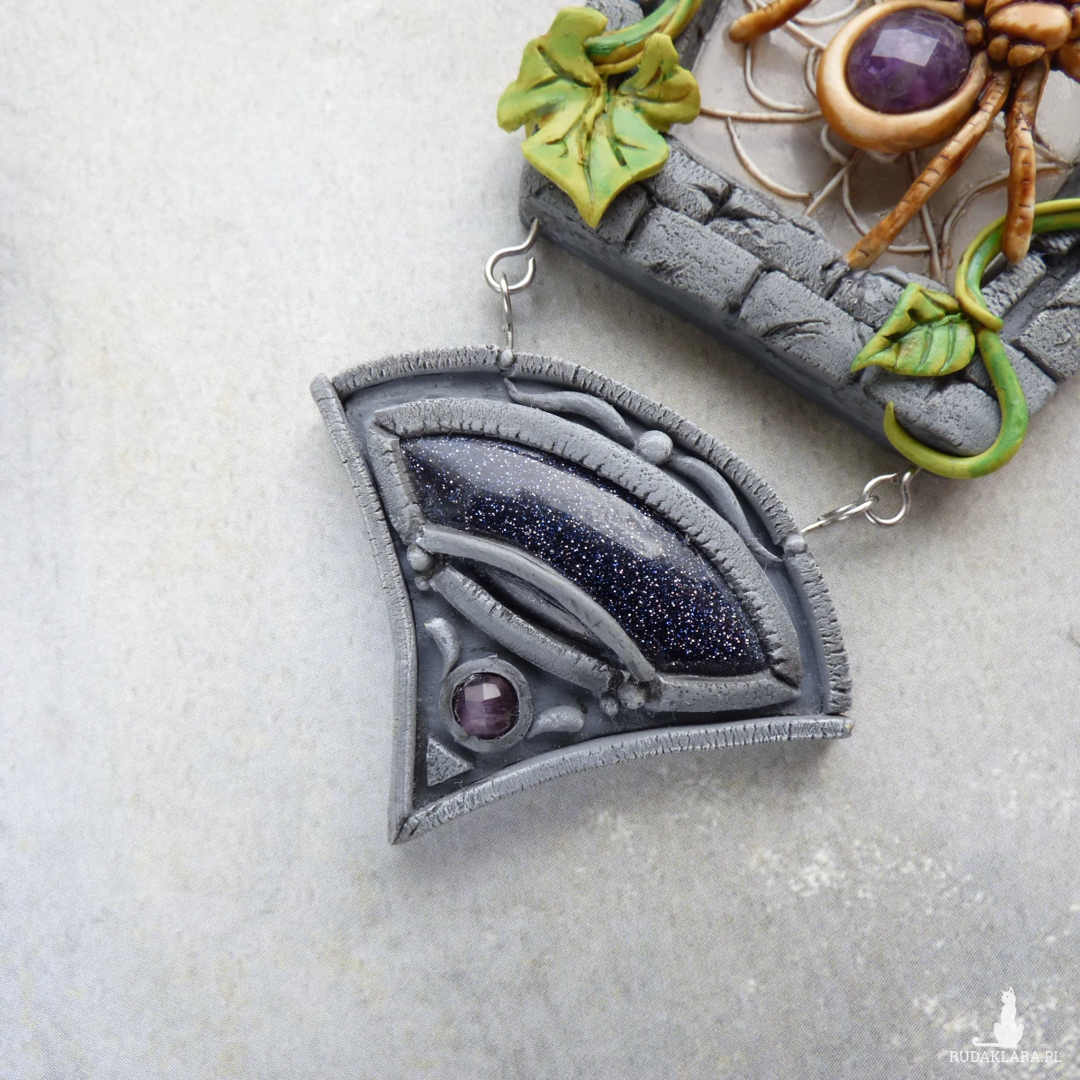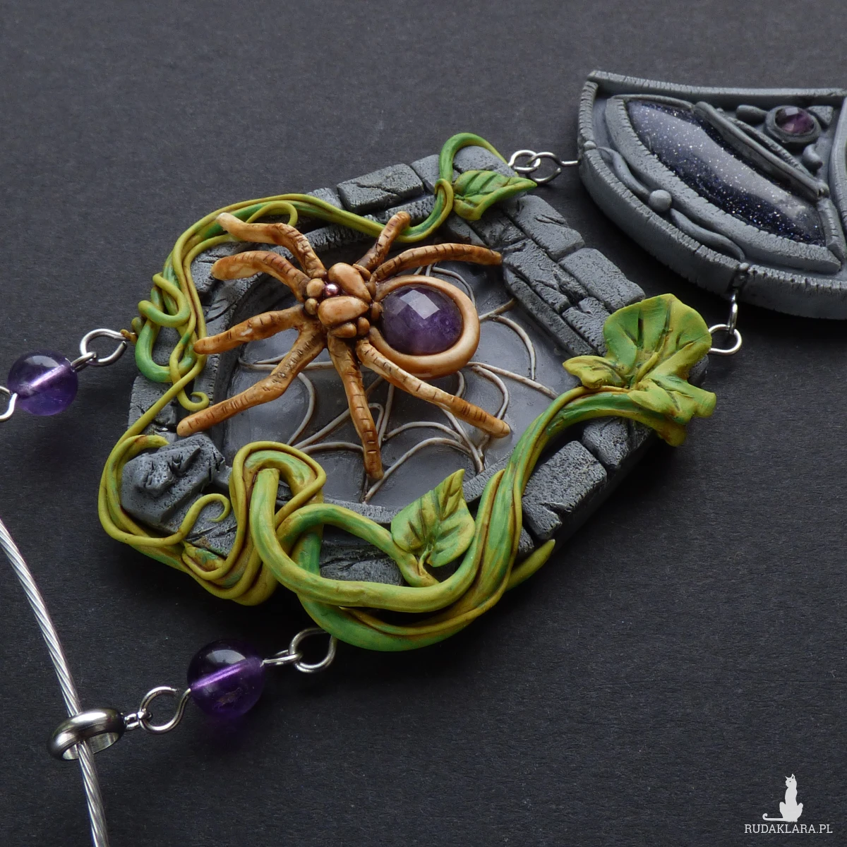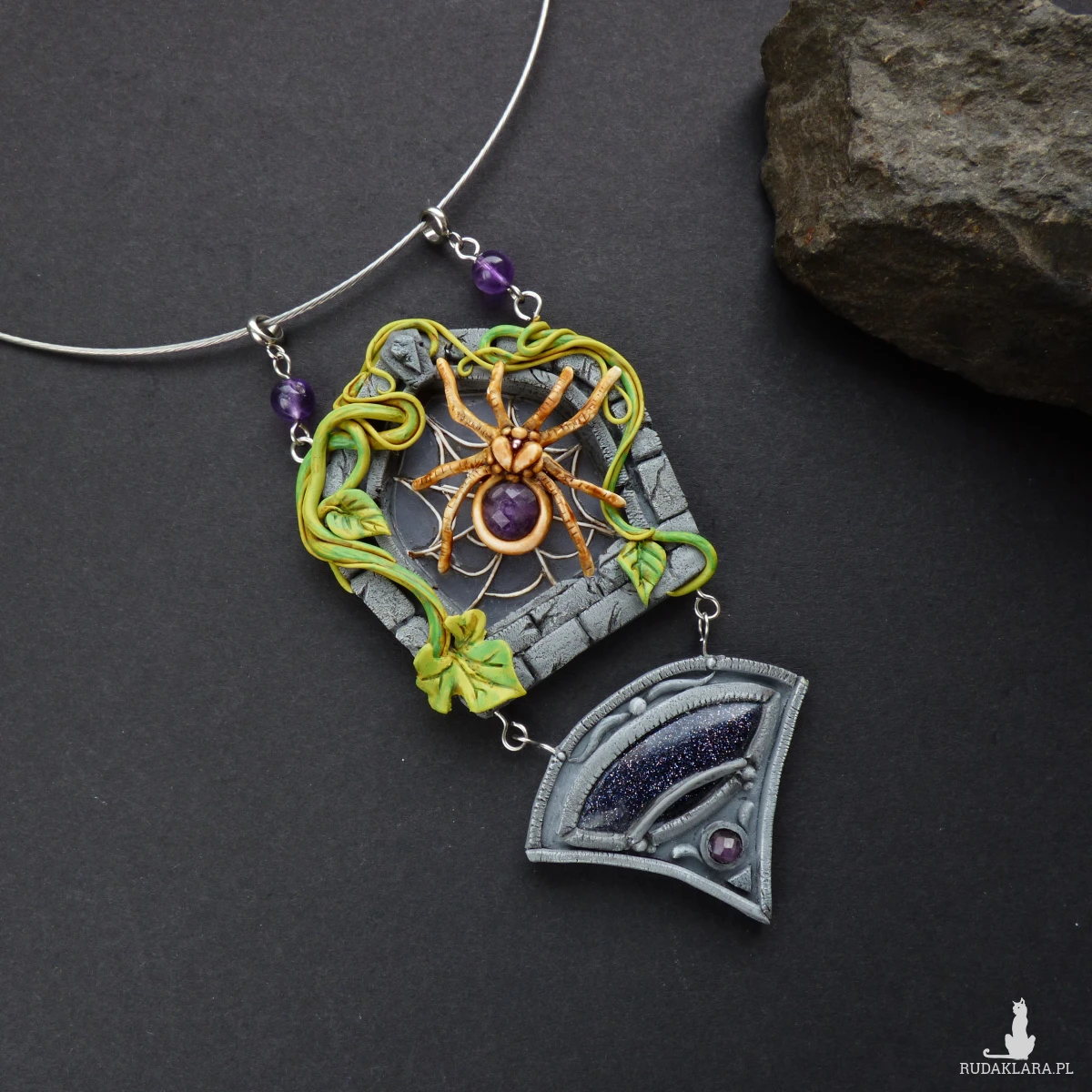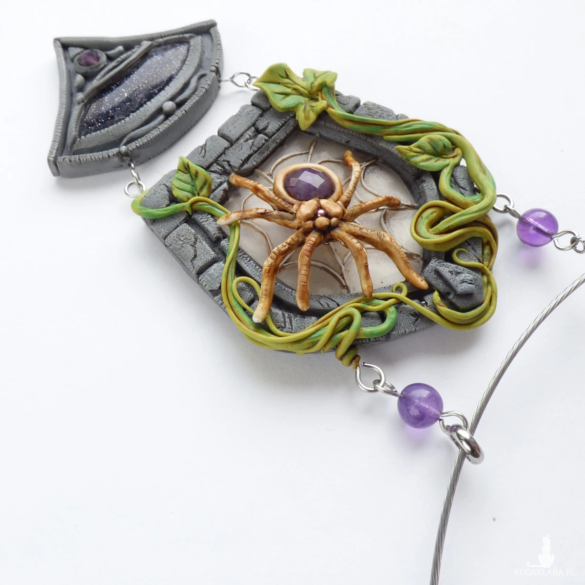 Unikatowy naszyjnik inspirowany pająkiem, który przędzie swoje nici na kamiennym oknie porośniętym pnączami.