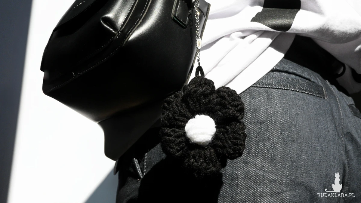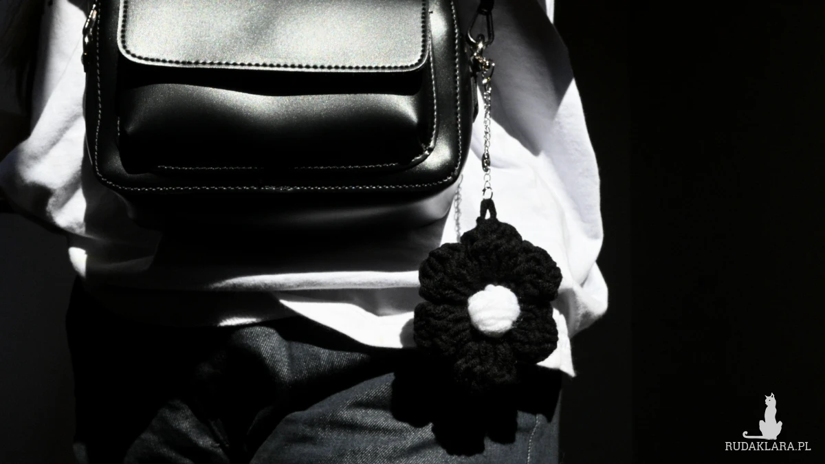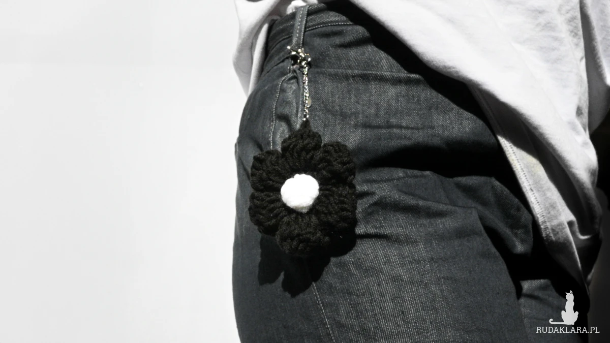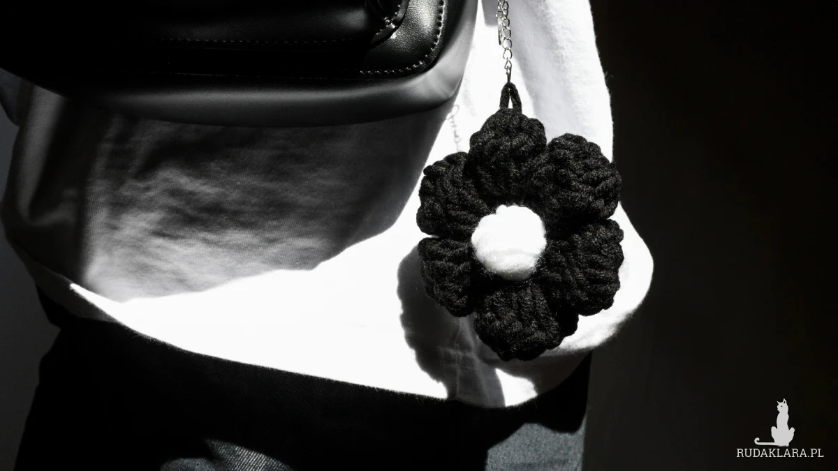 Brelok Eclipse, Ręcznie robiony brelok kwiat z włóczki – elegancki dodatek do torebki lub kluczy