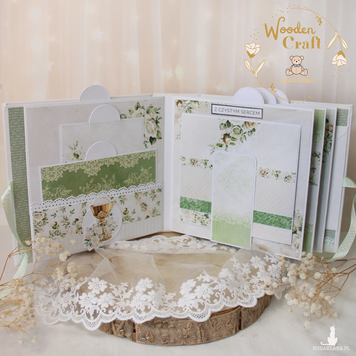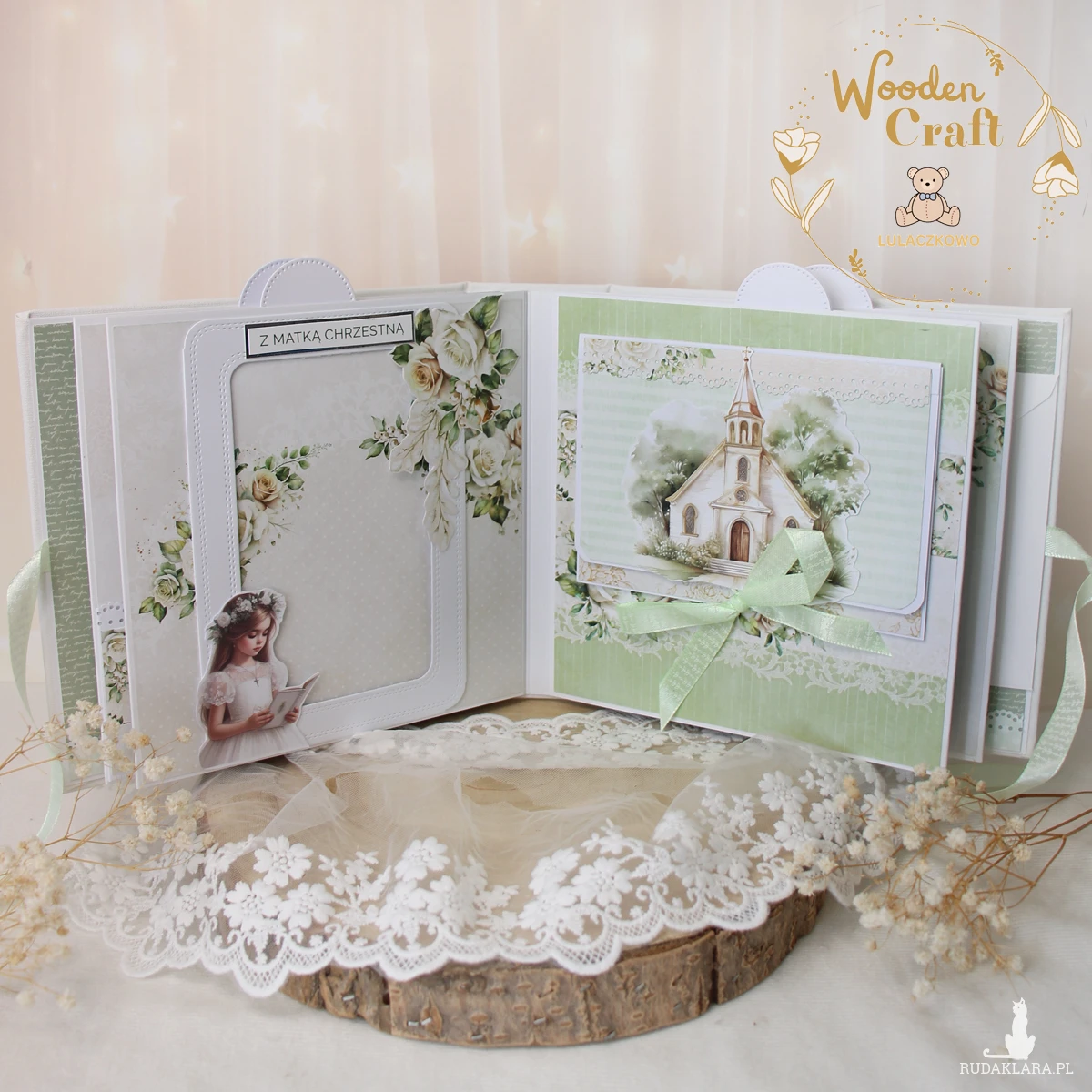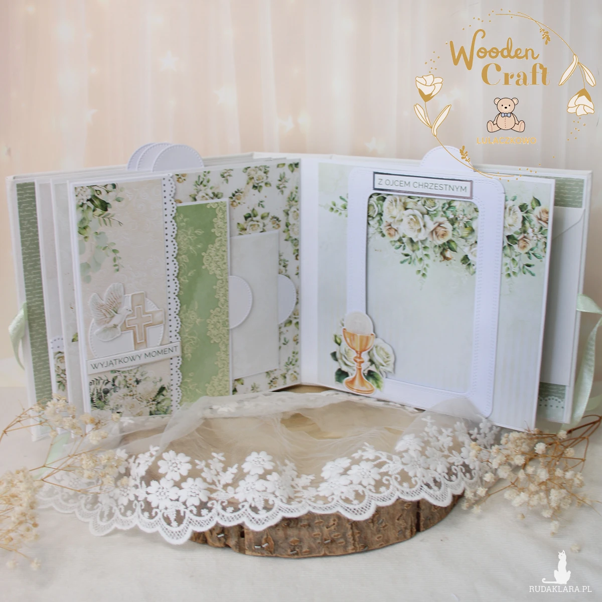 Przepiękny, bogato zdobiony komunijny album na zdjęcia, robiony ręcznie, z dbałością o detale, wykonany z cudownej, kwiatowej kolekcji papierów "White Roses". Idealny jako prezent - pamiątka z okazji Pierwszej Komunii Świętej.