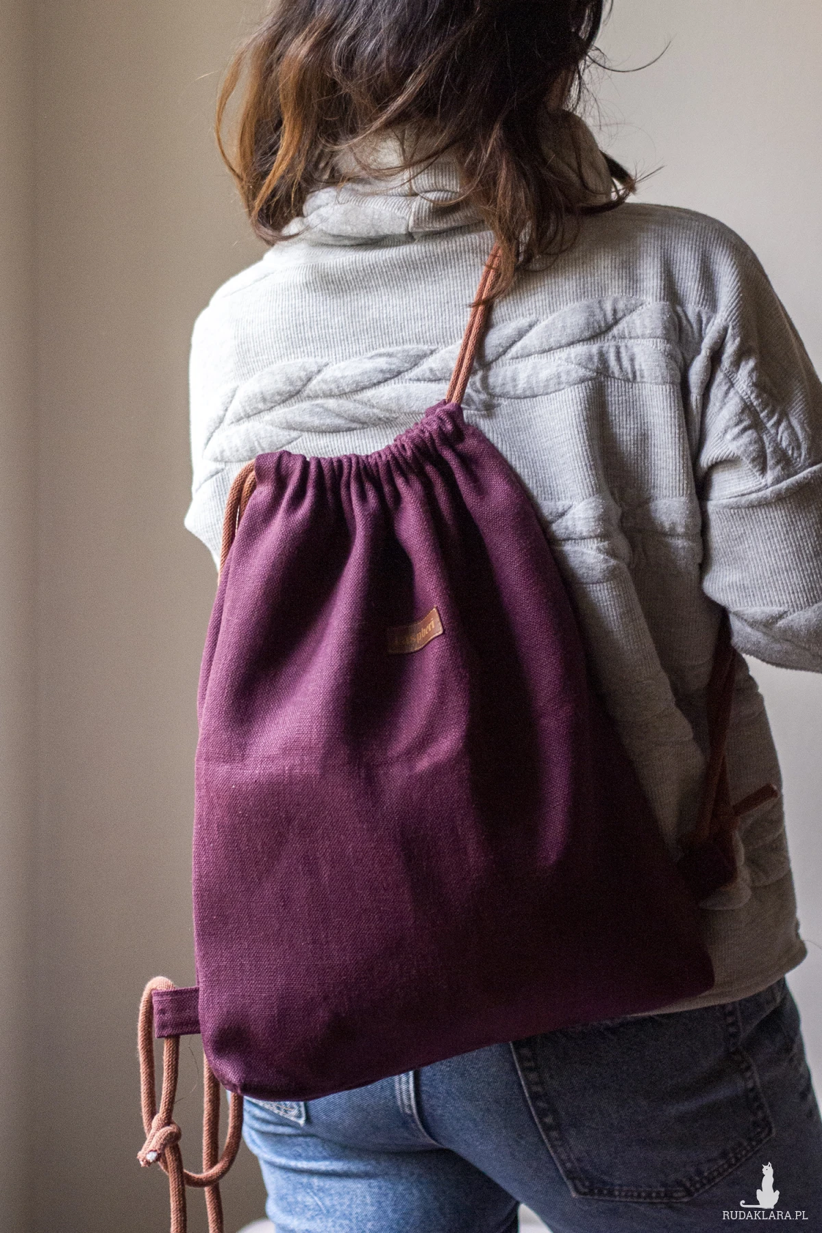 Plecak worek w kolorze burgundowym.