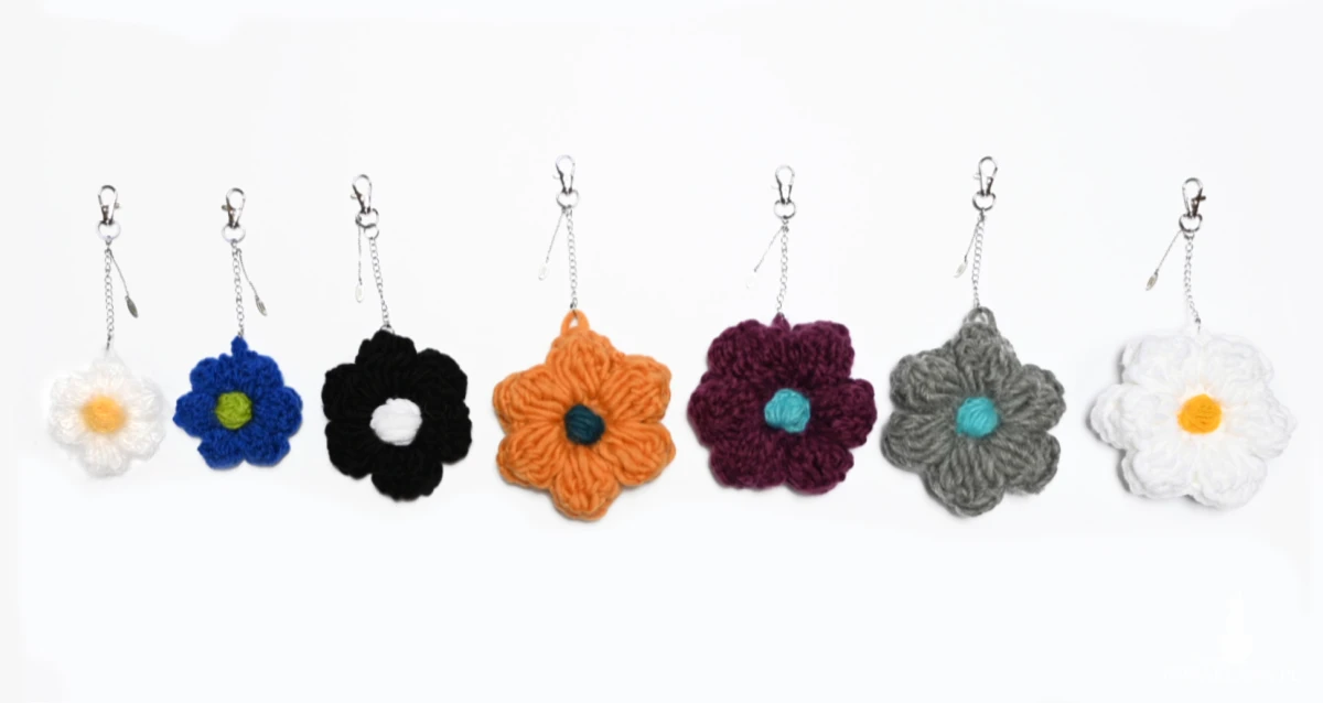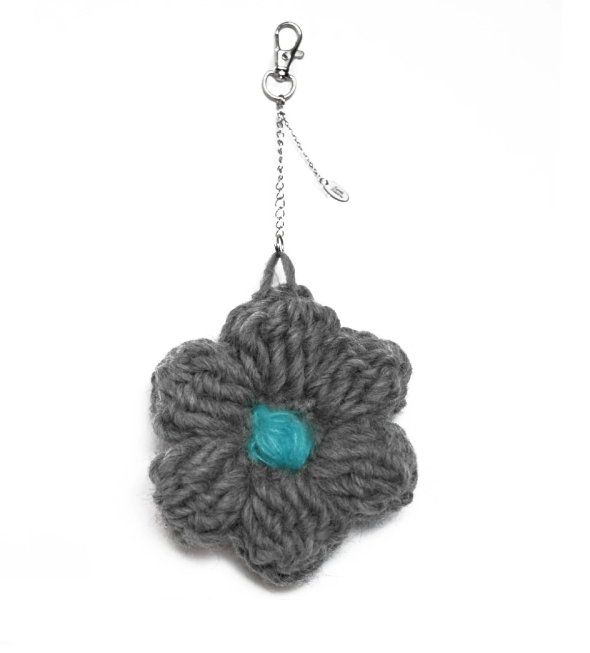 Ręcznie szydełkowany duży brelok w kształcie kwiatka z wełny. Designerski, modny dodatek, który świetnie sprawdzi się przypięty do torebki, kluczy czy jako subtelne dopełnienie codziennej stylizacji. Breloczek wykończony został autorskim charms’em z logo marki – subtelny detal, który podkreśla jego unikalny charakter i nadaje całości elegancji.