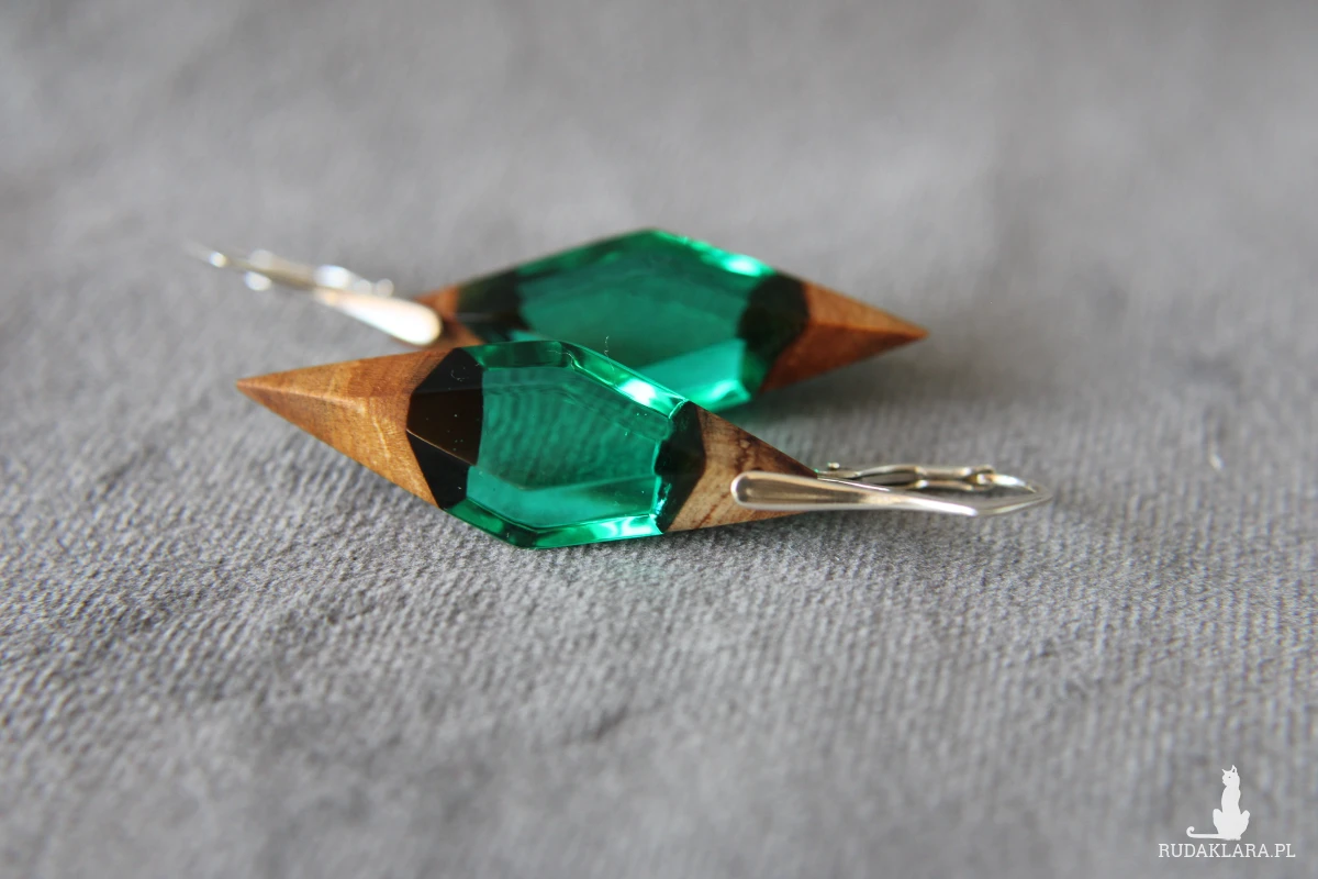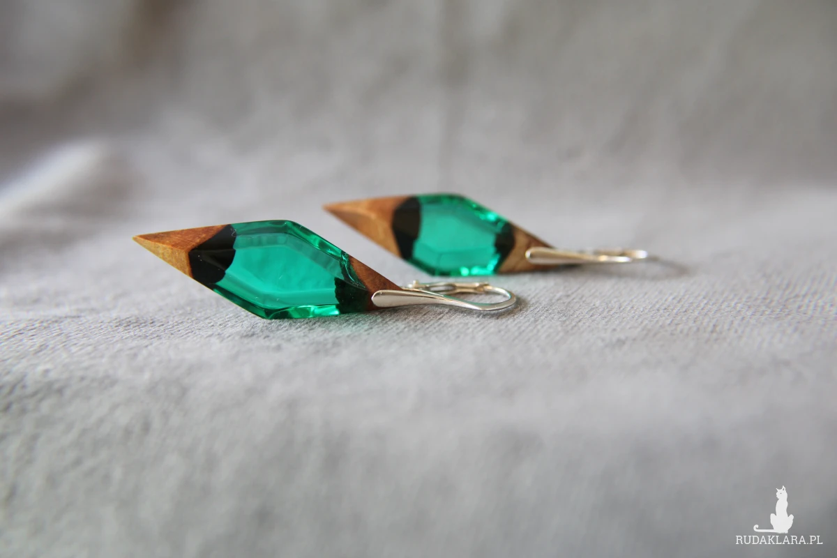 Kolczyki romby z korzeniem jabłoni łączonym zieloną, transparentną żywicą.