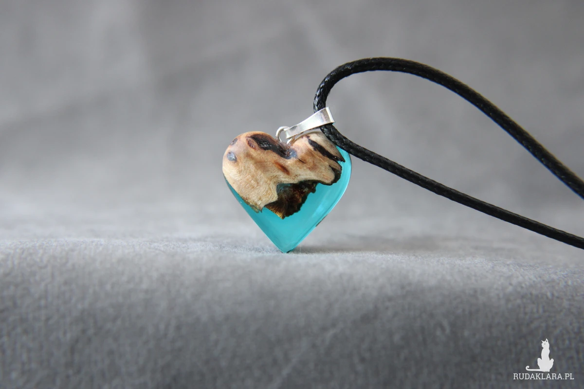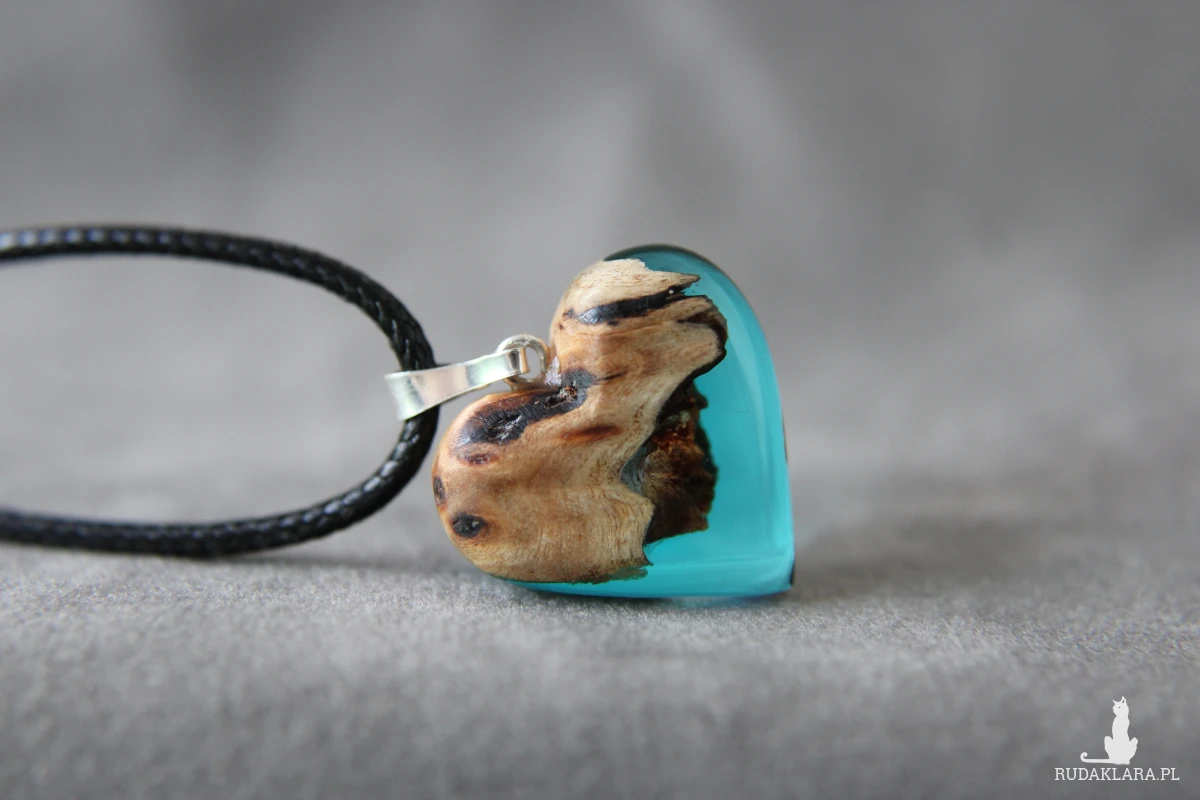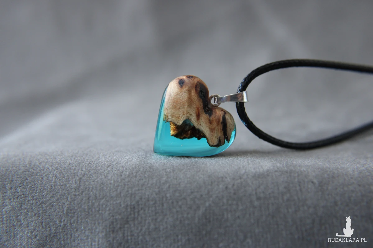 Naszyjnik serce z czeczotą topoli zatopioną w niebieskiej żywicy.