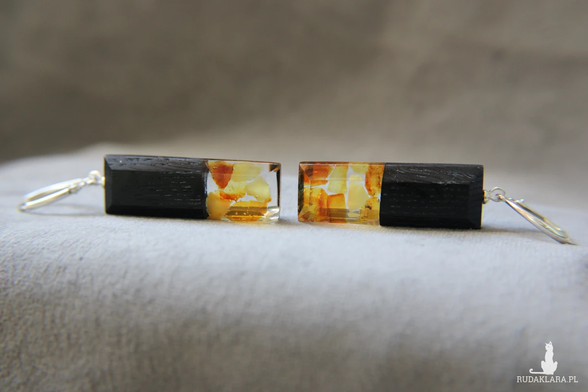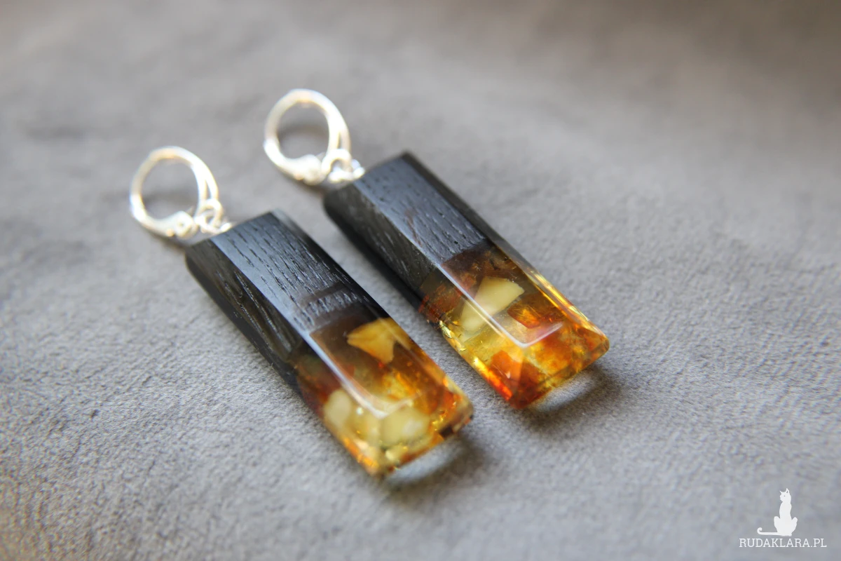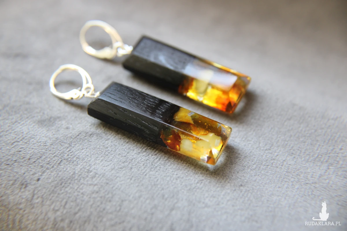 Kolczyki z czarnego dębu z bursztynami zatopionymi w żywicy.