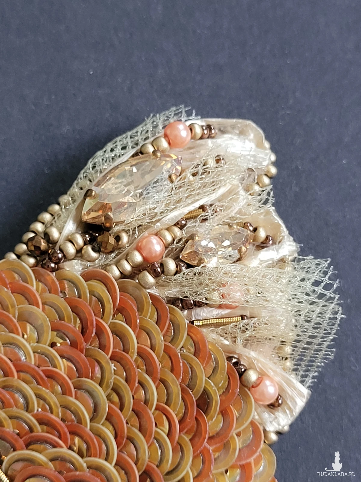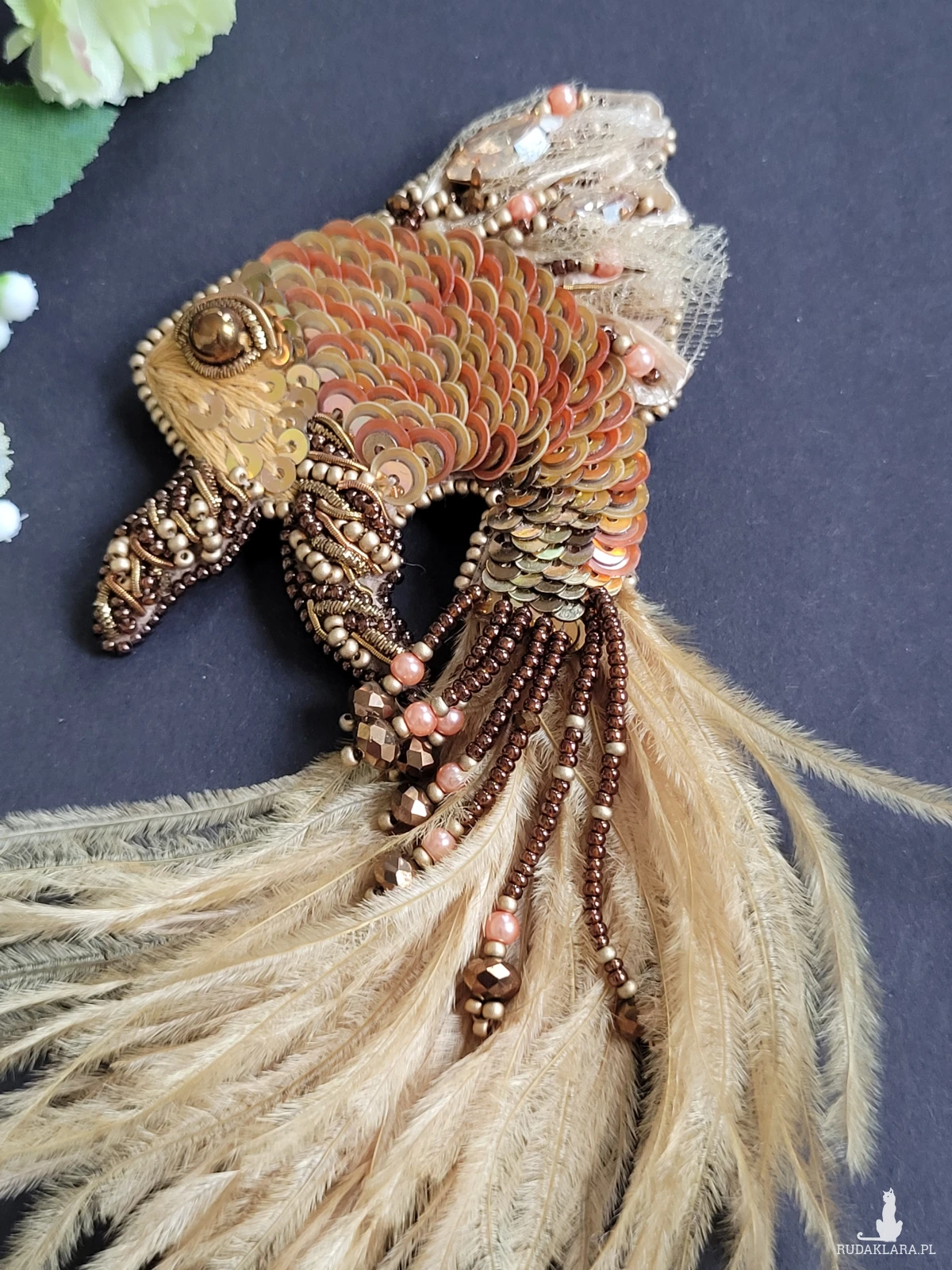 Unikatowa, ręcznie haftowana broszka w kształcie niezwykłej ryby. Połączenie lśniących cekinów, koralików, kryształków i piór sprawia, że ten dodatek jest prawdziwym dziełem sztuki!