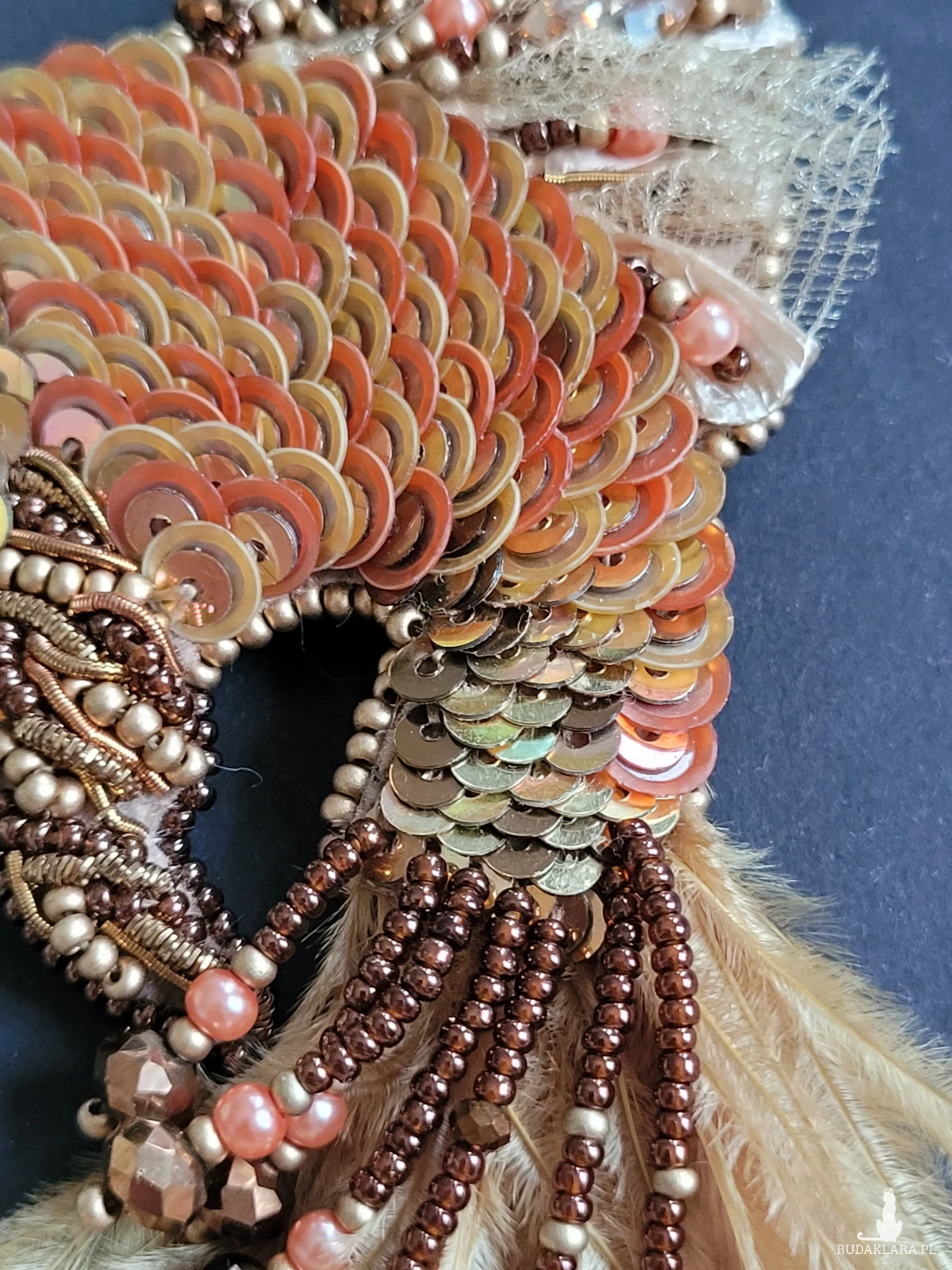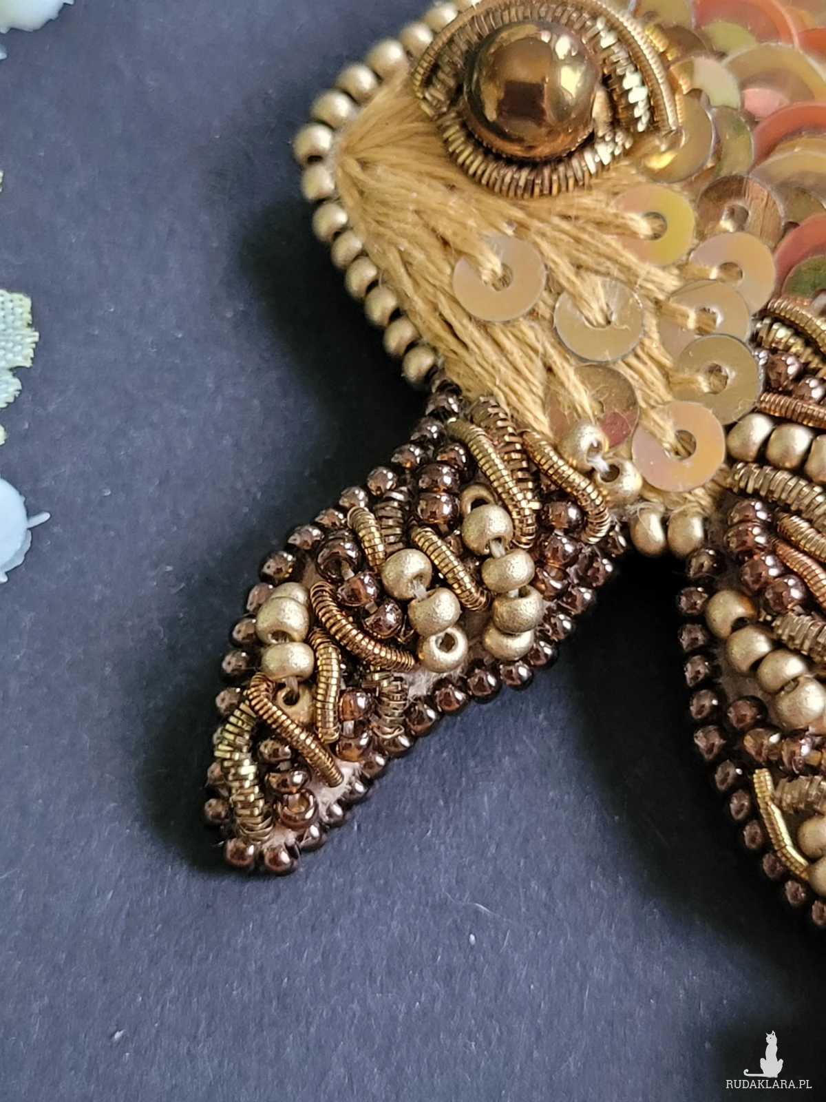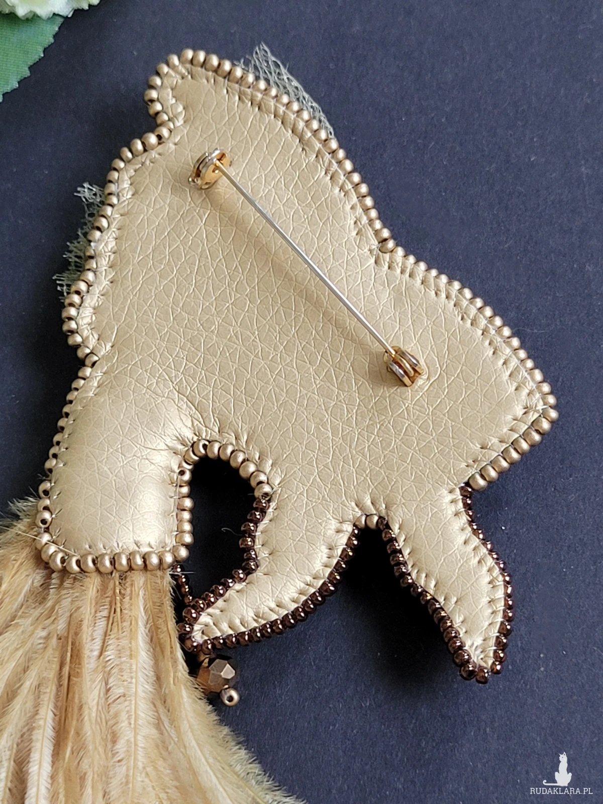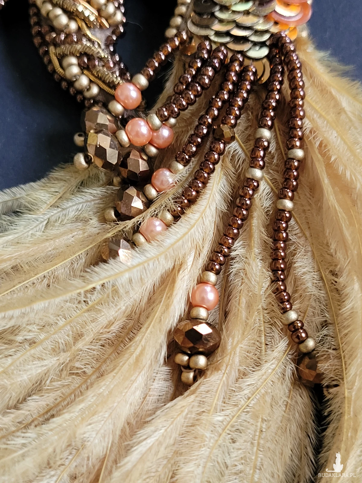 💛 Odcienie ecru, złota i brązu nadają broszce elegancji i magicznego uroku. Pióra subtelnie poruszają się przy każdym ruchu i nadają lekkości.