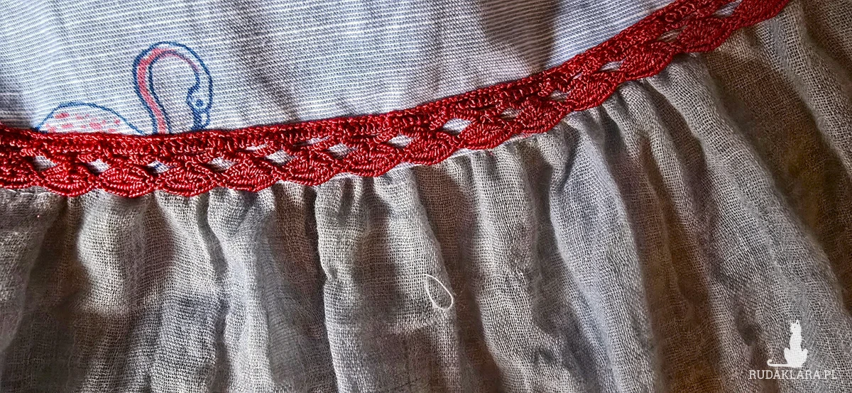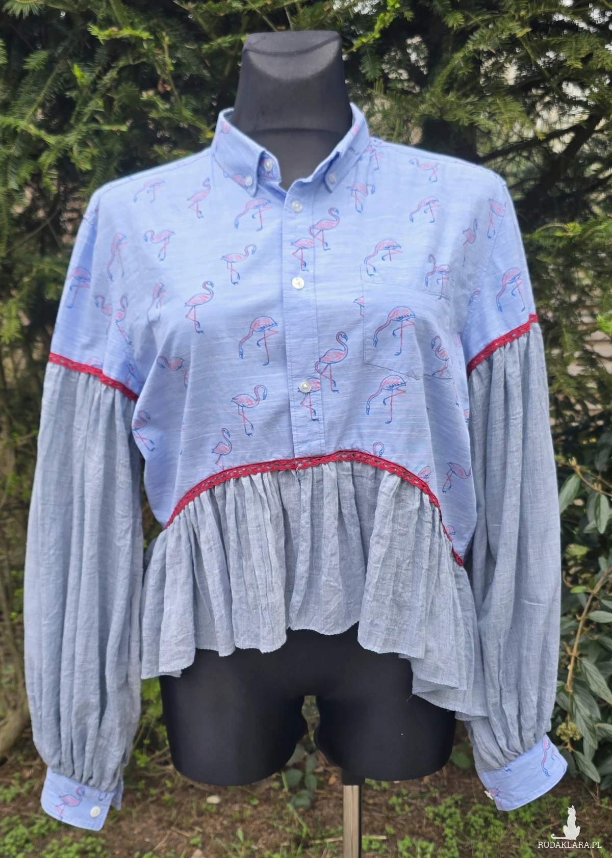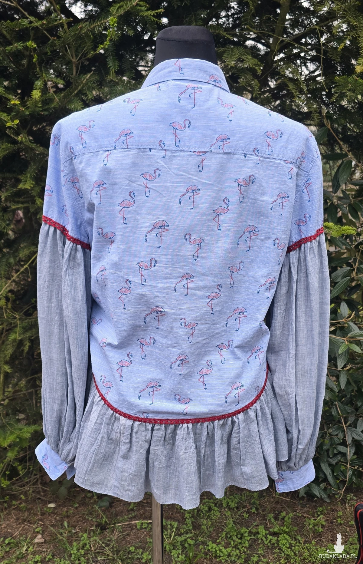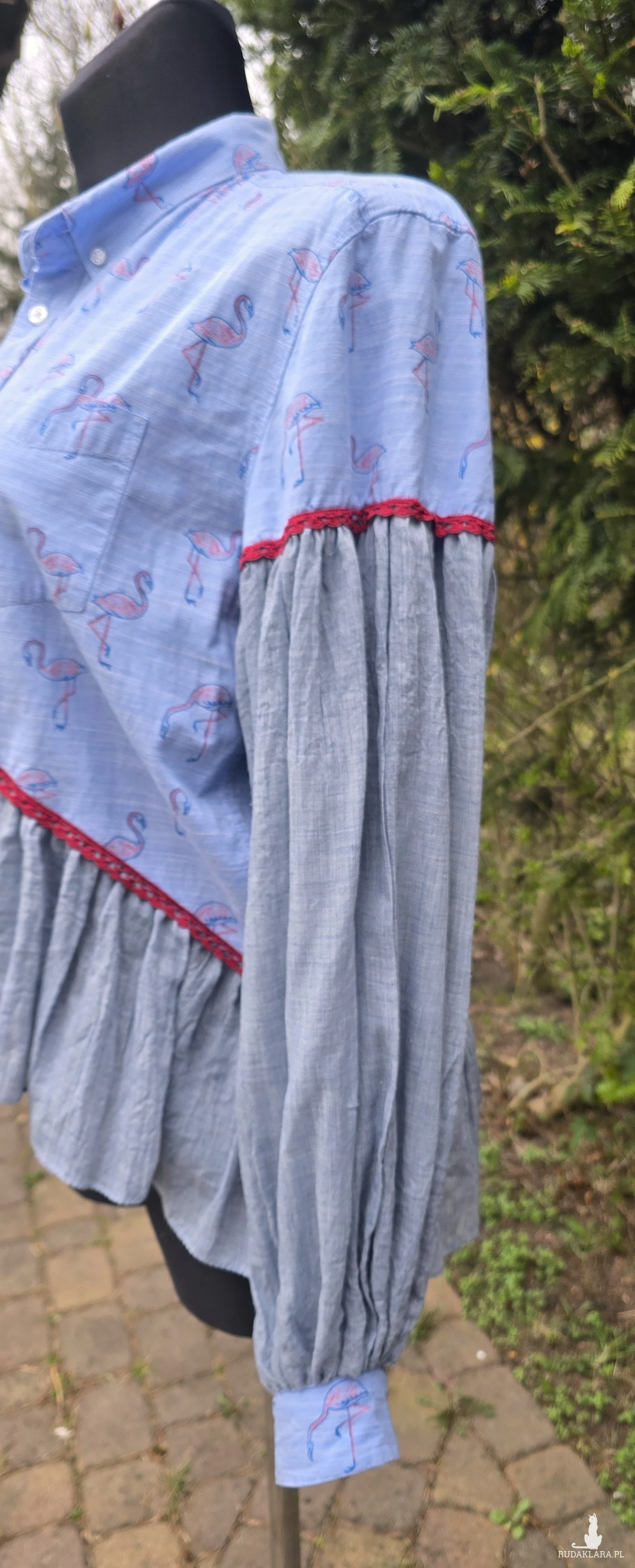 Koszula w stylu boho uszyta zgodnie z ideą 'zero waste'. Wygodny oversize, przyjemna w dotyku grubsza bawełna. Urocze flamingi, niesymetryczny dół (różnica między przodem a tyłem 20 cm), falbanka i bardzo szerokie rękawy oraz dekoracyjna czerwona tasiemka moim zdaniem stworzyły unikalny i oryginalny image.
