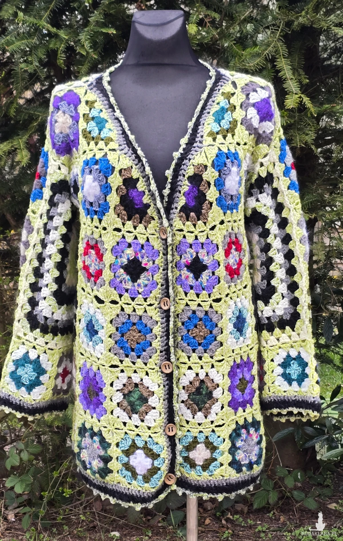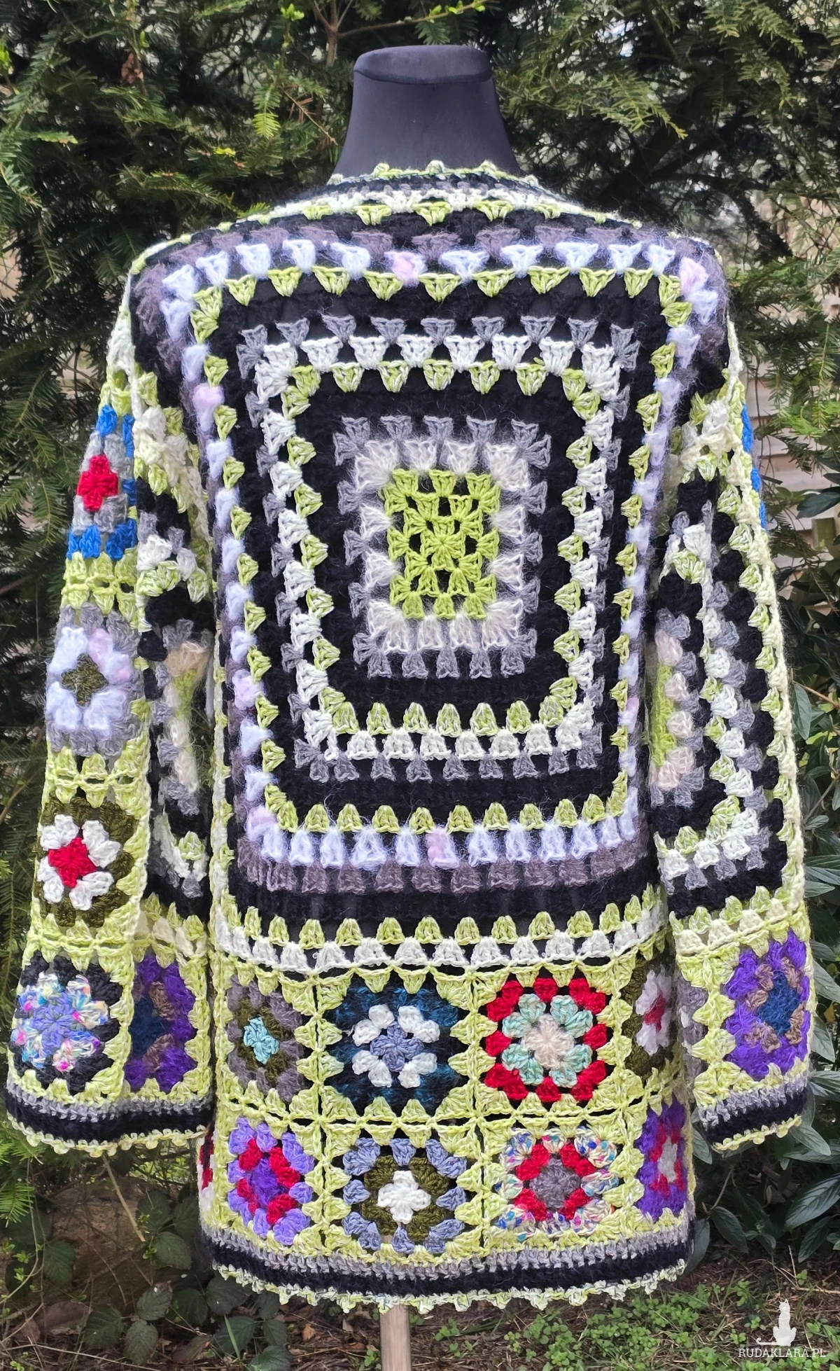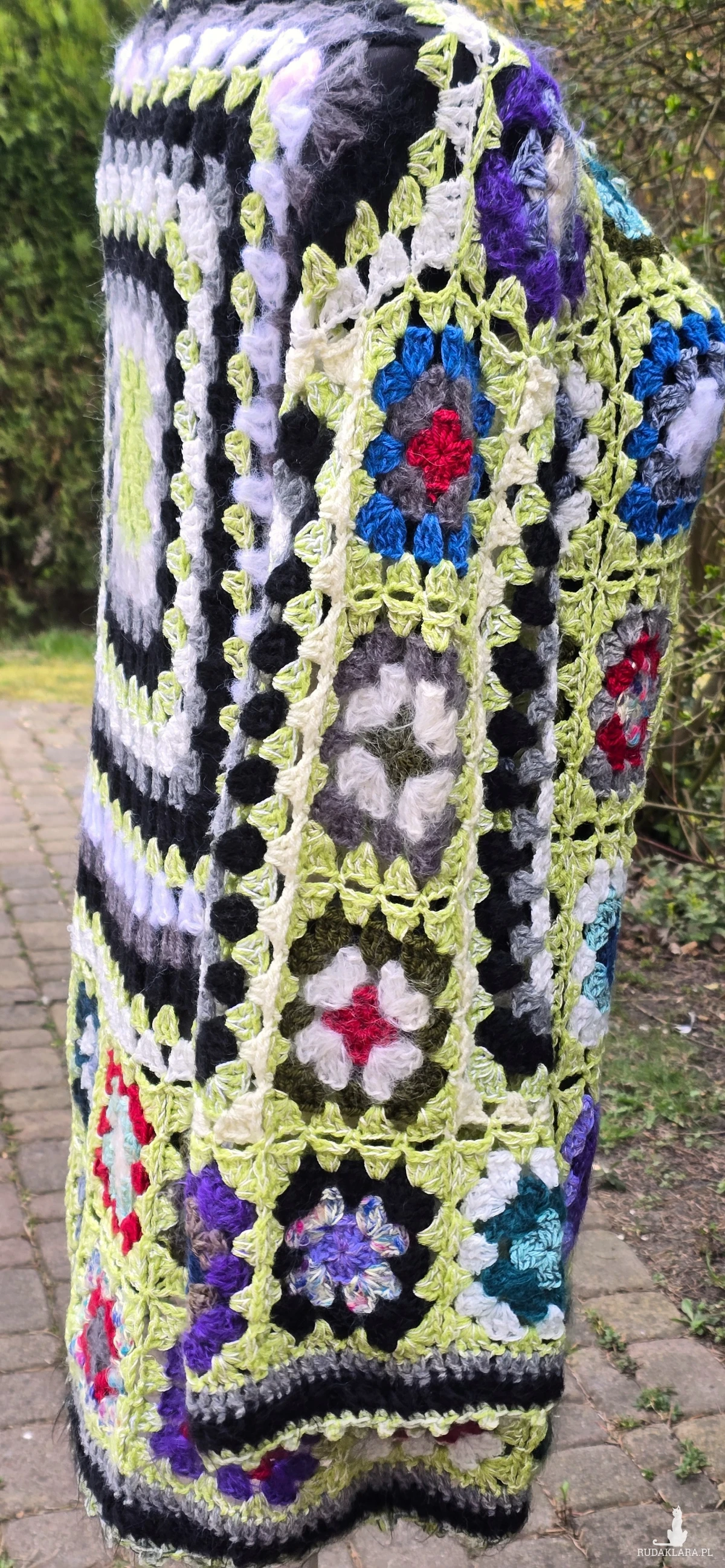 Kwadraty łączyłam szydełkiem podczas pracy, a zatem sweter jest bezszwowy. Przody wykonane z takich samych kwadratów w takim samym położeniu, a zatem są lustrzanym odbiciem (tak samo rękawy). Sweter obrobiony dookoła (włącznie z rękawami) dekoracyjnymi pikotkami