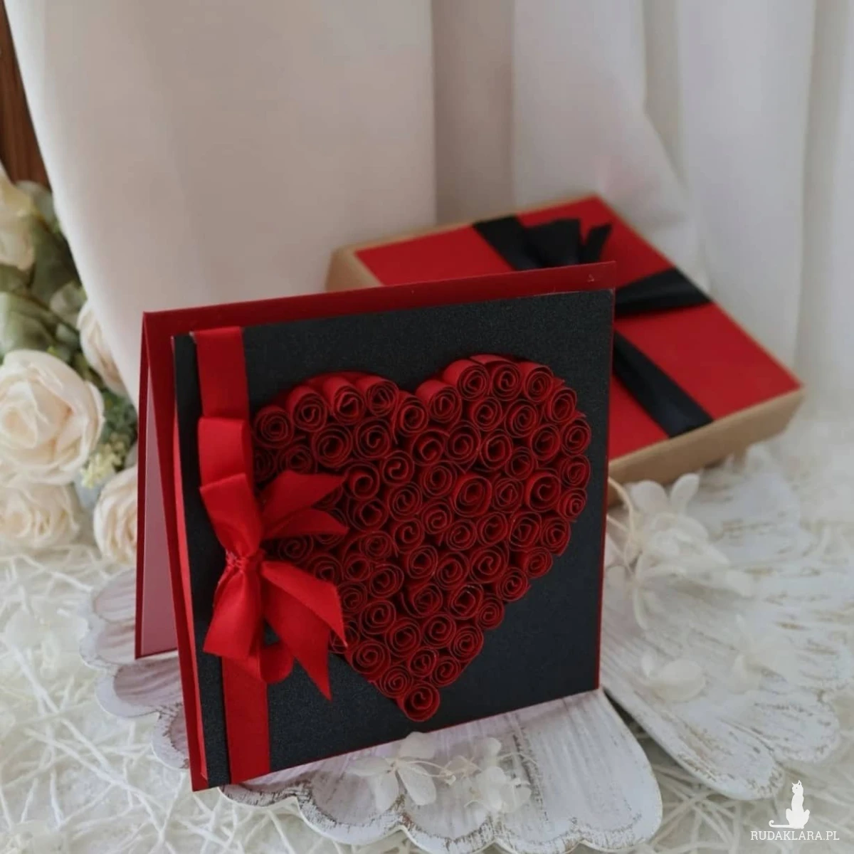 Otwierasz pudełko i od razu wiesz, że to będzie „ten” moment. Czerń podkreśla głębię, serce 3D pulsuje czerwienią, a kokarda dodaje świątecznego charakteru. Na przodzie kartki wpiszę Wasze imiona lub datę, a w środku – Twoje życzenia, tak by całość brzmiała dokładnie tak, jak chcesz. Na życzenie dodam kieszonkę – dyskretną i elegancką. To romantyczny prezent dla niej lub dla niego: na rocznicę, Walentynki albo po prostu „bo Ty”.
