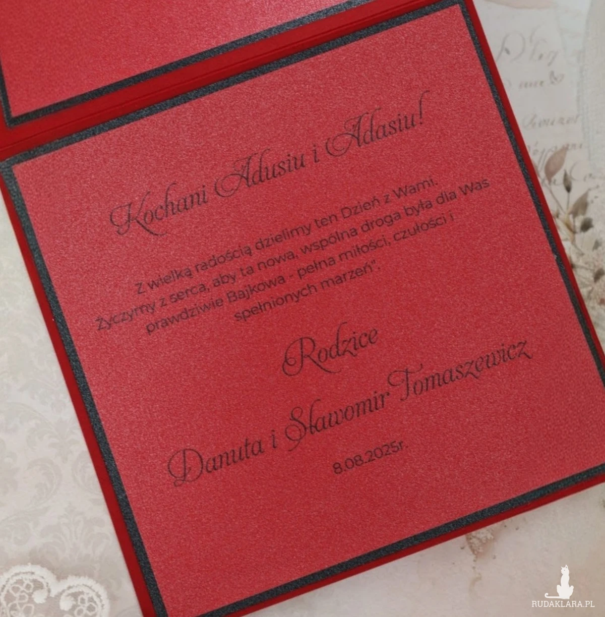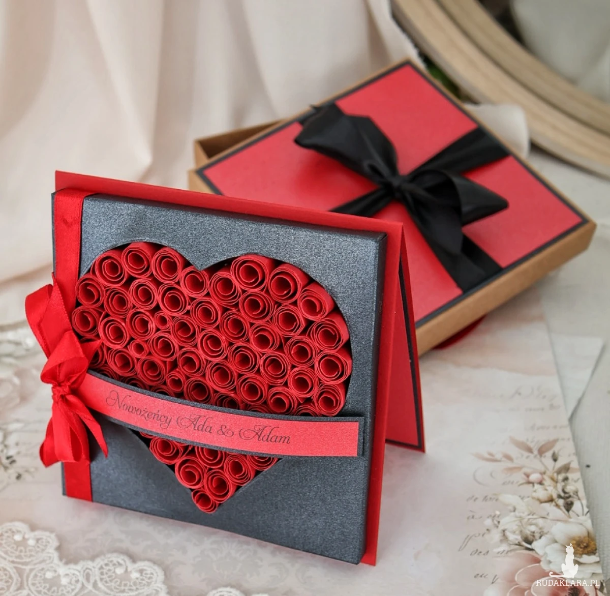 Intensywna czerwień połączona z elegancką czernią tworzy wyrazistą, a jednocześnie stylową kompozycję. Na przodzie kartki znajduje się serce wykonane z ręcznie zwijanych ruloników papieru oraz imiona - detal, który przyciąga uwagę i nadaje całości wyjątkowy charakter.