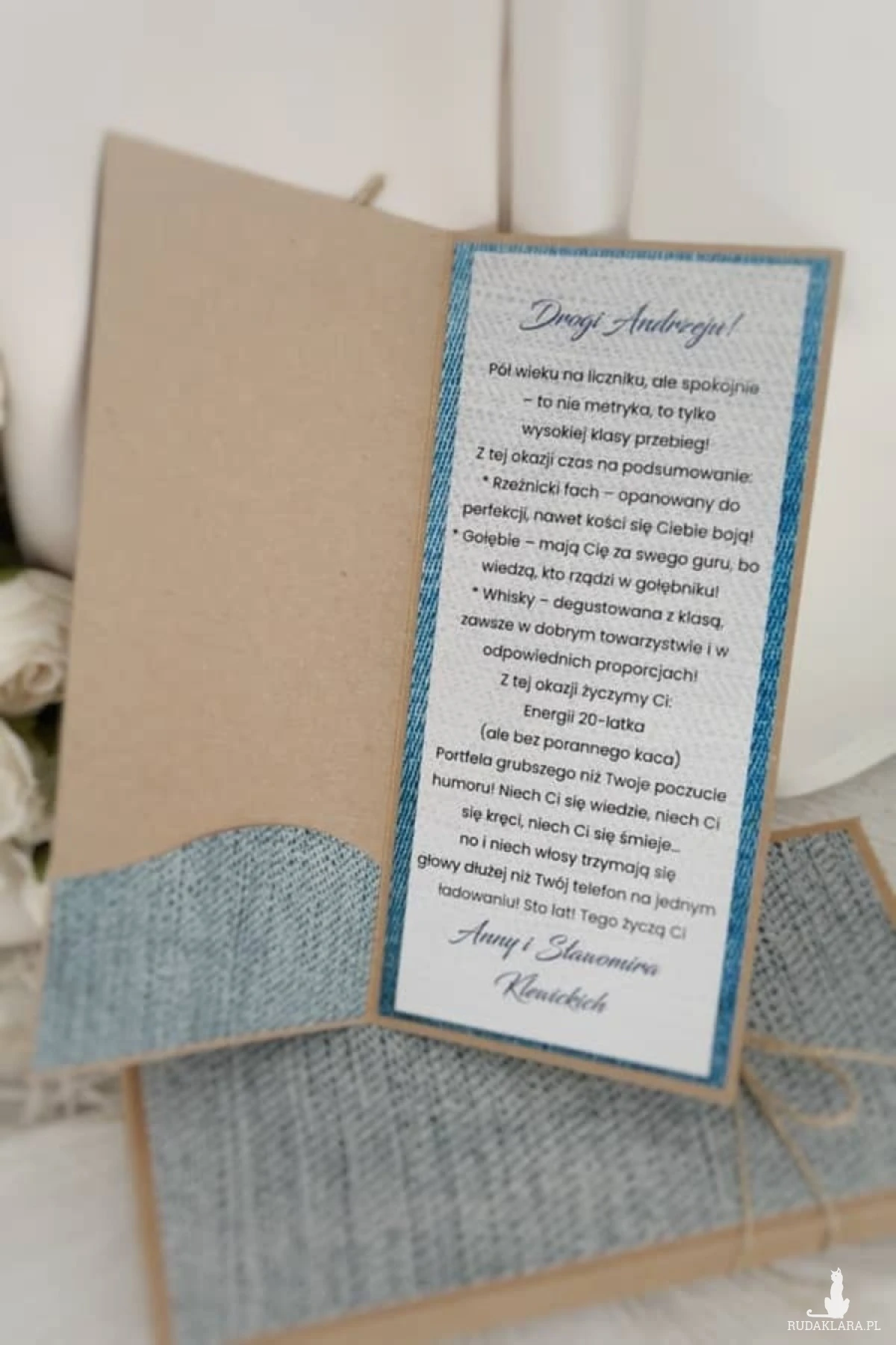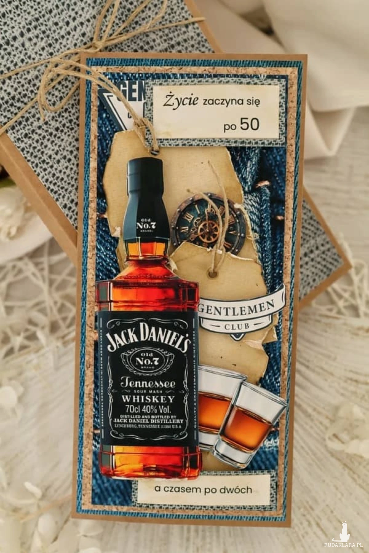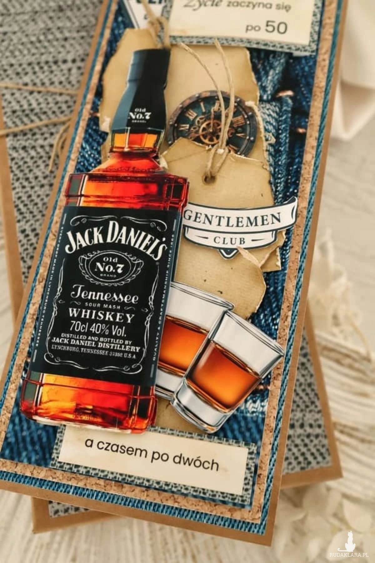 Gotowy prezent bez biegania po dodatki. Kartka w kraftowym pudełku, nawiązująca do klimatu „gentlemen’s club”: whisky, denim, zegarek. Na przodzie kartki umieszczę imię i wiek, a w środku – Twoje życzenia (druk). Mogę dodać kieszonkę na pieniądze lub voucher, jeśli chcesz połączyć elegancję z praktycznym akcentem.