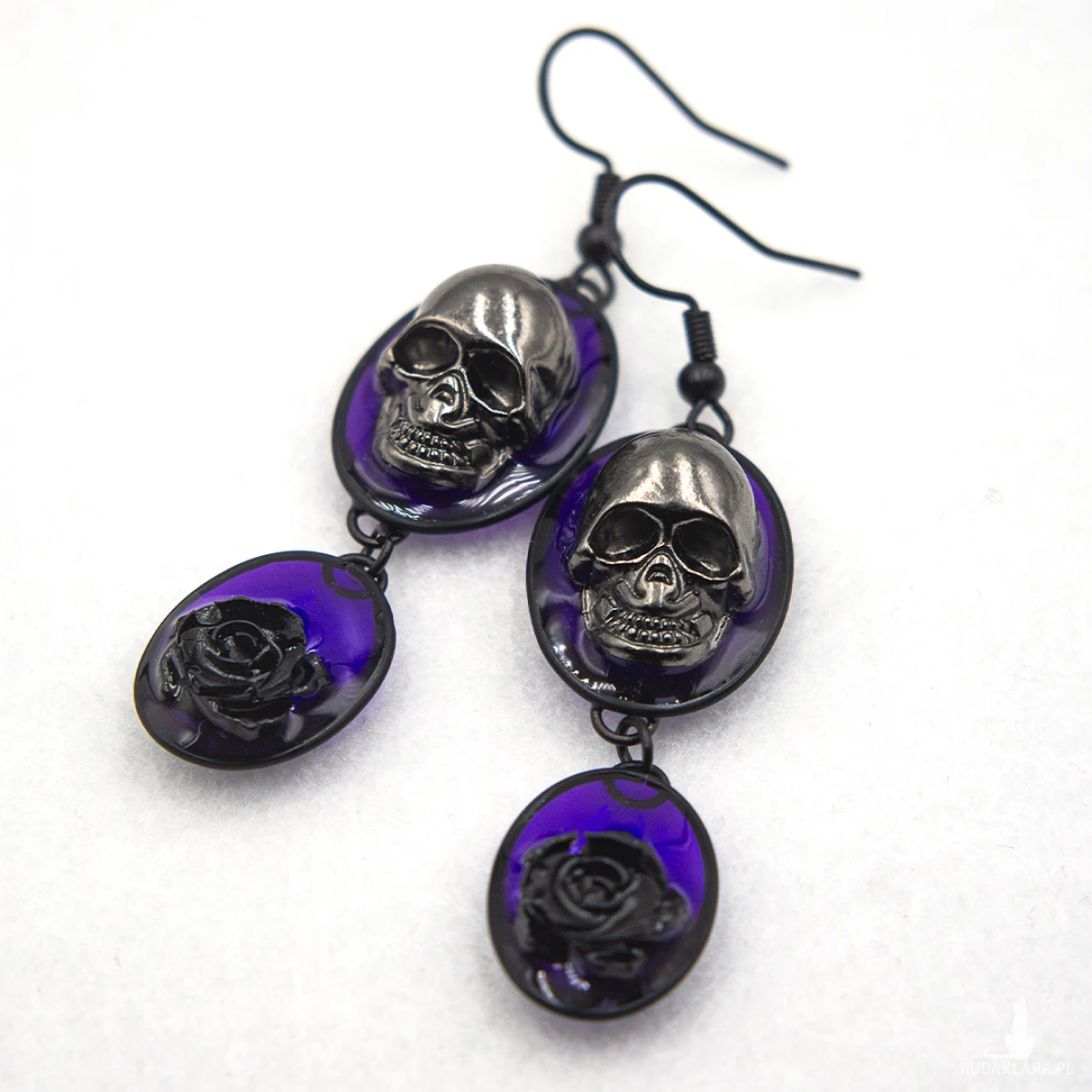 Zaprojektowane i ręcznie wykonane przeze mnie unikalne kolczyki w klasycznym gotyckim stylu z czaszką, dla wszystkich fanów "czarnej sceny". Należę do niej od blisko 30 lat i dlatego tworzę biżuterię, która może wydawać się mniej "gotycka" niż inne wzory, tzn. mniej wizualnie wybujała, ale skierowana jest przede wszystkim do tych, którzy cenią sobie subtelność bez utraty podstawowych gotyckich cech. Choć w zasadzie czarne, to czaszki mają oryginalny metaliczny fioletowo-zielony połysk.