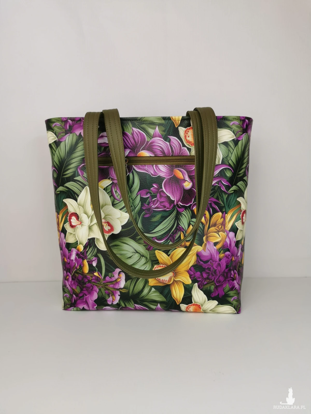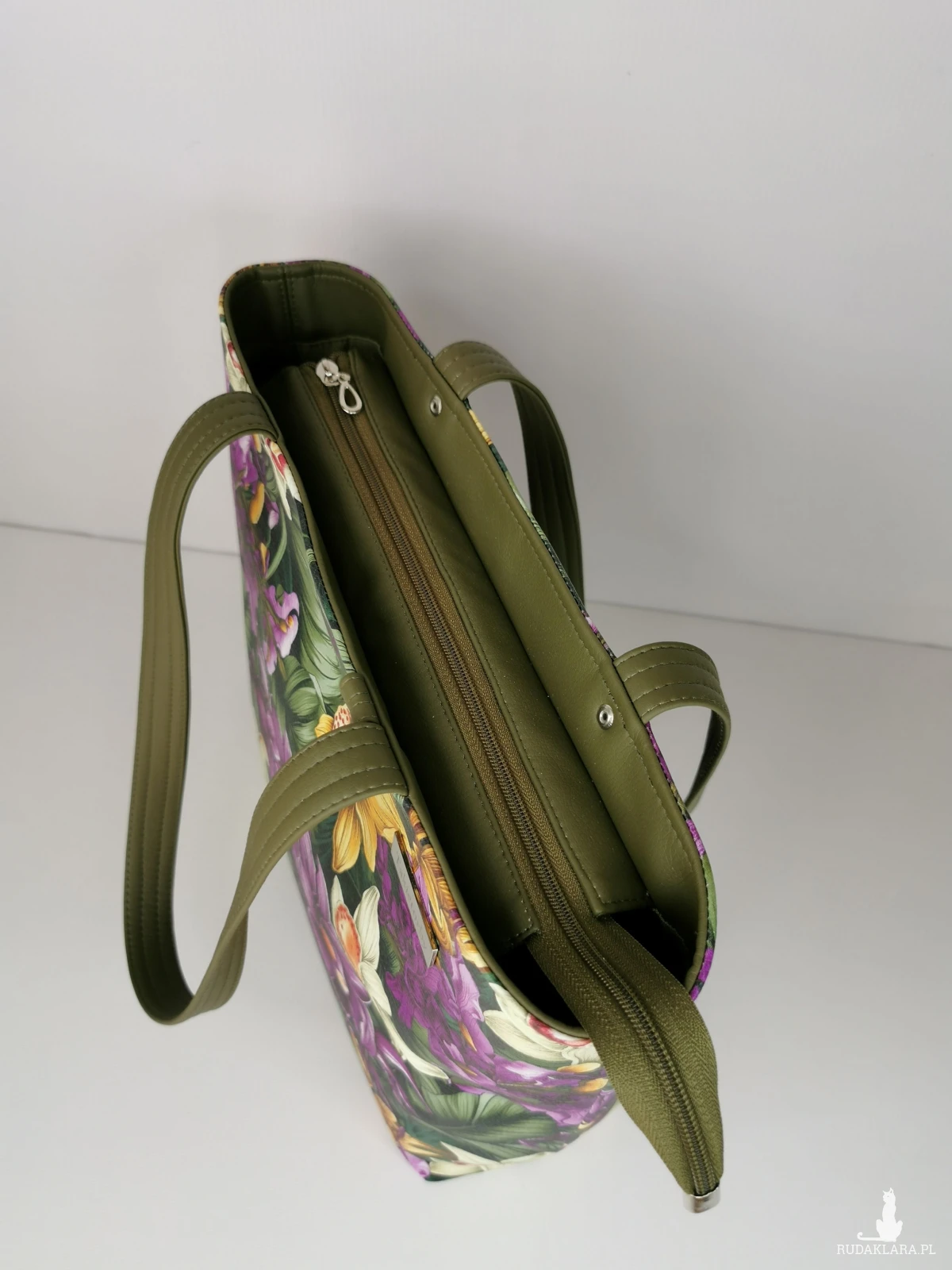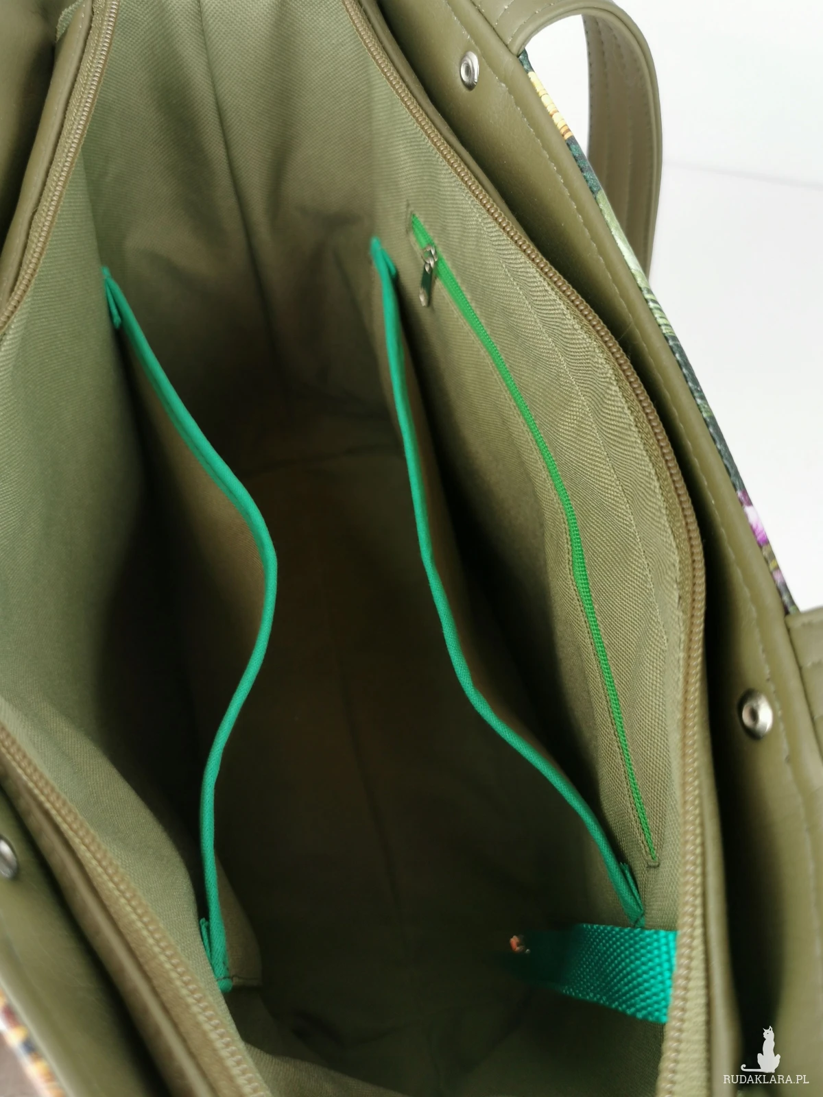 Torebka typu shopper bag duża , pakowna . Idealna na co dzień , na spacer , na zakupy , do pracy lub na wyjazd . Została wykonana z grubej wzorzystej ekoskóry kaletniczej . Jest zamykana na zamek . Na tylnej ścianie torebki pojemna kieszeń zamykana na zamek . Podszewka z tkaniny poliestrowej wodoodpornej w kolorze zielonym . Wewnątrz znajdziesz trzy pojemne kieszenie , w tym jedna na zamek . Jest też zamontowana smycz z karabińczykiem na klucze . Uchwyty torebki wzmocnione nitami .