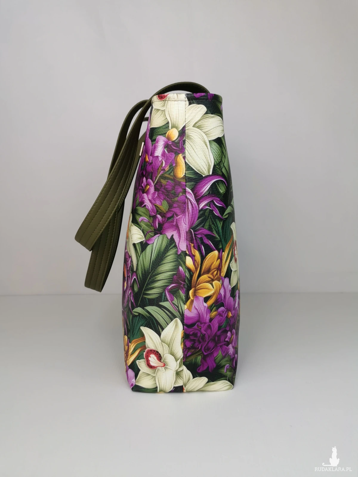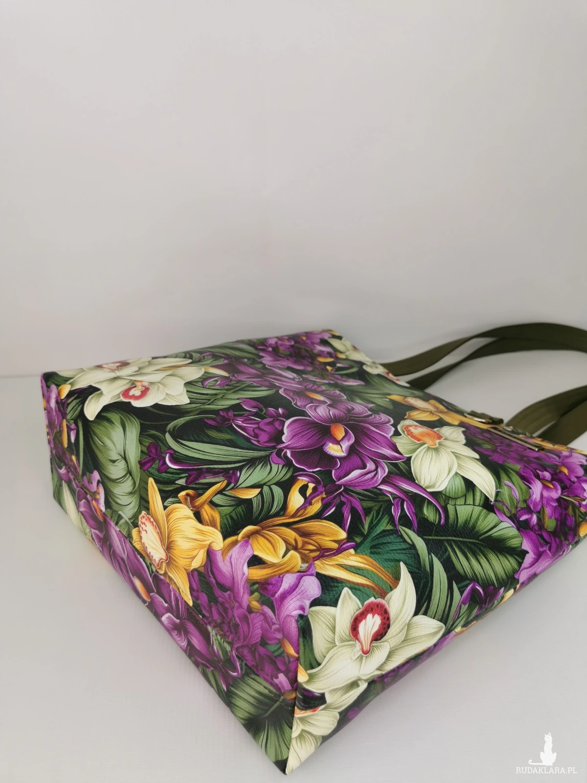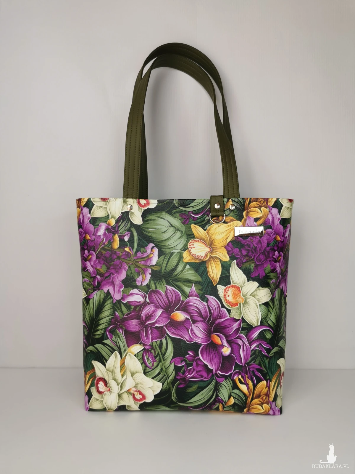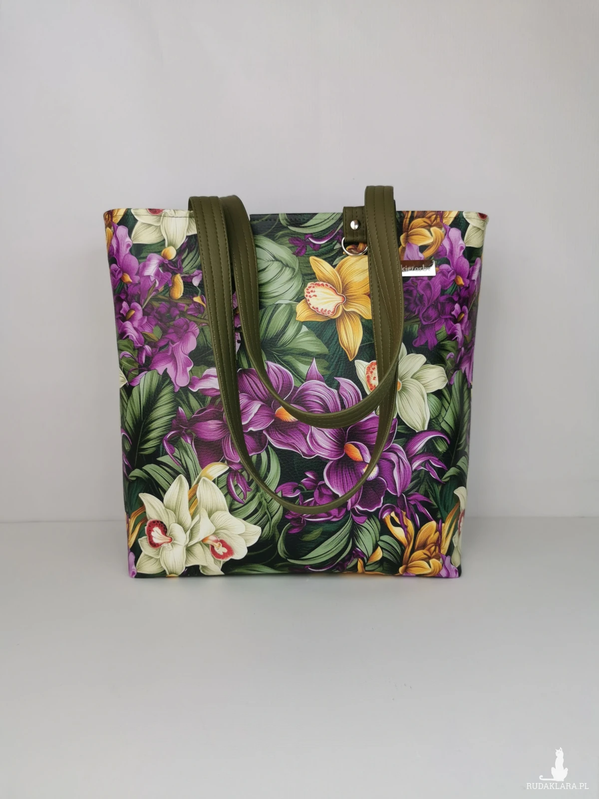 Torebka typu shopper bag duża , pakowna . Idealna na co dzień , na spacer , na zakupy , do pracy lub na wyjazd . Została wykonana z grubej wzorzystej ekoskóry kaletniczej . Jest zamykana na zamek . Na tylnej ścianie torebki pojemna kieszeń zamykana na zamek . Podszewka z tkaniny poliestrowej wodoodpornej w kolorze zielonym . Wewnątrz znajdziesz trzy pojemne kieszenie , w tym jedna na zamek . Jest też zamontowana smycz z karabińczykiem na klucze . Uchwyty torebki wzmocnione nitami .
