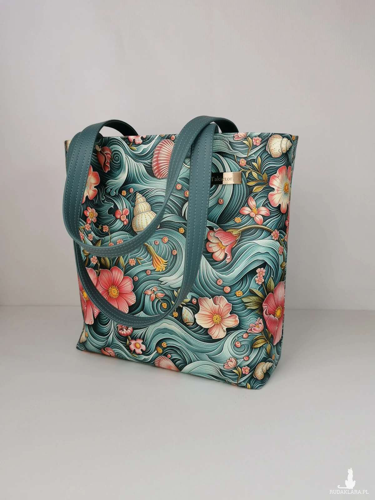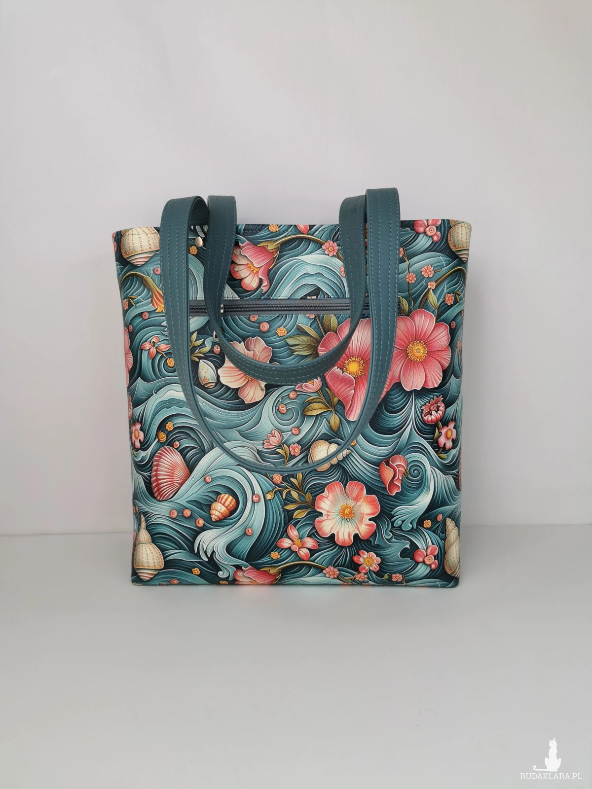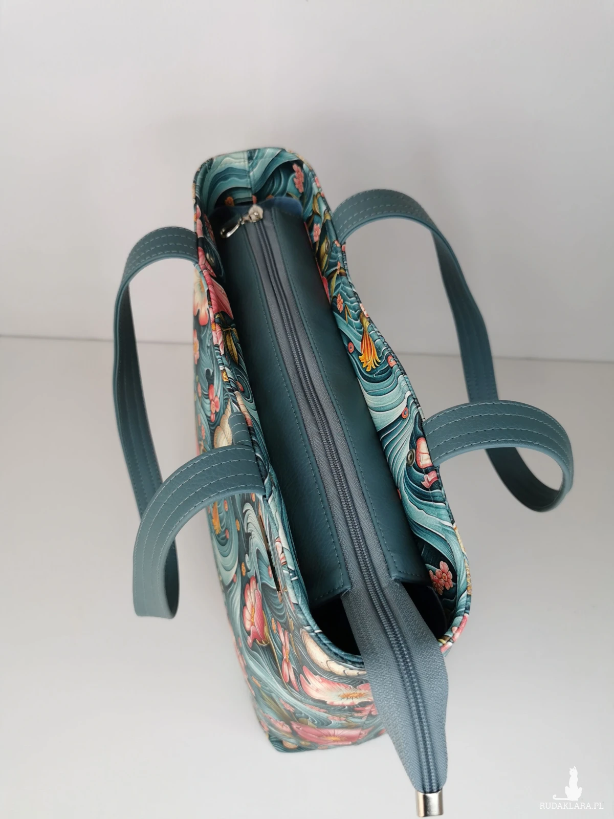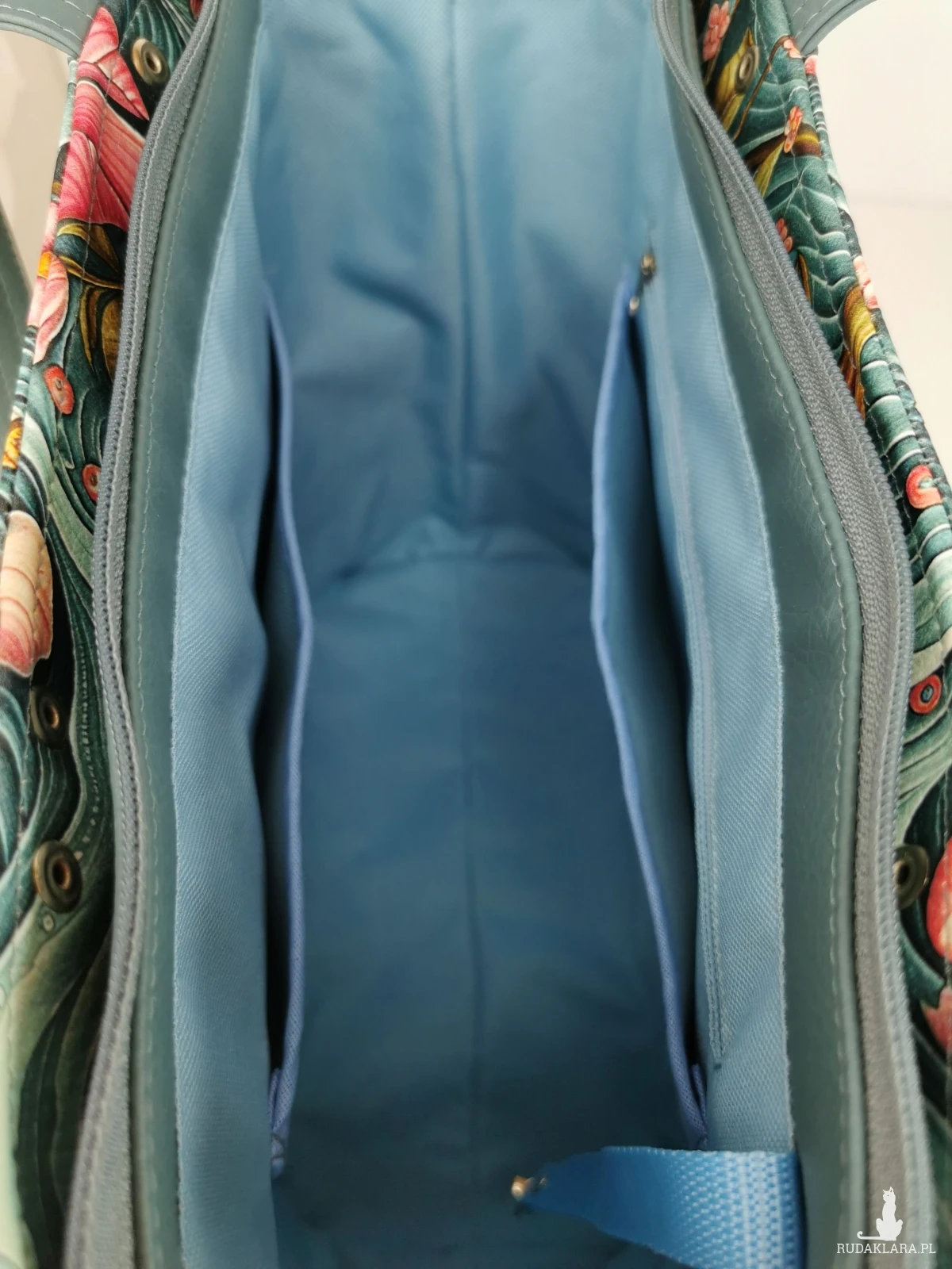 Torebka typu shopper bag duża , pakowna . Idealna na co dzień , na spacer , na zakupy , do pracy lub na wyjazd . Została wykonana z grubej wzorzystej ekoskóry kaletniczej . Jest zamykana na zamek . Na tylnej ścianie torebki pojemna kieszeń zamykana na zamek . Podszewka z tkaniny poliestrowej wodoodpornej w kolorze jasno niebieskim . Wewnątrz znajdziesz trzy pojemne kieszenie , w tym jedna na zamek . Jest też zamontowana smycz z karabińczykiem na klucze . Uchwyty torebki wzmocnione nitami .