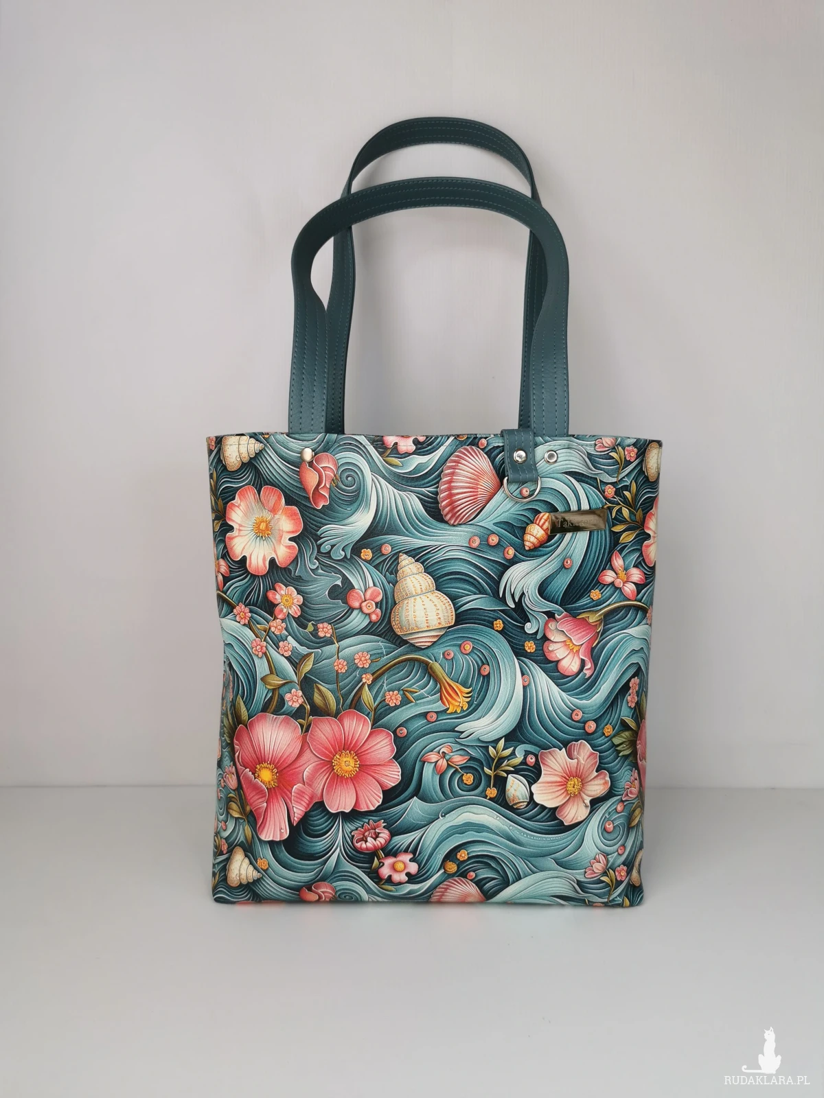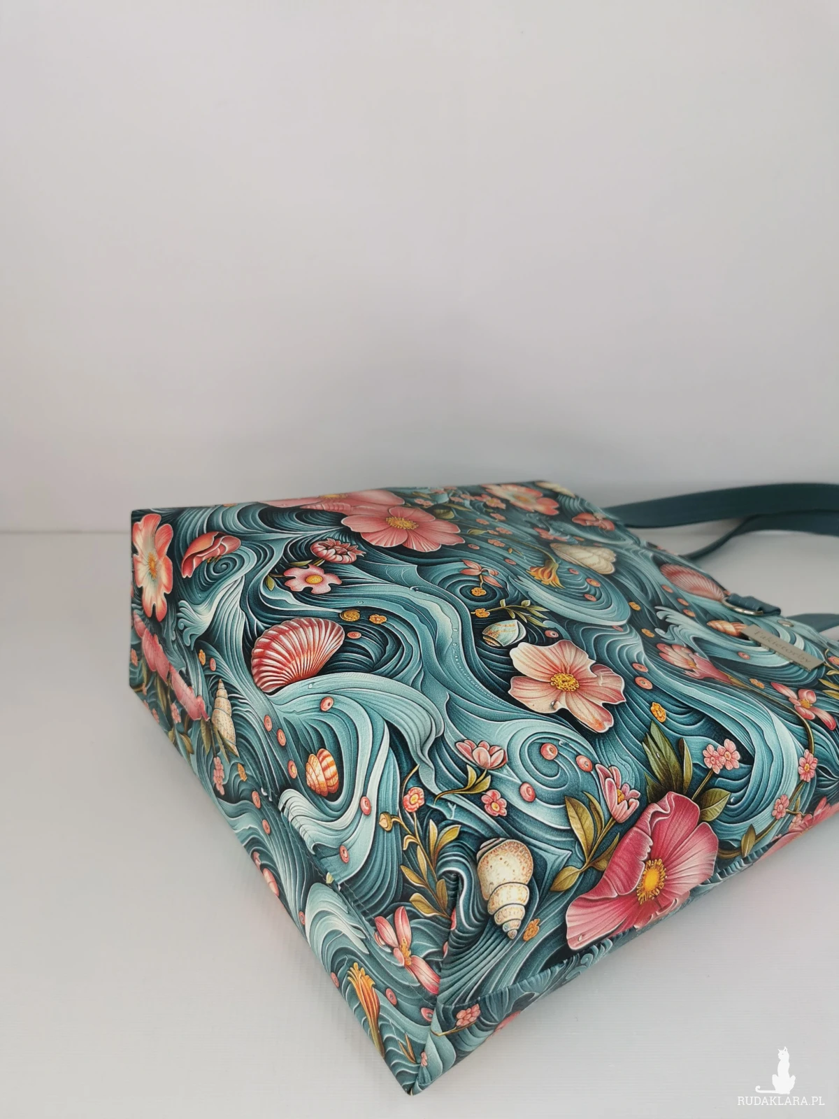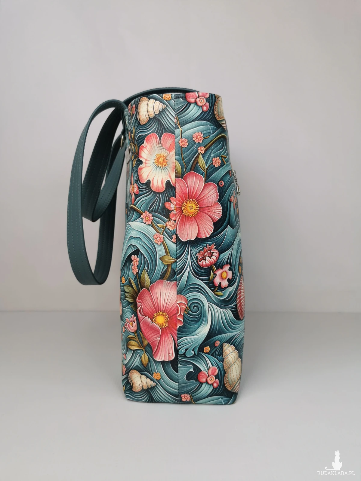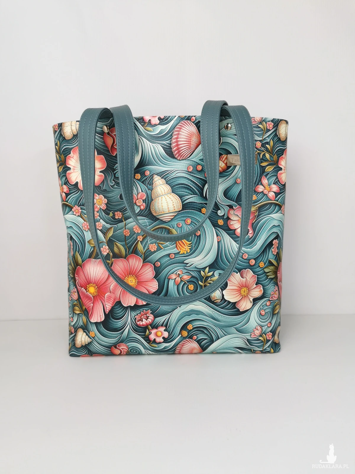 Torebka typu shopper bag duża , pakowna . Idealna na co dzień , na spacer , na zakupy , do pracy lub na wyjazd . Została wykonana z grubej wzorzystej ekoskóry kaletniczej . Jest zamykana na zamek . Na tylnej ścianie torebki pojemna kieszeń zamykana na zamek . Podszewka z tkaniny poliestrowej wodoodpornej w kolorze jasno niebieskim . Wewnątrz znajdziesz trzy pojemne kieszenie , w tym jedna na zamek . Jest też zamontowana smycz z karabińczykiem na klucze . Uchwyty torebki wzmocnione nitami .