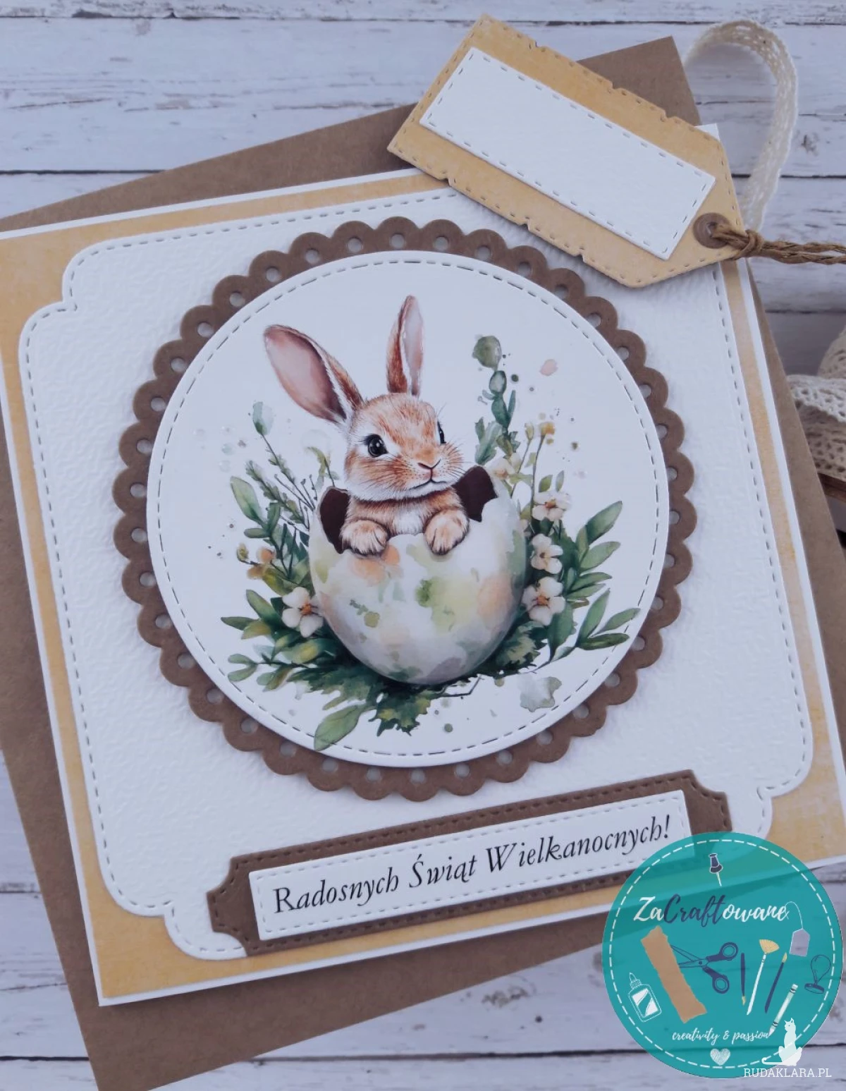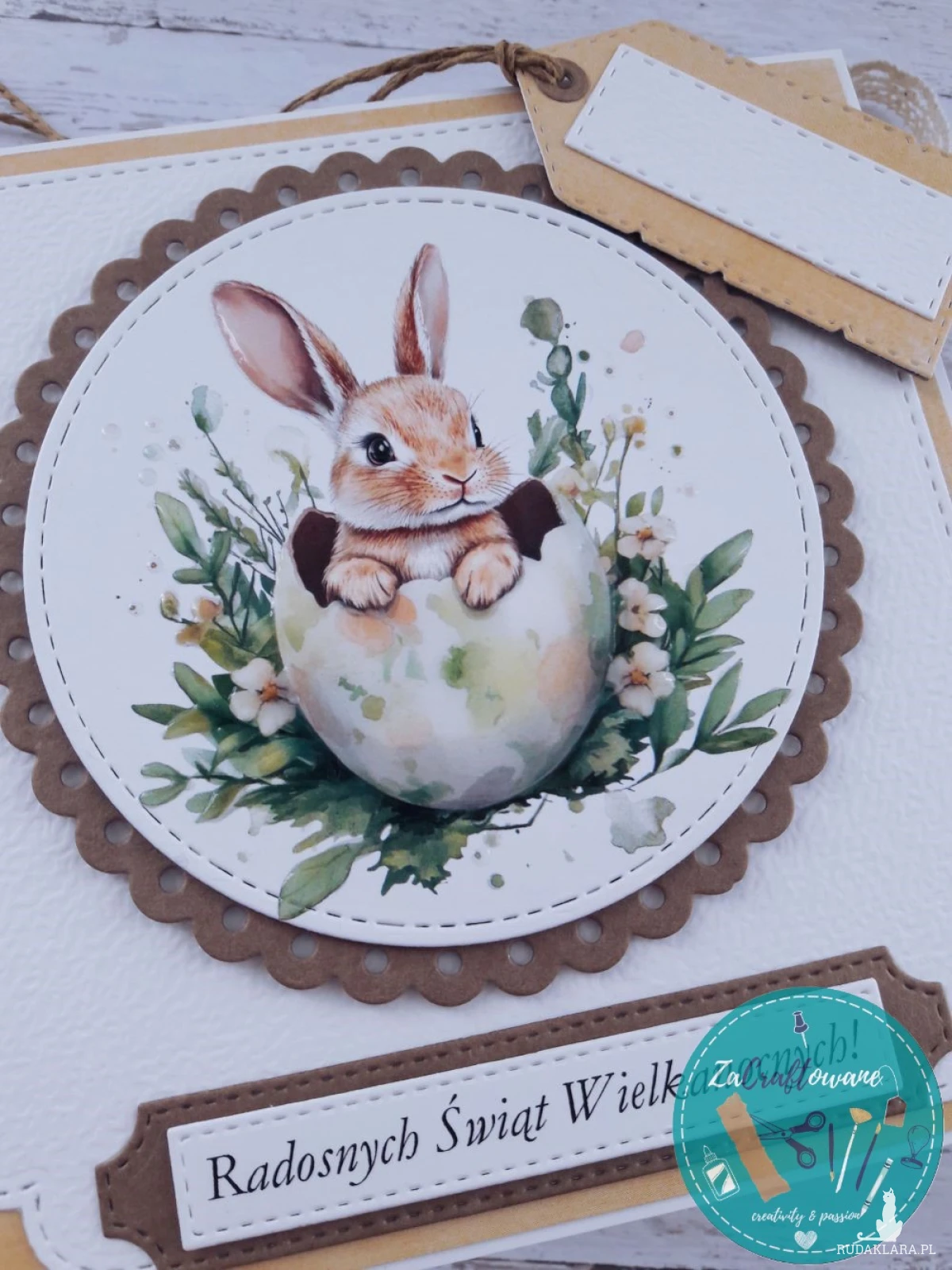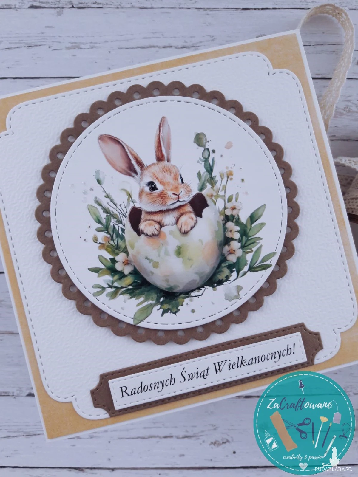 Ręcznie robiona kartka wielkanocna z uroczym króliczkiem wykonana metodą scrapbookingu, z dbałością o każdy szczegół.
