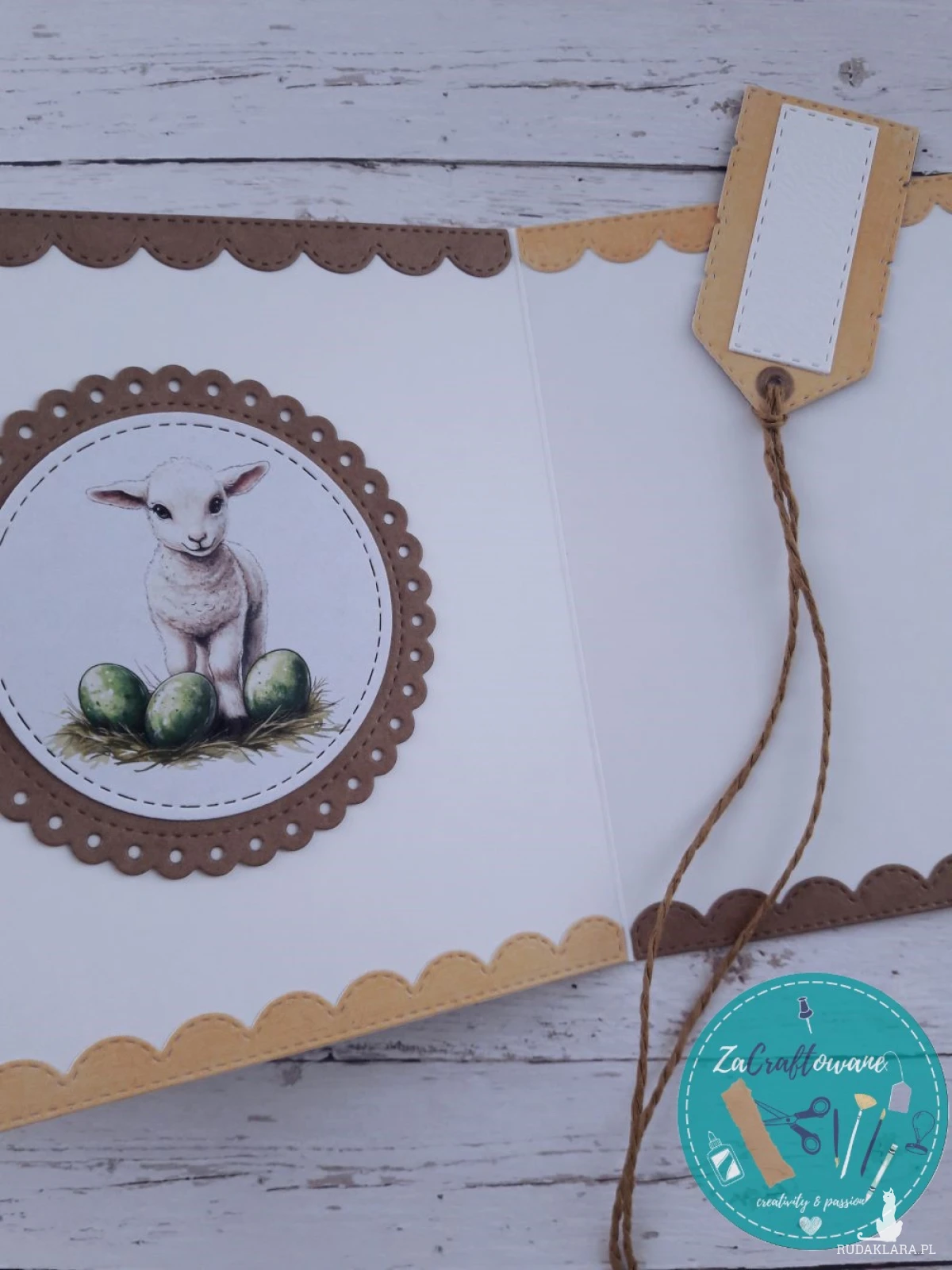 Do kartki dołączam również GRATIS w postaci widocznej na zdjęciu etykietki, na której można wypisać imię osoby obdarowywanej wielkanocnym prezentem i przyczepić ją np. do wstążki, którą obwiązany jest upominek, za pomocą sznureczka, który również znajduje się w zestawie.