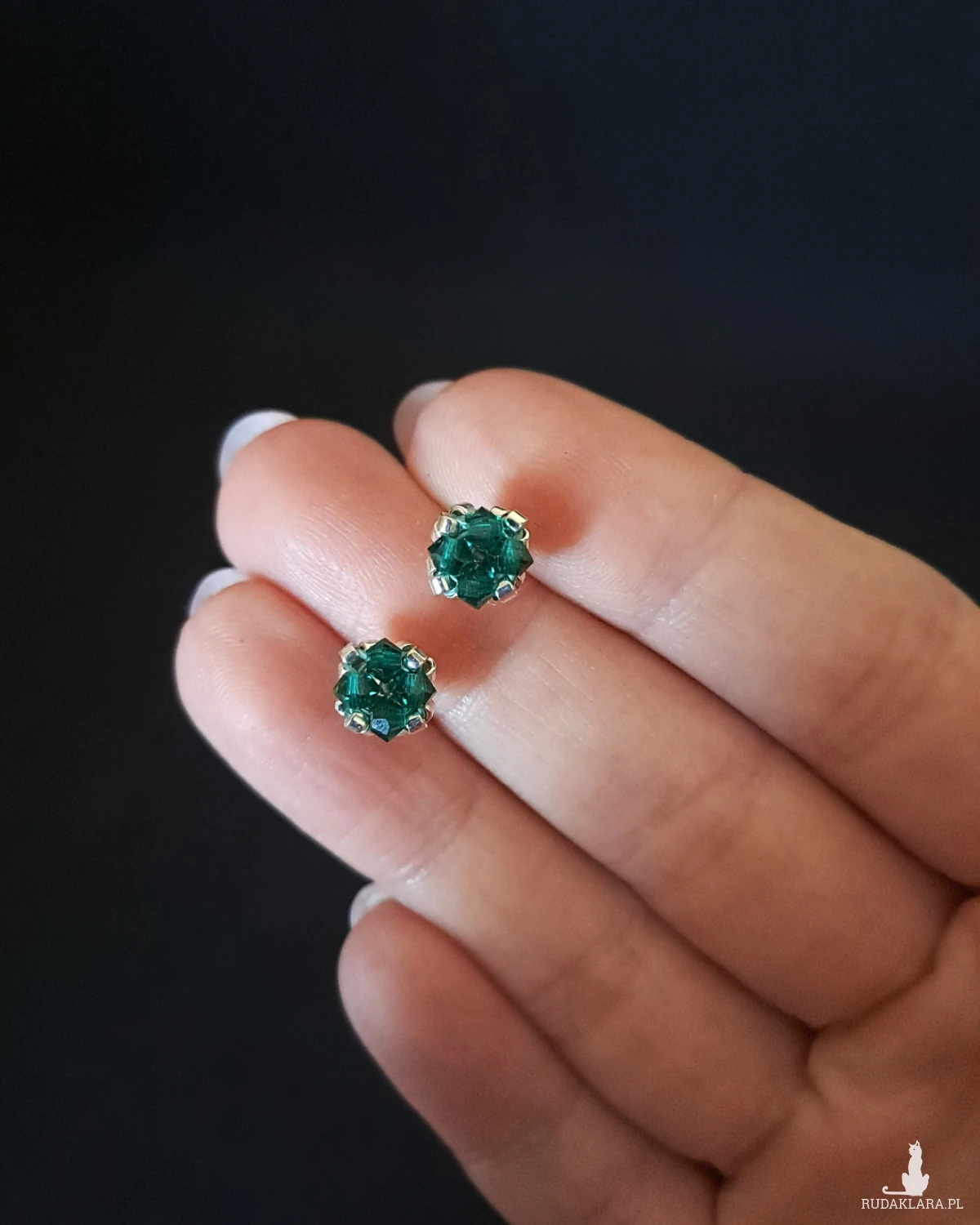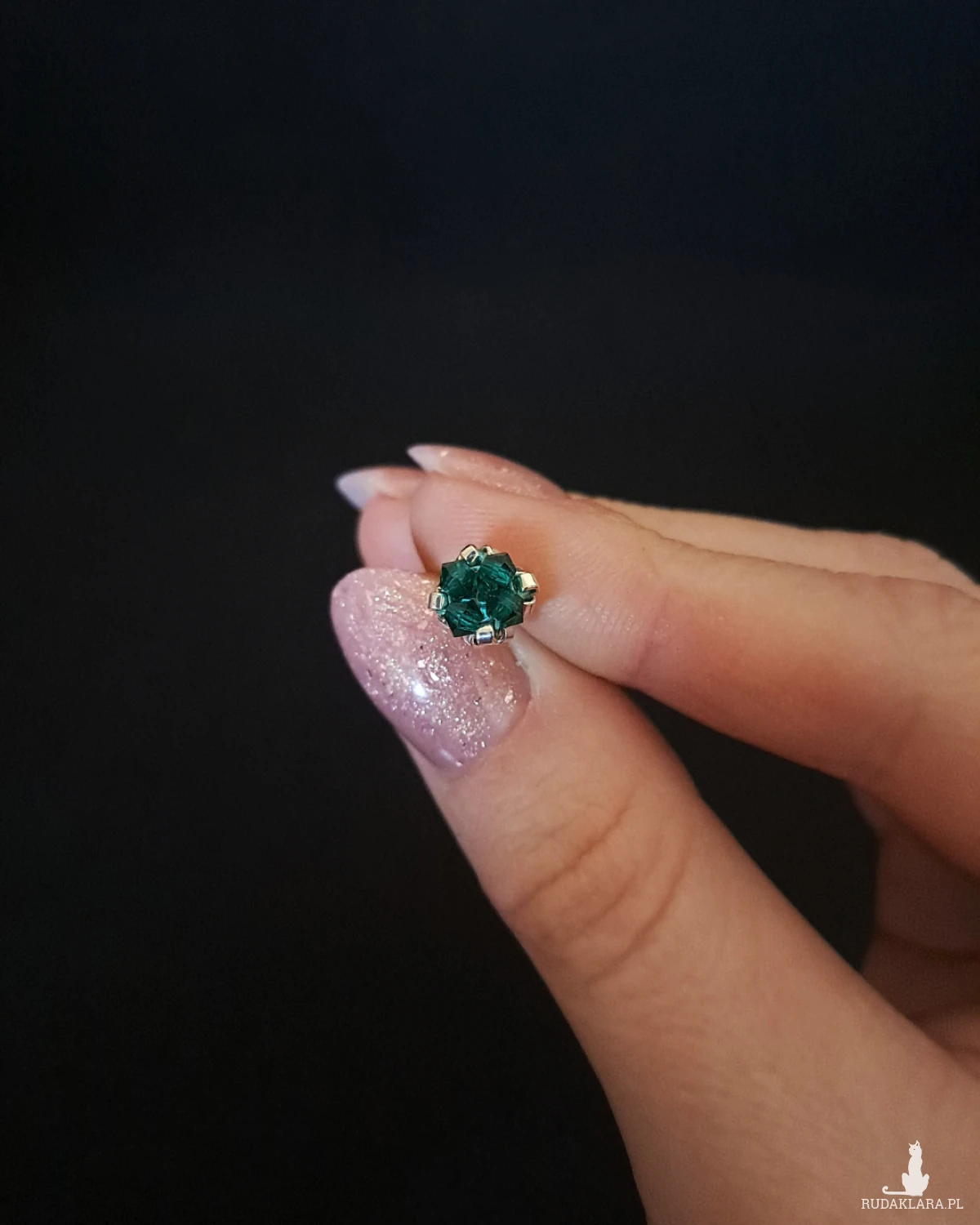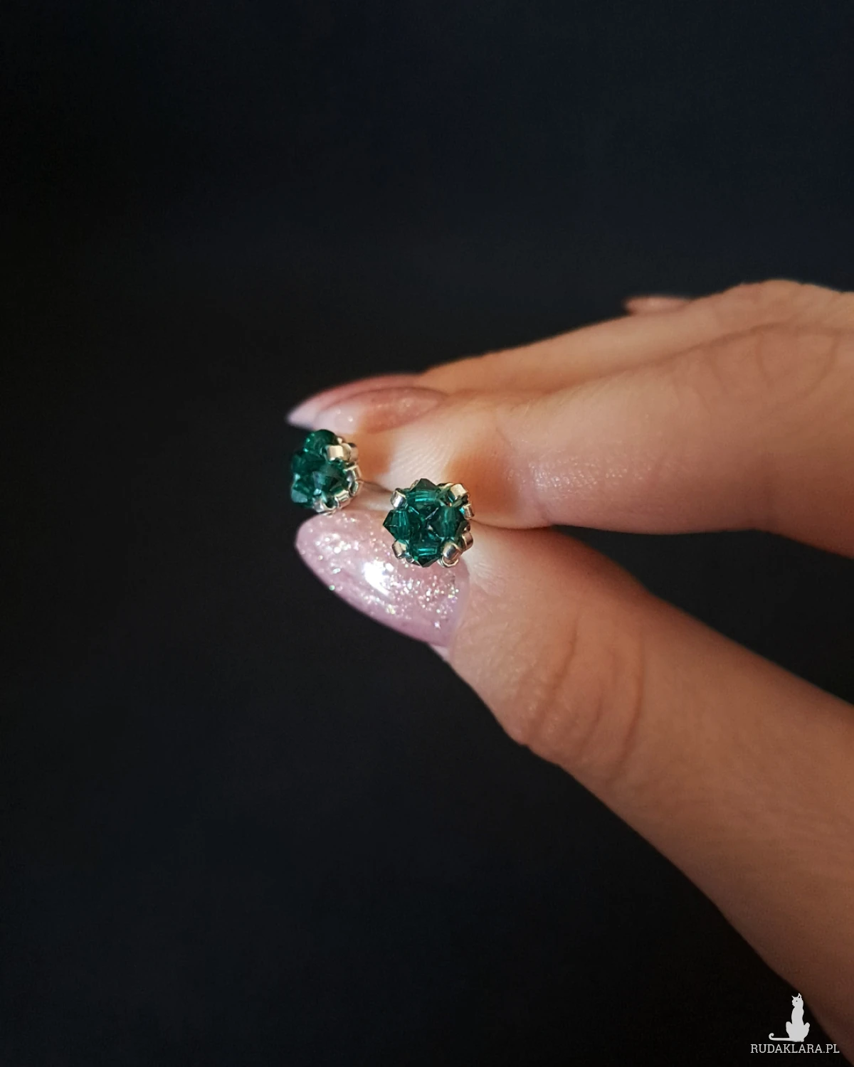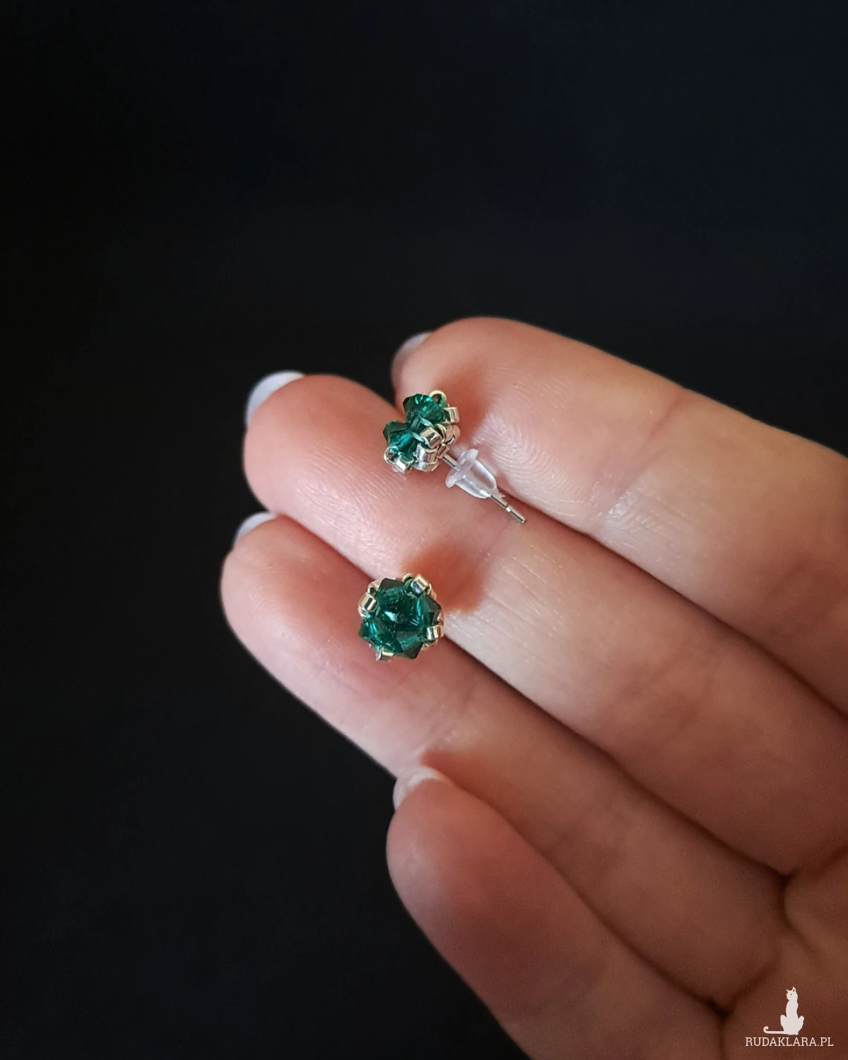 Te kolczyki to efekt precyzyjnej, ręcznej pracy. Misternie oplecione maleńkie kryształki w odcieniu głębokiej zieleni przywołują skojarzenia z kroplami rosy na liściach. Drobne, srebrzyste koraliki tworzą harmonijną oprawę, sprawiając, że kolczyki emanują subtelną elegancją. Dzięki starannemu wykonaniu są niezwykle trwałe, a ich lekkość sprawia, że niemal zapomnisz, że masz je na sobie.