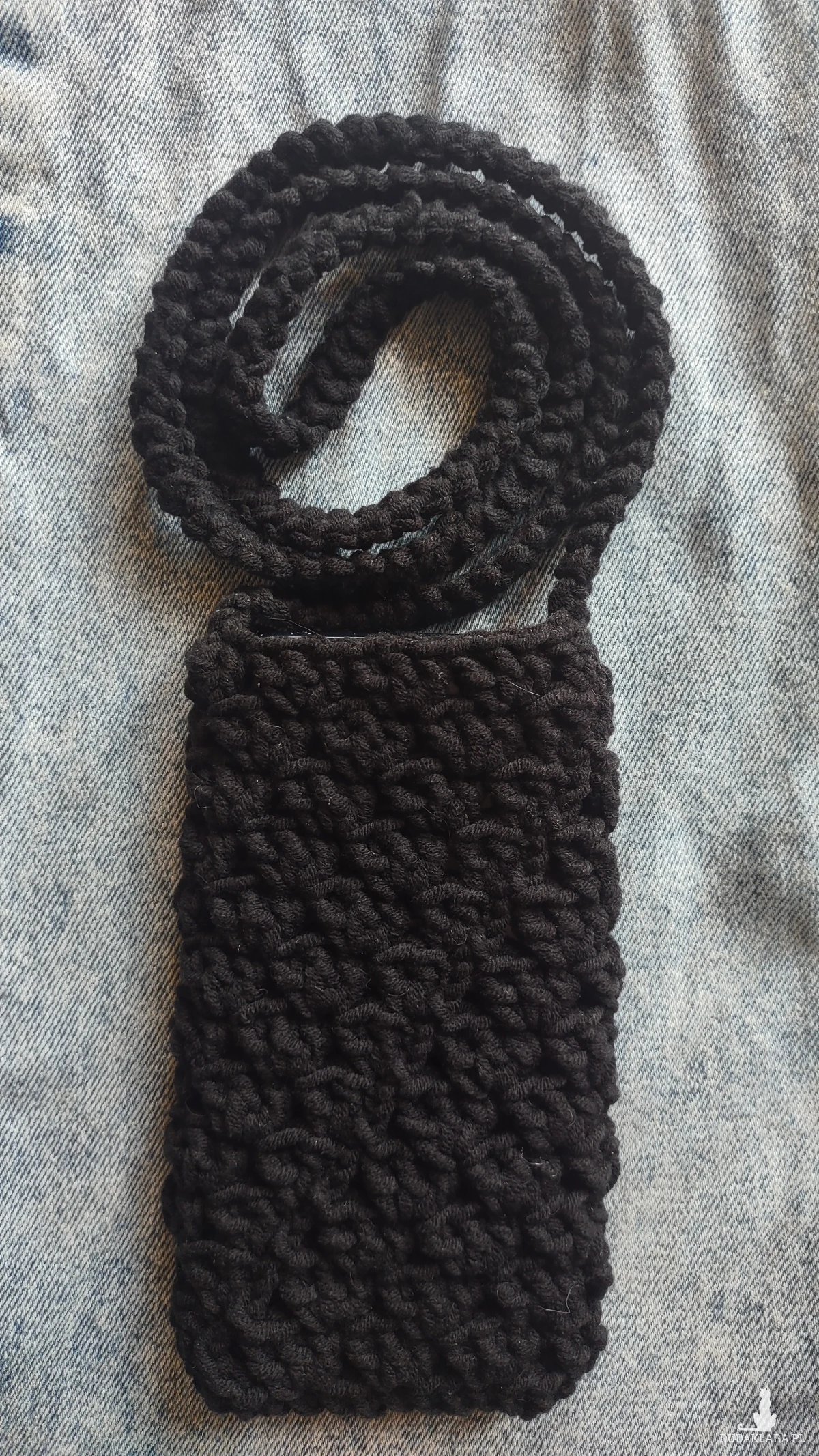Szydełkowy pokrowiec na telefon z mocnym paskiem.