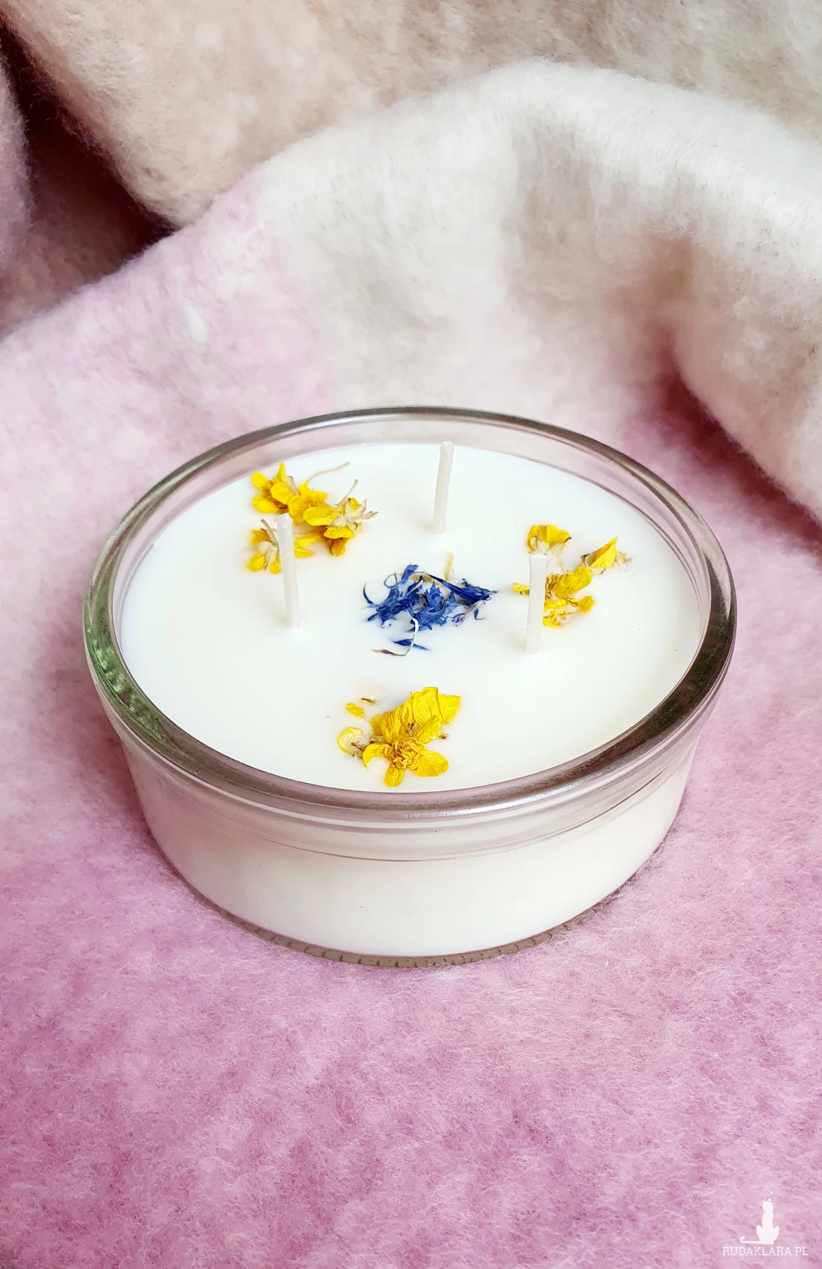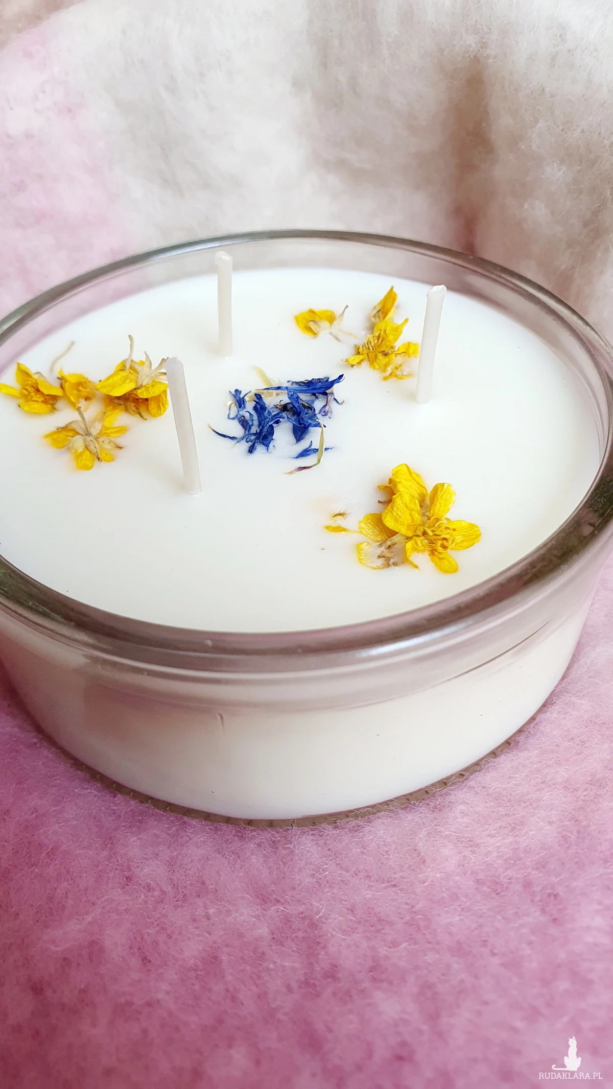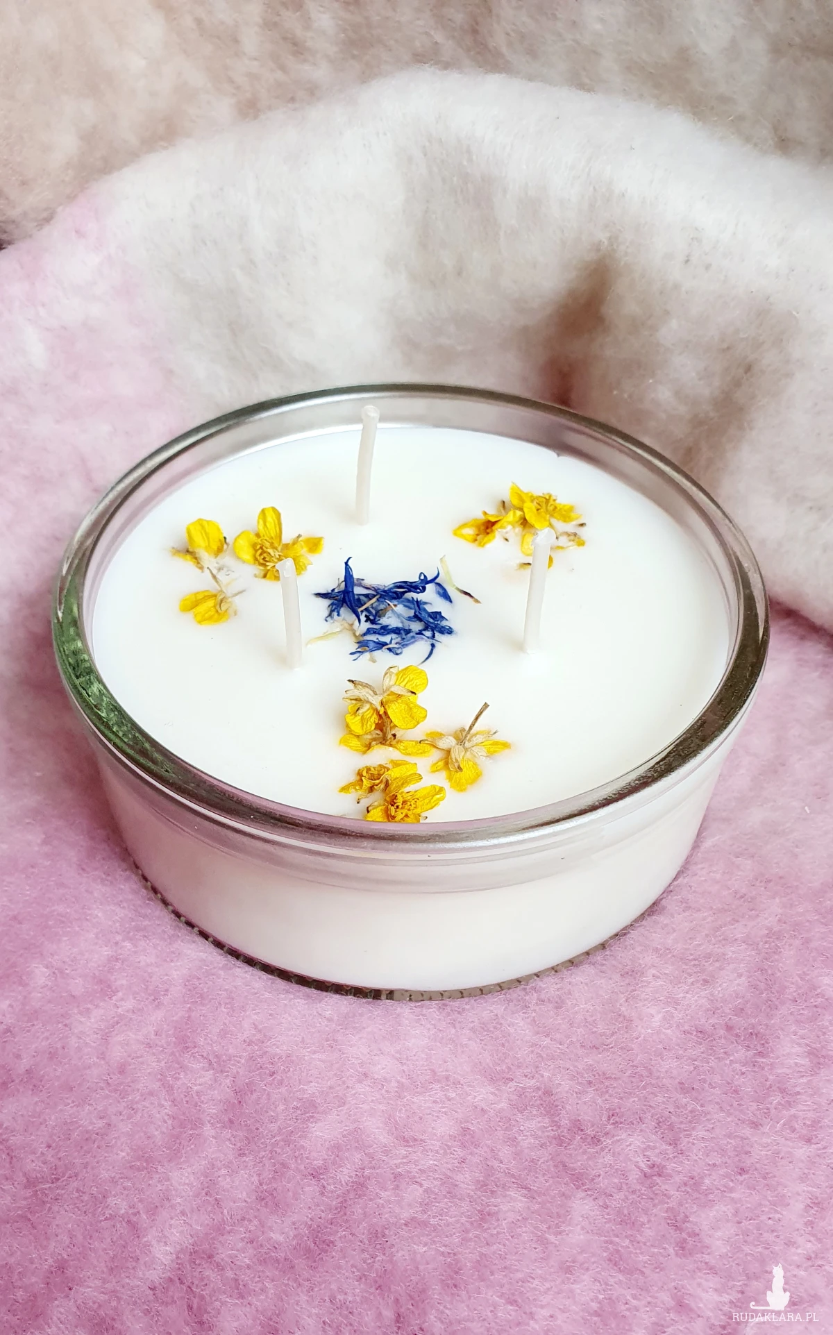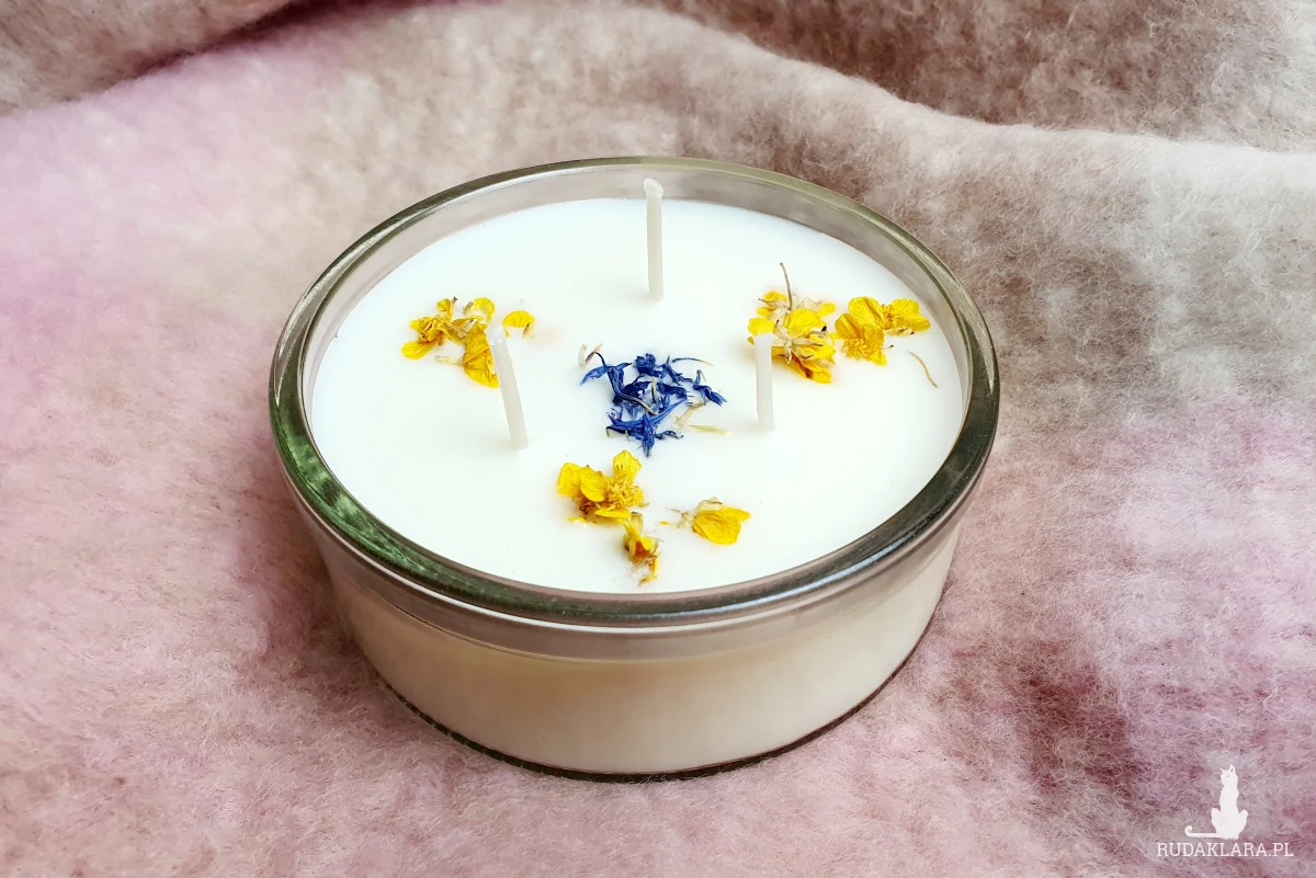 Świeca sojowa wykonana ze 100% wosku sojowego z dodatkiem naturalnego olejku o zapachu świąt (cynamon, pomarańcza, goździki, wanilia), udekorowana jaskrem i niebieskim bławatkiem. Lekkie nierówności na wierzchu świecy świadczą o własnoręcznym jej wykonaniu.