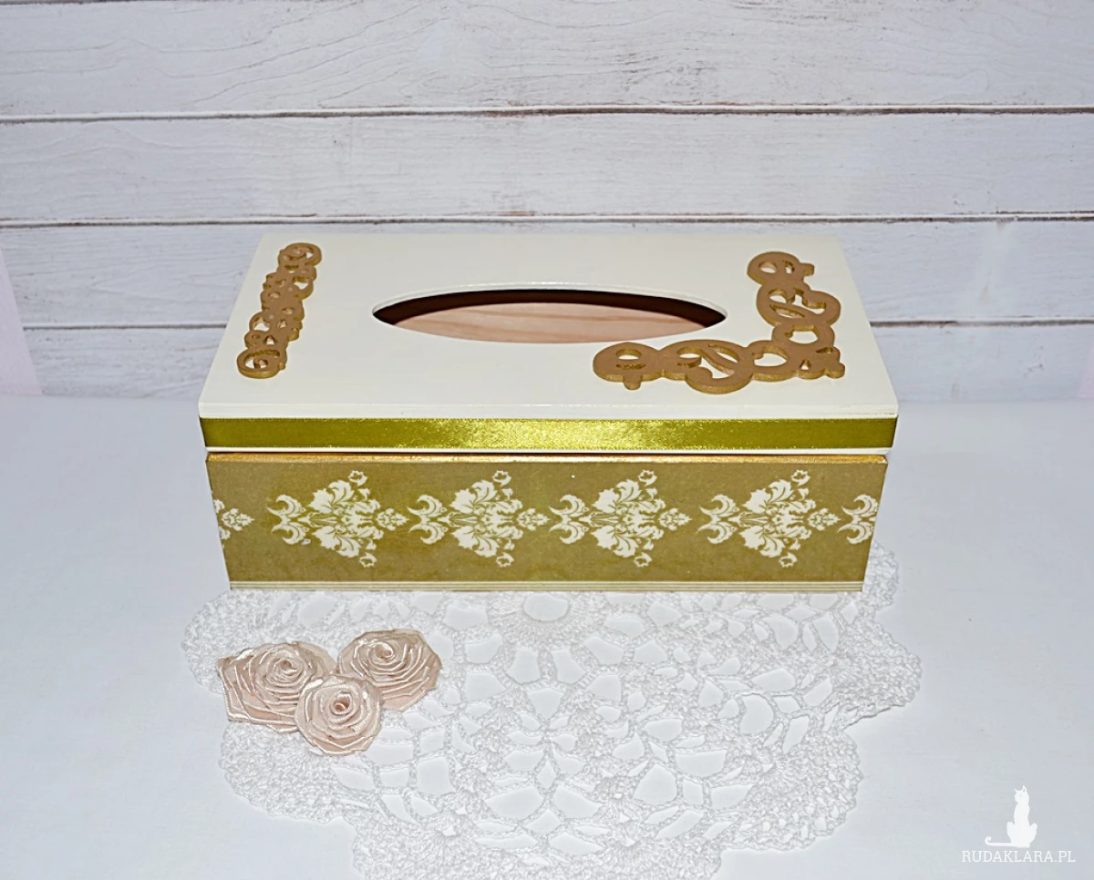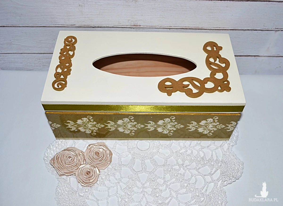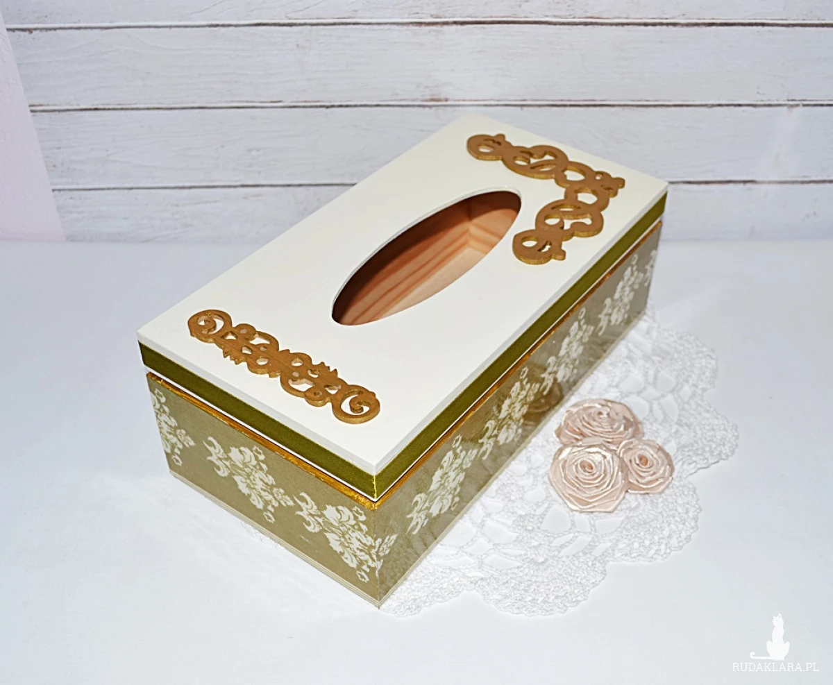 Oryginalny drewniany chustecznik w kolorach brązu i zieleni zdobiony metodą decoupage. Chustecznik jest zabezpieczony lakierem bezbarwnym