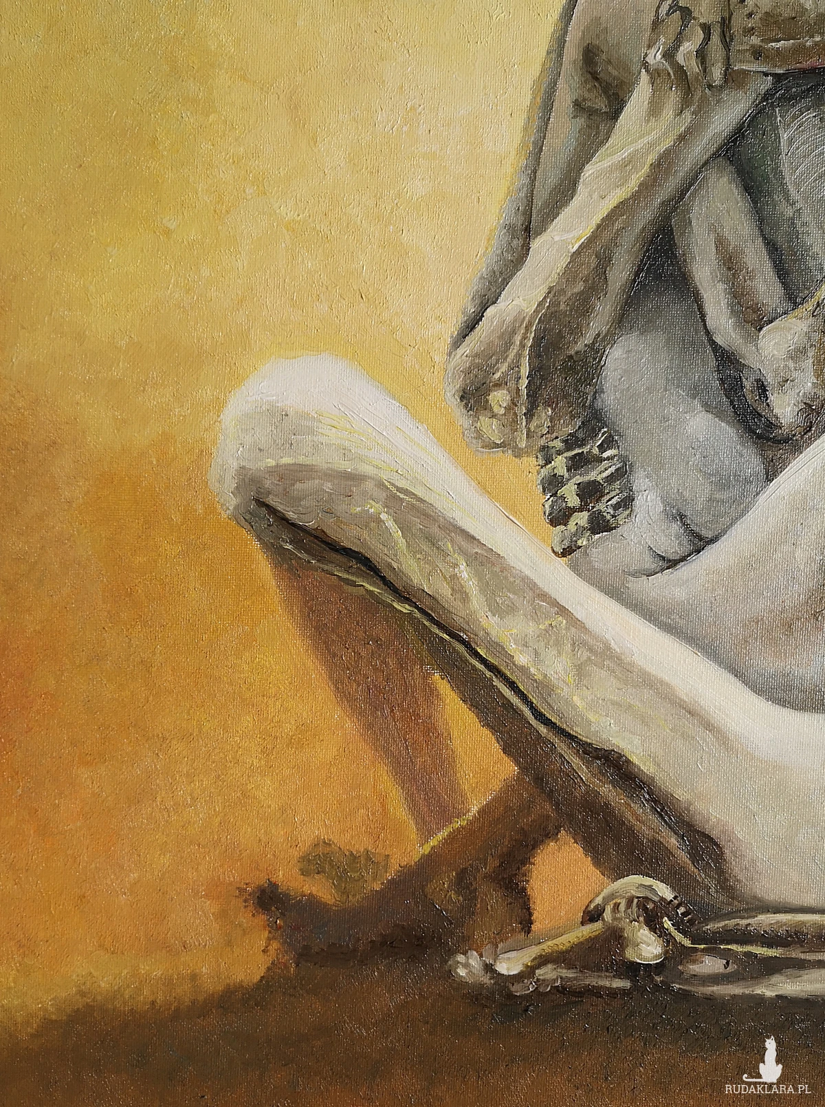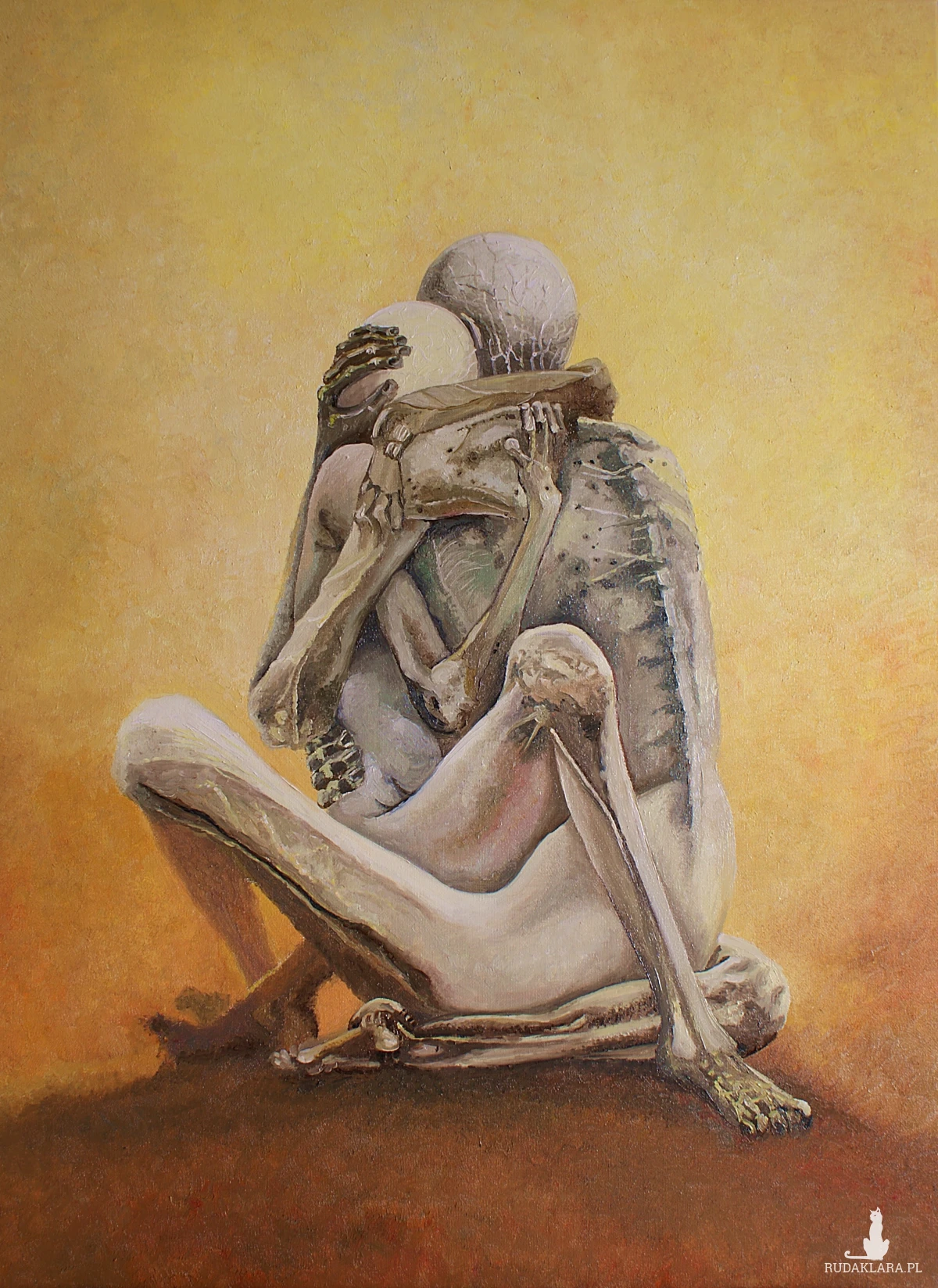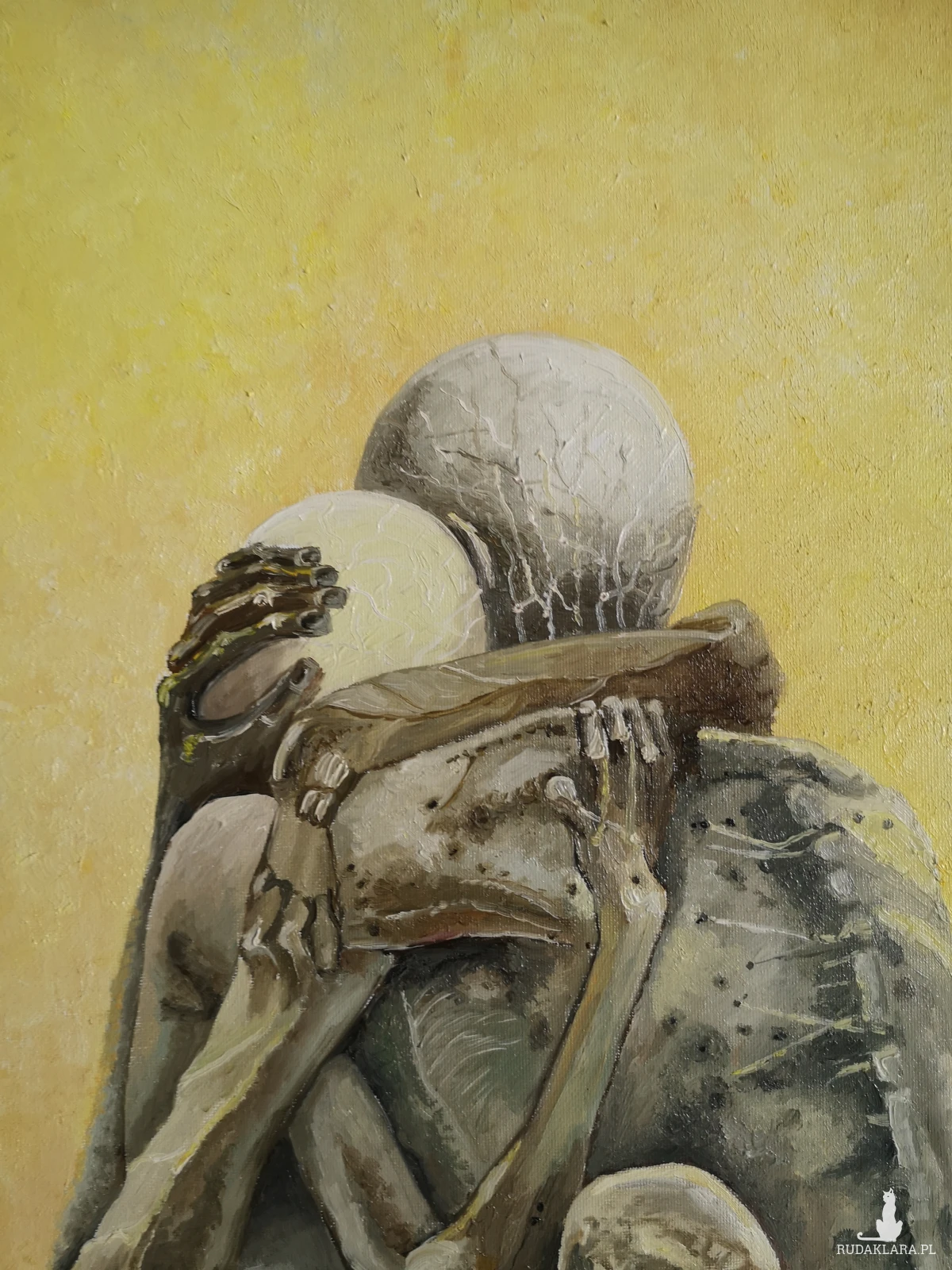 Atmosfera obrazu jest melancholijna, ale też pełna nadziei. Te figury, pomimo swojego odrealnionego wyglądu, mają w sobie coś niezwykle ludzkiego. Artysta wykorzystał delikatne pociągnięcia pędzla. Akcentuje cieniem i światłem, aby stworzyć iluzję ruchu i życia. Patrząc na ten obraz, można poczuć gamę emocji — od smutku po ciepłe przebłyski miłości i pokory. To dzieło zmusza do zastanowienia się nad naturą istnienia, kruchością życia oraz potęgą więzi międzyludzkich. Ja nie widzę tu śmierci, dostrzegam natomiast trwałość uczucia, wizja końca świata nie wydaje się tak tragiczna gdy jesteśmy z kimś kto nas rozumie