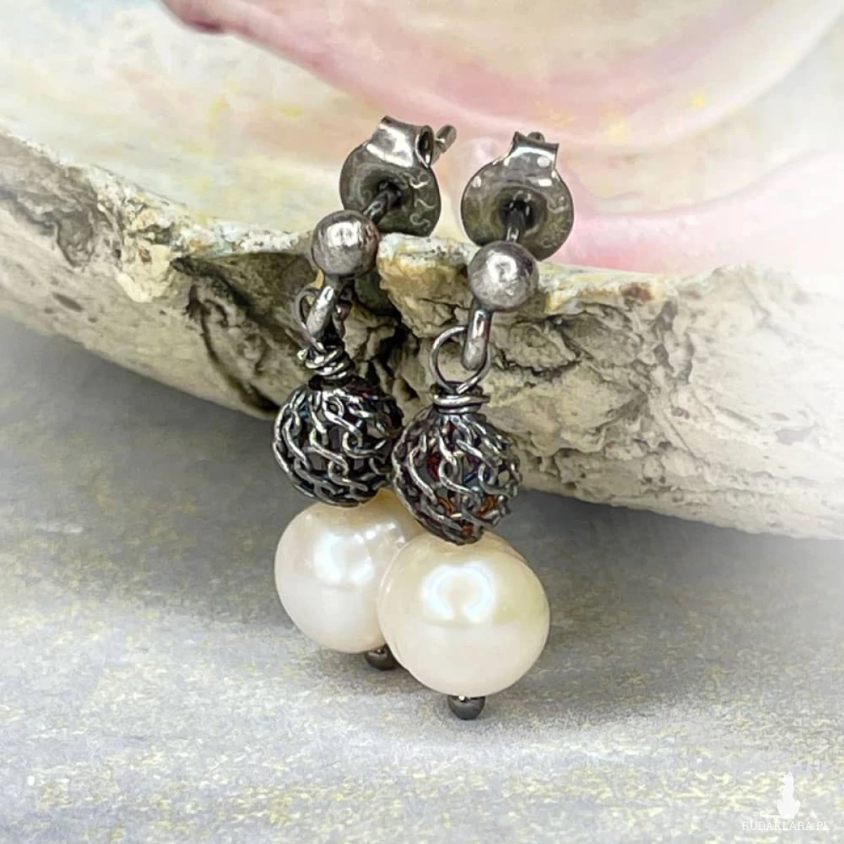 Kolczyki z naturalną perłą i czernionym srebrem to delikatna forma z charakterem – eleganckie, ale z nutą oryginalności. Klasyczna biel hodowanych pereł zyskuje wyjątkowe tło w postaci oksydowanego srebra i subtelnych ażurowych zdobień, które nadają całości lekko retro wyraz. Sztyfty w formie kuleczek podkreślają minimalistyczny styl, zachowując przy tym elegancję i finezję.